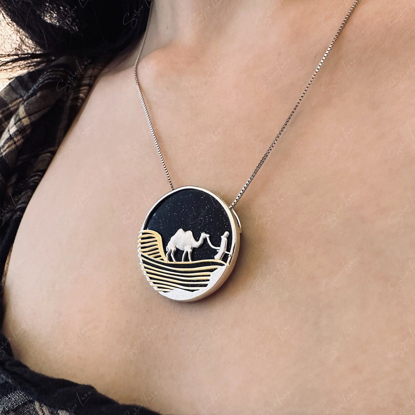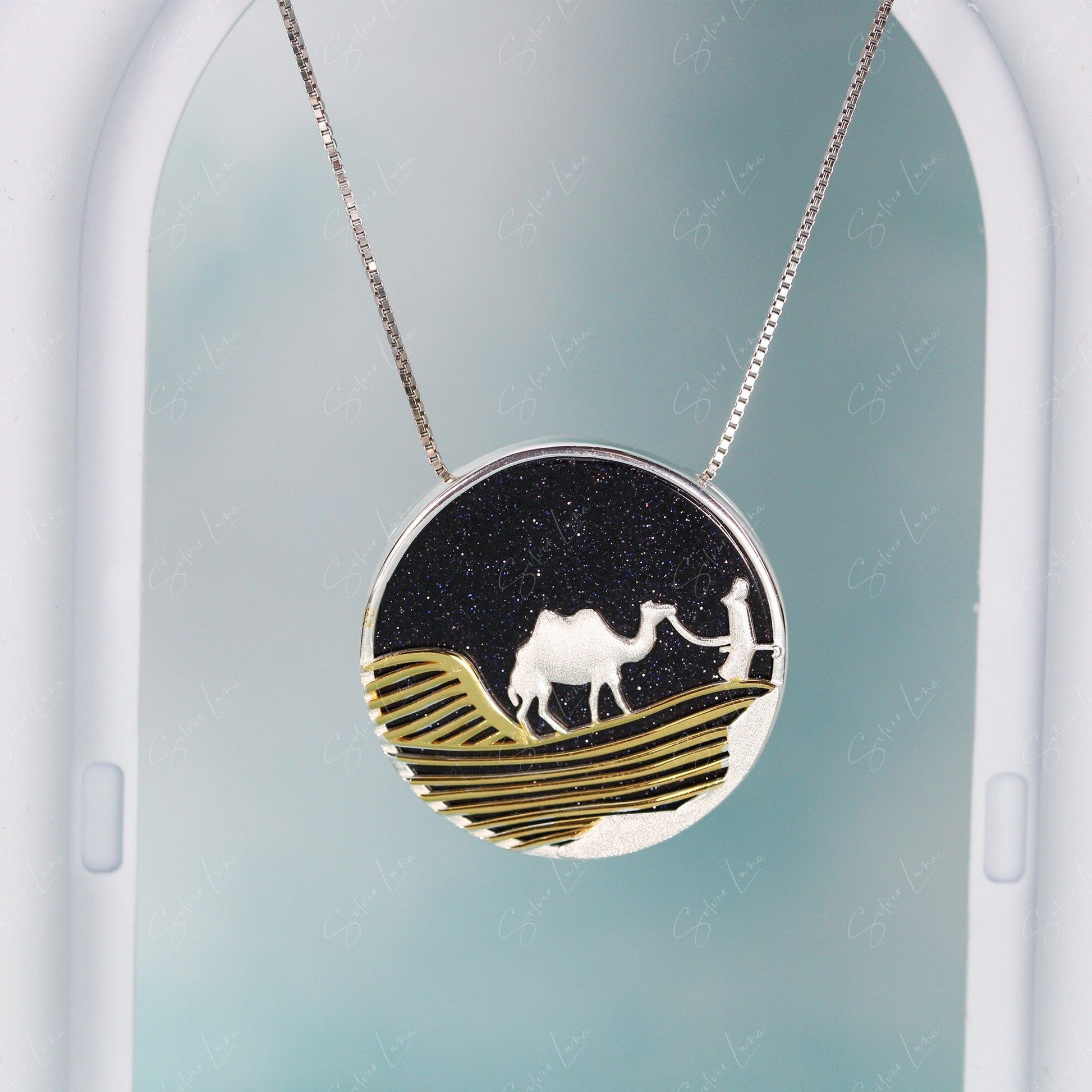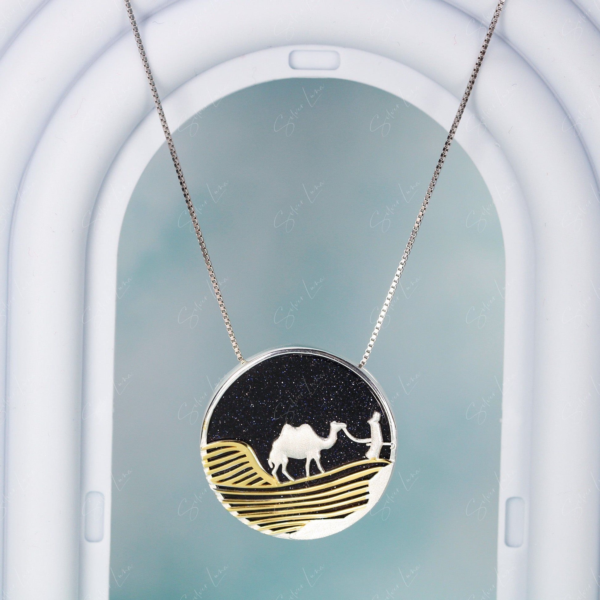 Embark on a journey with this blue sandstone pendant necklace, showcasing a stunning desert wanderer landscape captured in 925 sterling silver and gold plated design. The magnificent blue sand serves as the sky, encased in a sterling silver circle frame. A perfect addition to your fine jewelry collection or a memorable gift for a loved one.