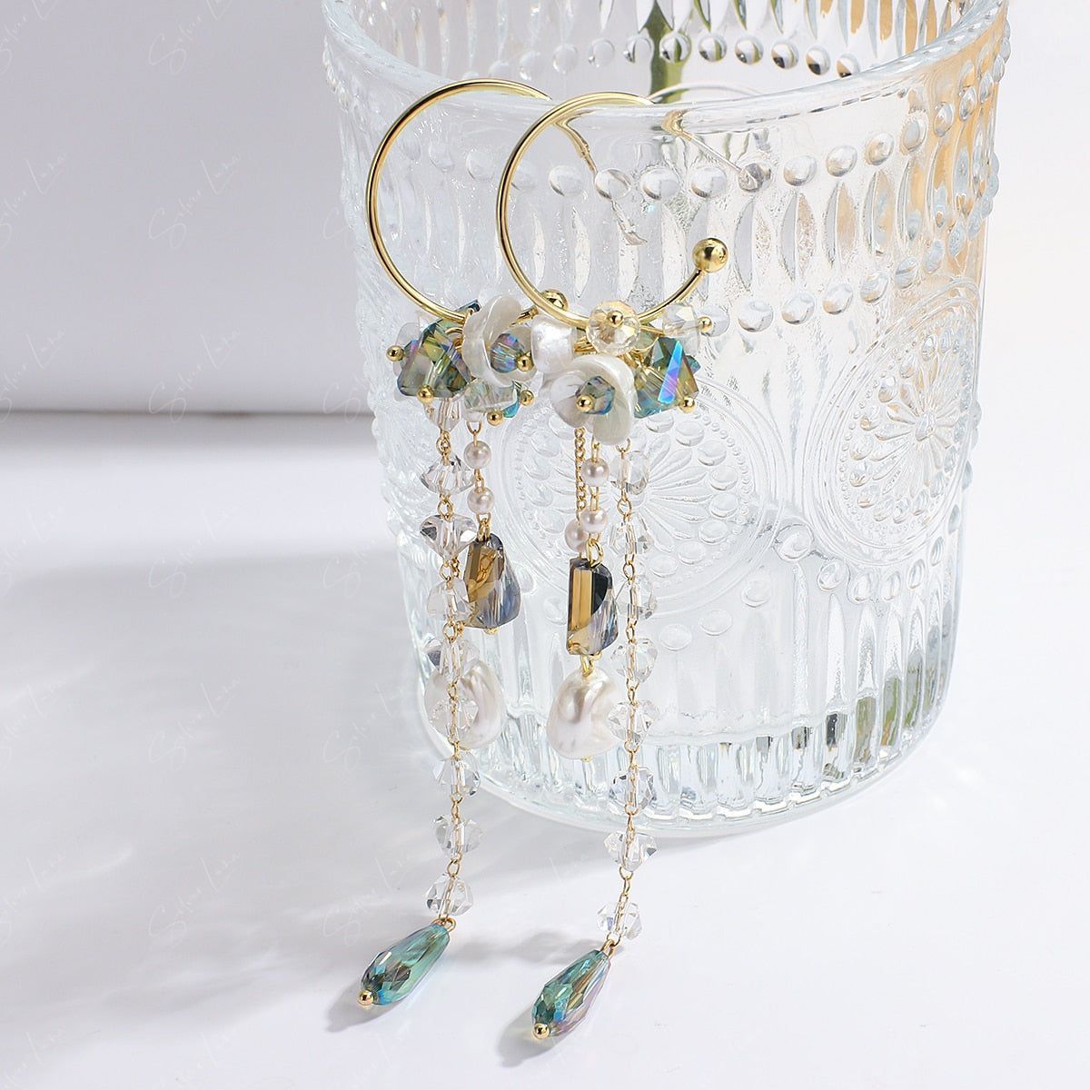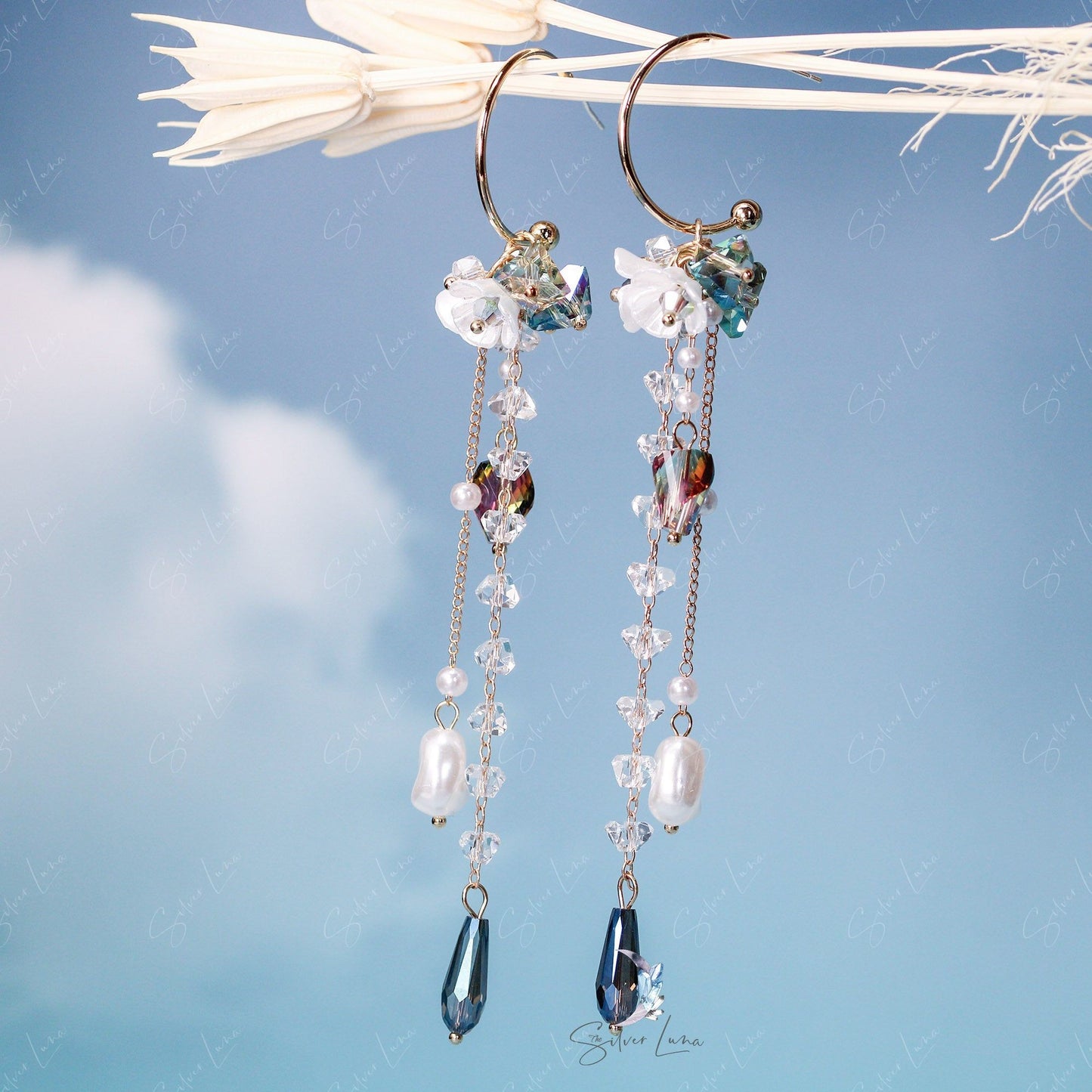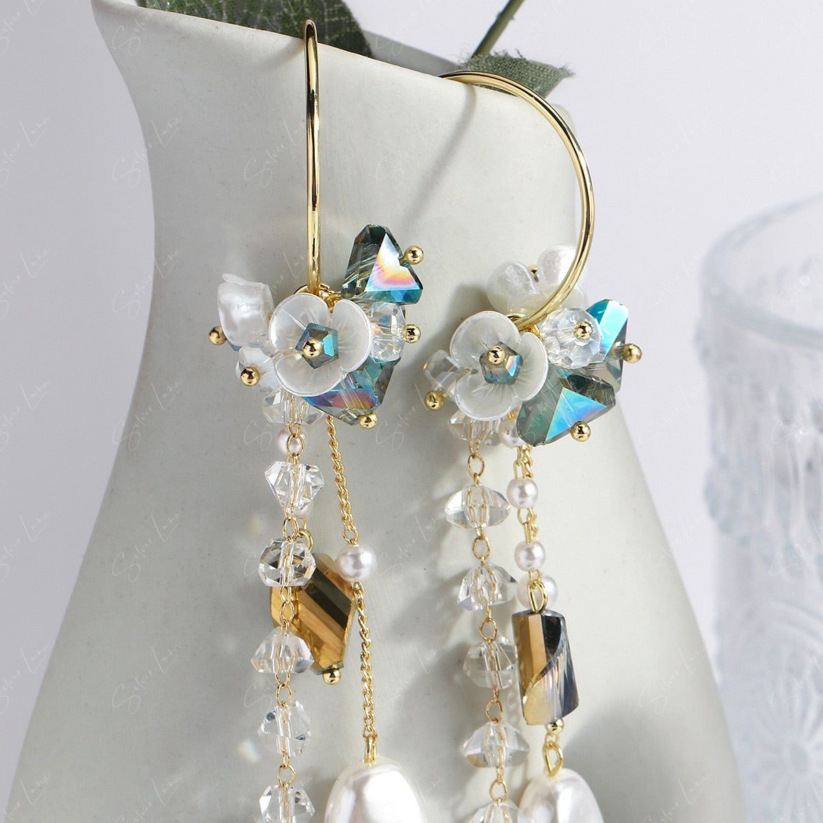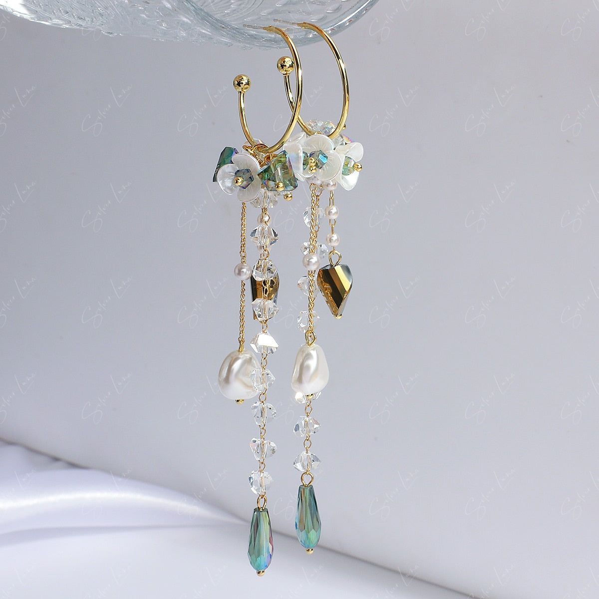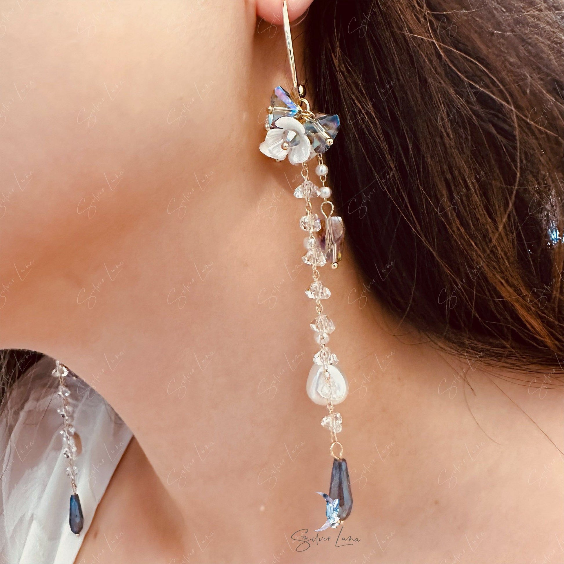 This elegant pearl drop earrings features long trail drop of crystal tear drop and artificial pearls, white flower on hoop stud closure. Add these elegant long drop crystal earrings to your everyday fashion earrings collection or as gift for your love one.