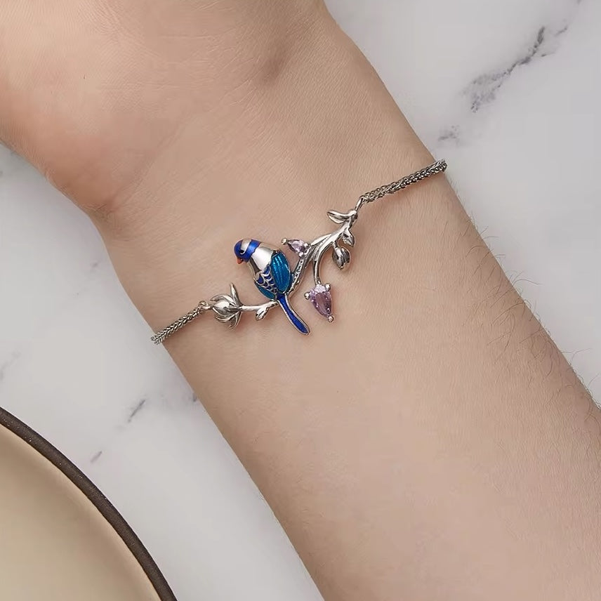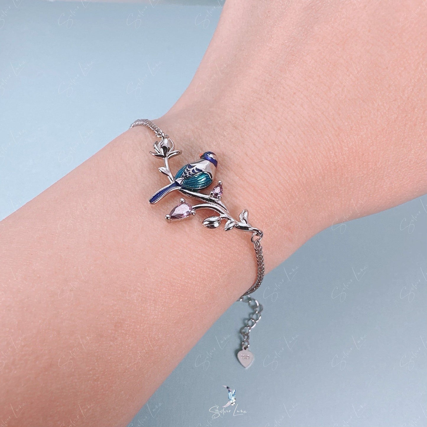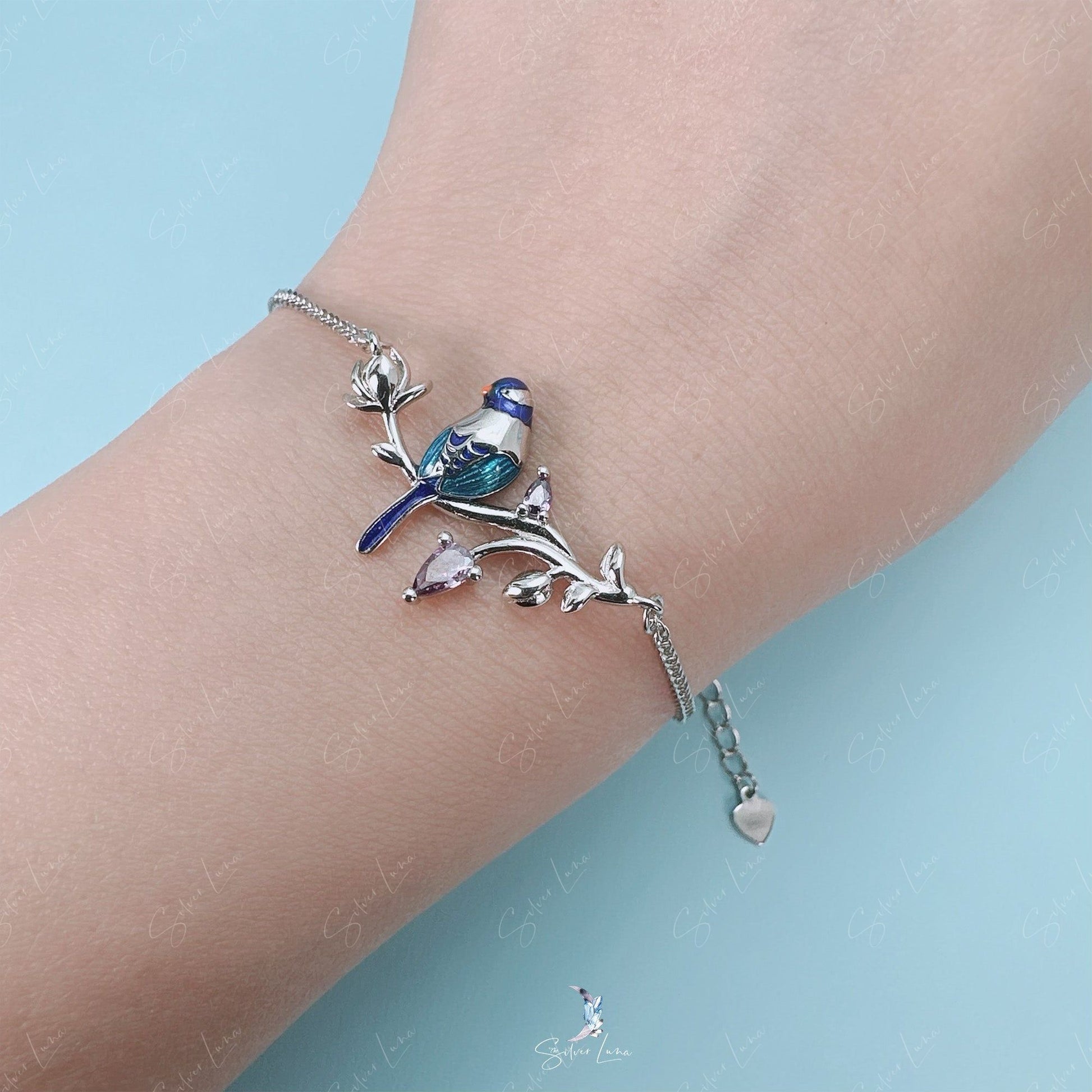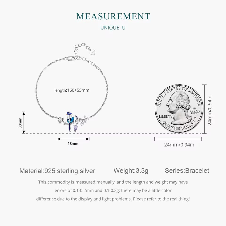 This stunning sterling silver bracelet showcases a charming mockingbird perched on a delicate floral branch with a pop of blue enamel. Crafted from durable 925 silver and coated in platinum for a luxurious finish that will last. Indulge in the beauty and elegance of this unique sterling silver bracelet. Adorned with a darling mockingbird and delicate floral details, it's a statement piece that radiates charm and sophistication. Made from high-quality 925 silver and coated in platinum, it's a durable and luxurious choice that will elevate any outfit.