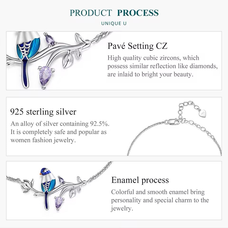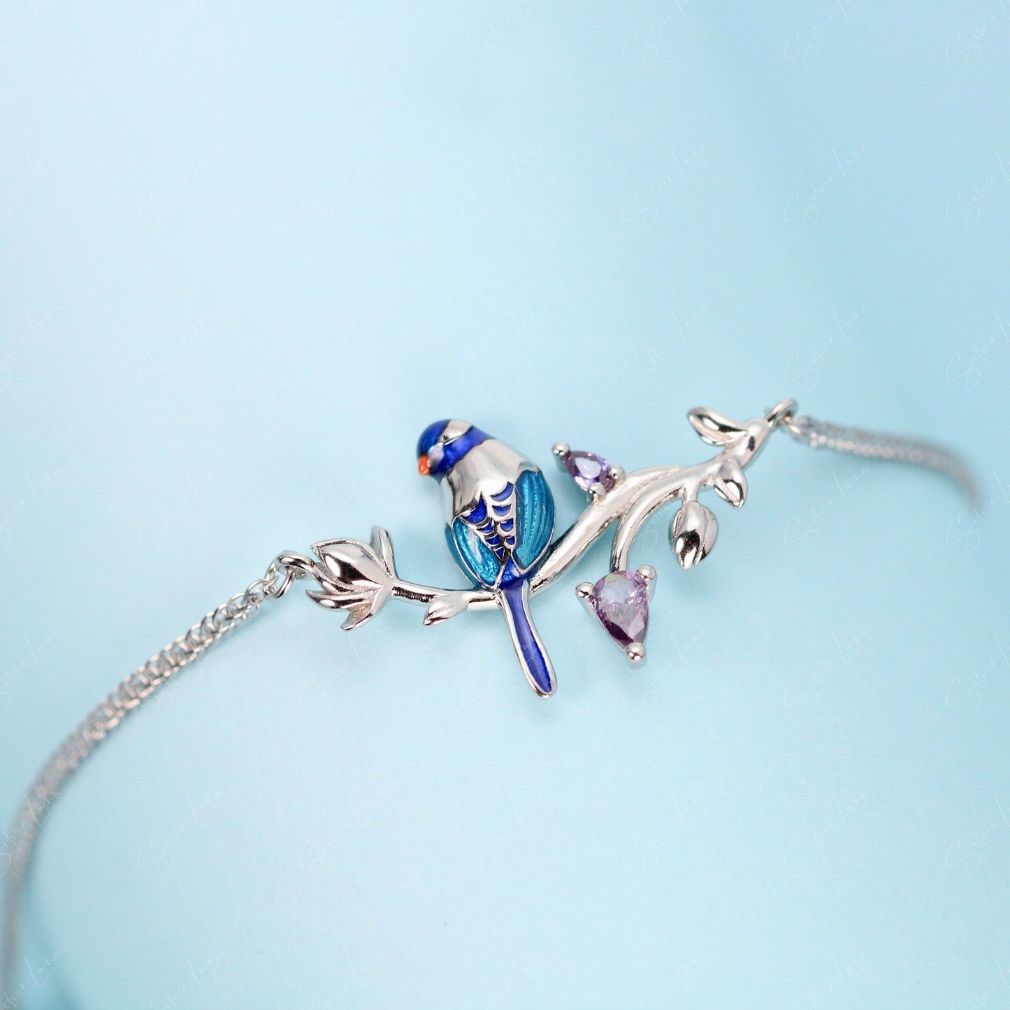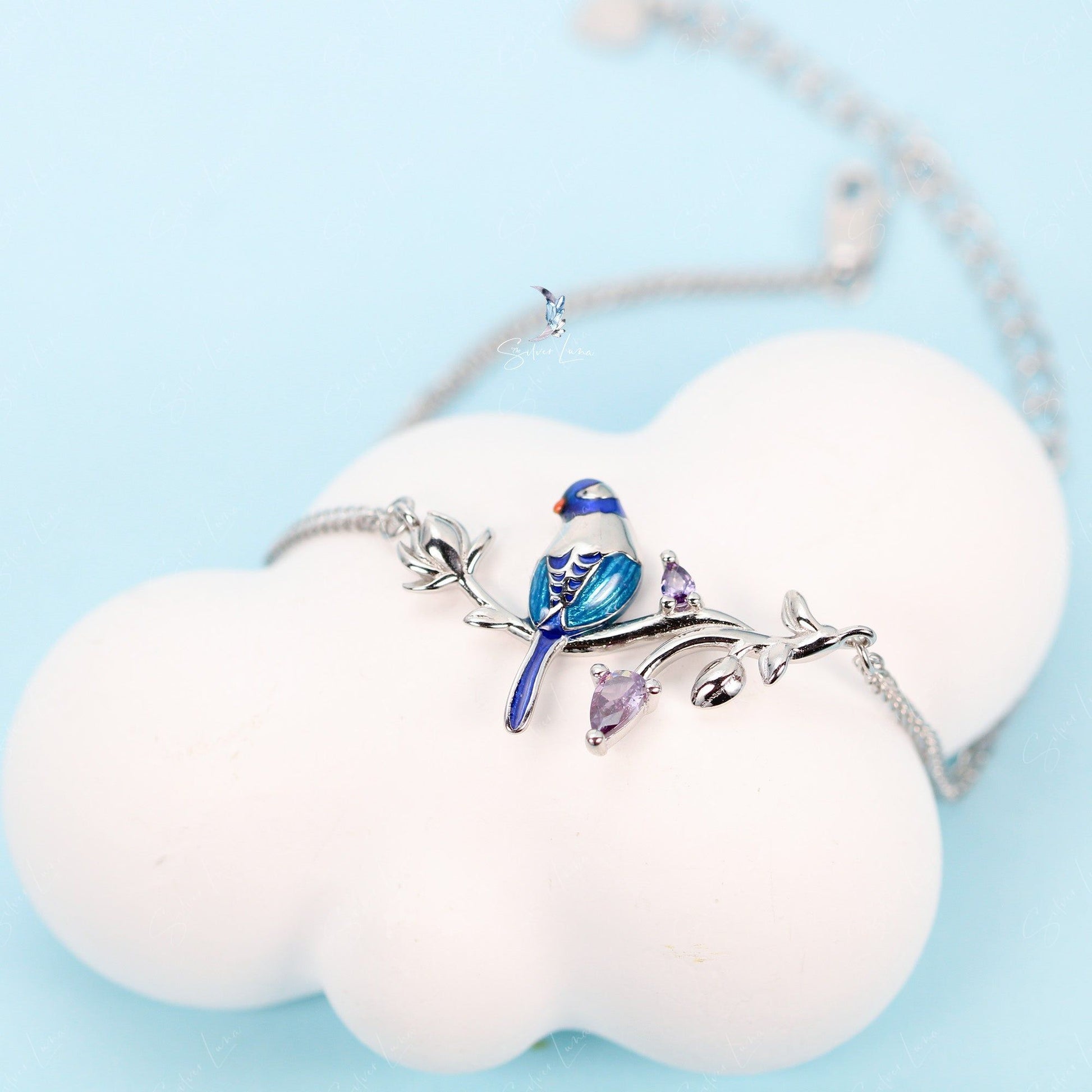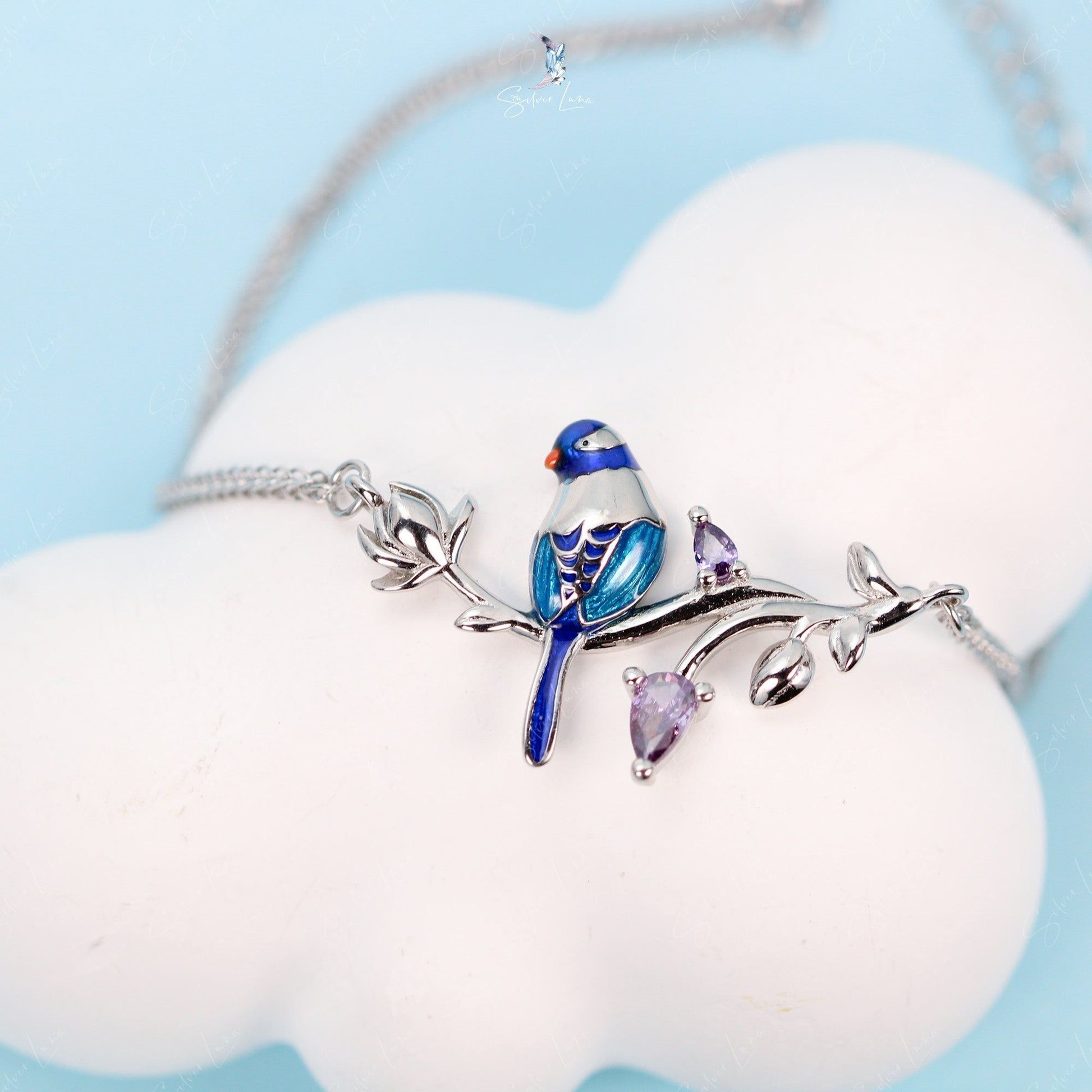 This stunning sterling silver bracelet showcases a charming mockingbird perched on a delicate floral branch with a pop of blue enamel. Crafted from durable 925 silver and coated in platinum for a luxurious finish that will last. Indulge in the beauty and elegance of this unique sterling silver bracelet. Adorned with a darling mockingbird and delicate floral details, it's a statement piece that radiates charm and sophistication. Made from high-quality 925 silver and coated in platinum, it's a durable and luxurious choice that will elevate any outfit.