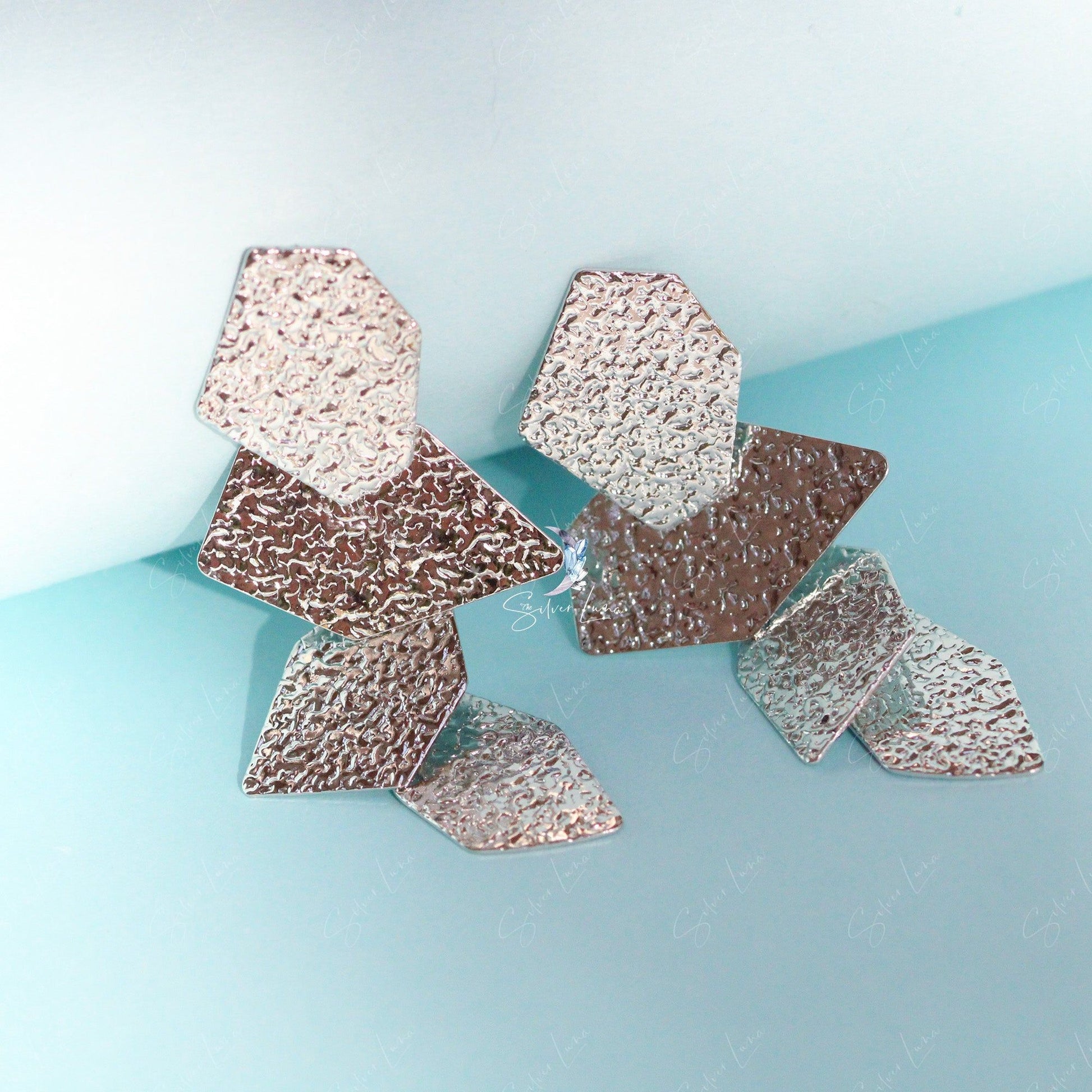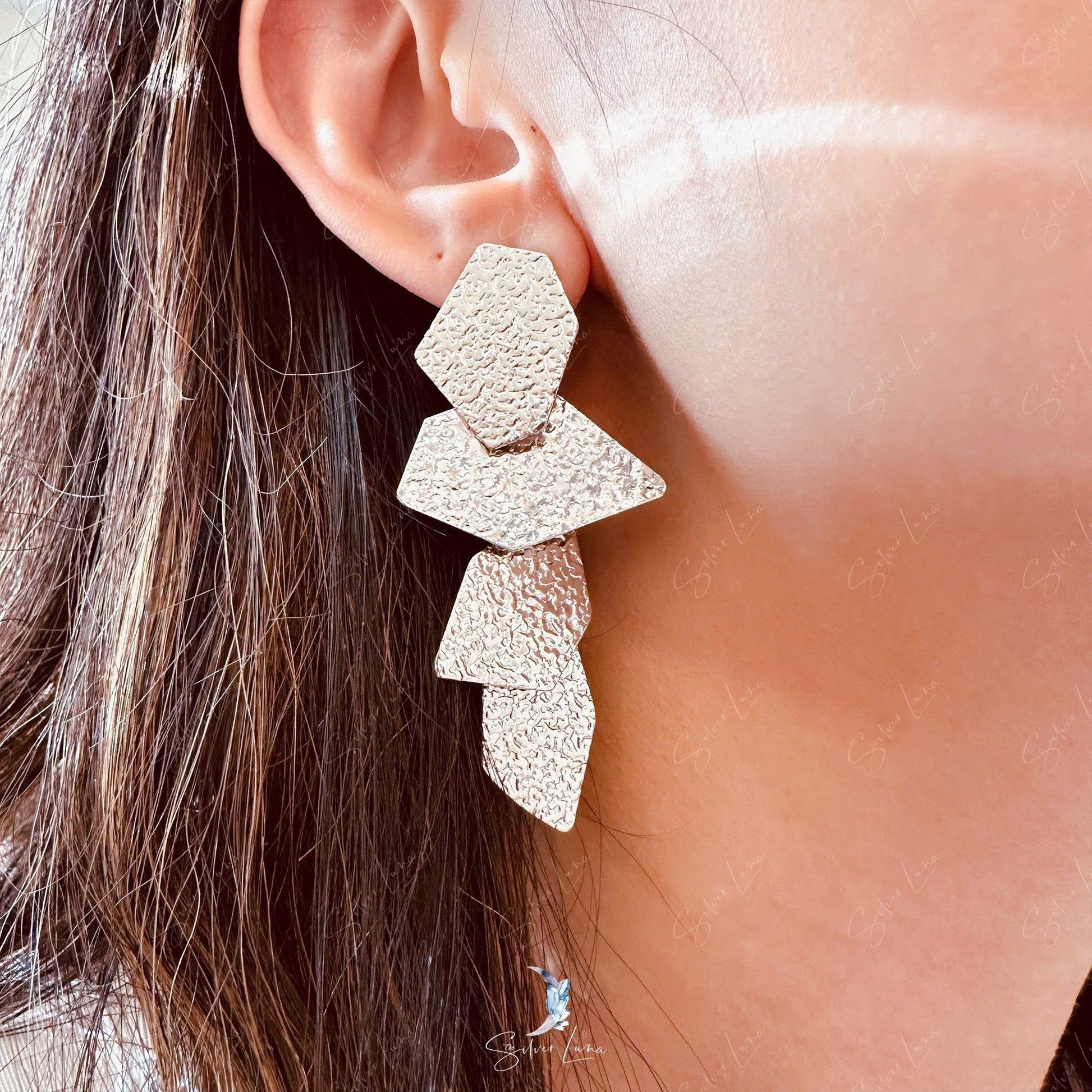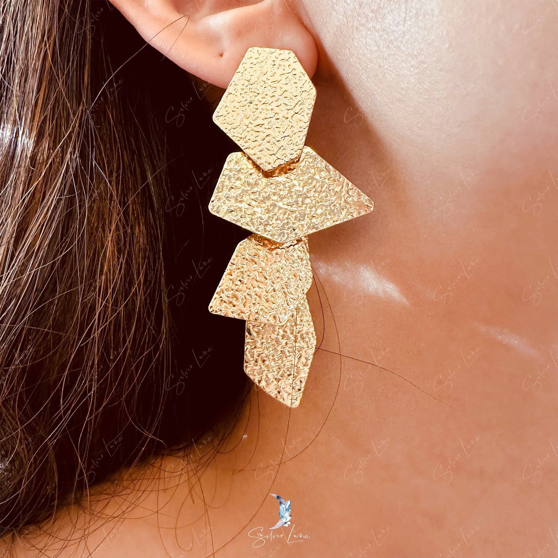 These fashion statement earrings features hammered texture geometric metal shape in golden color. Add these unique, elegant statement fashion earrings to your everyday fashion jewelry collection or as a gift for your love one.