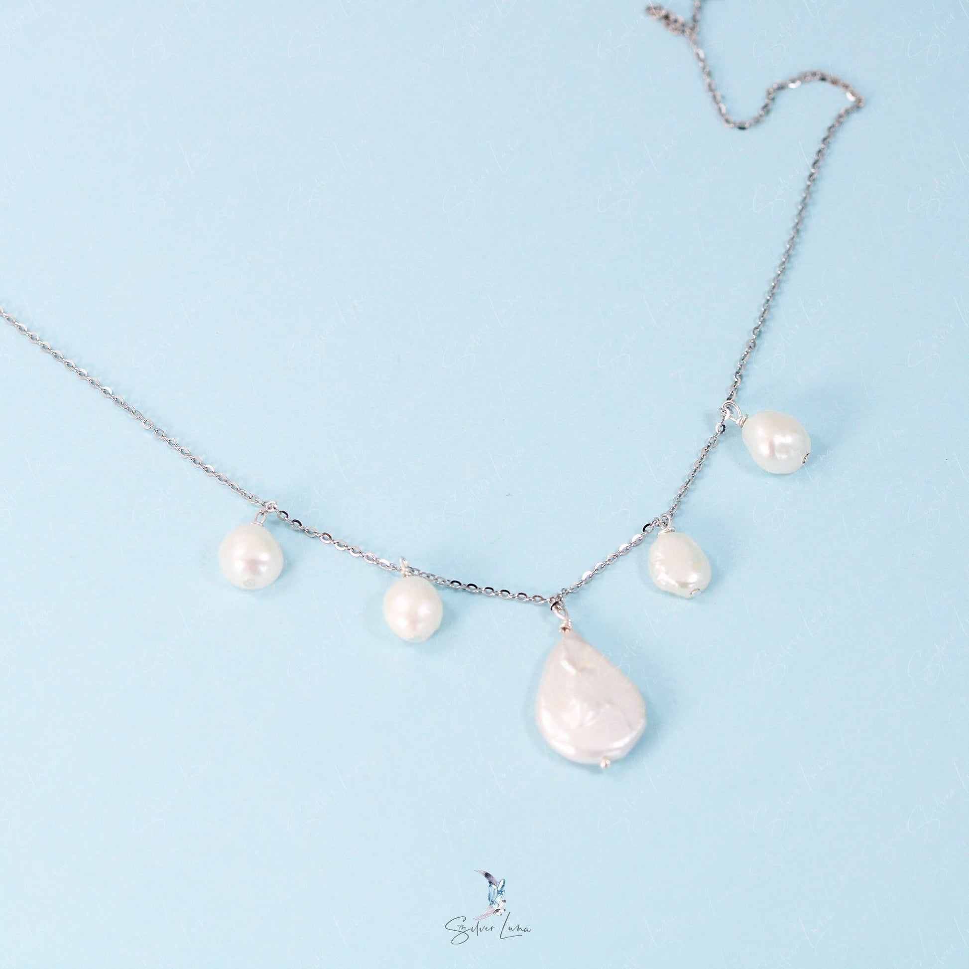 Make a statement with this exquisite piece - the Freshwater Baroque Pearls Pendant Necklace. Add it to your collection or gift it to a loved one. Featuring a beautiful baroque pear drop and multiple small pearls on a solid 925 sterling silver cable chain, this necklace is perfect for everyday wear or as a bridal accessory.