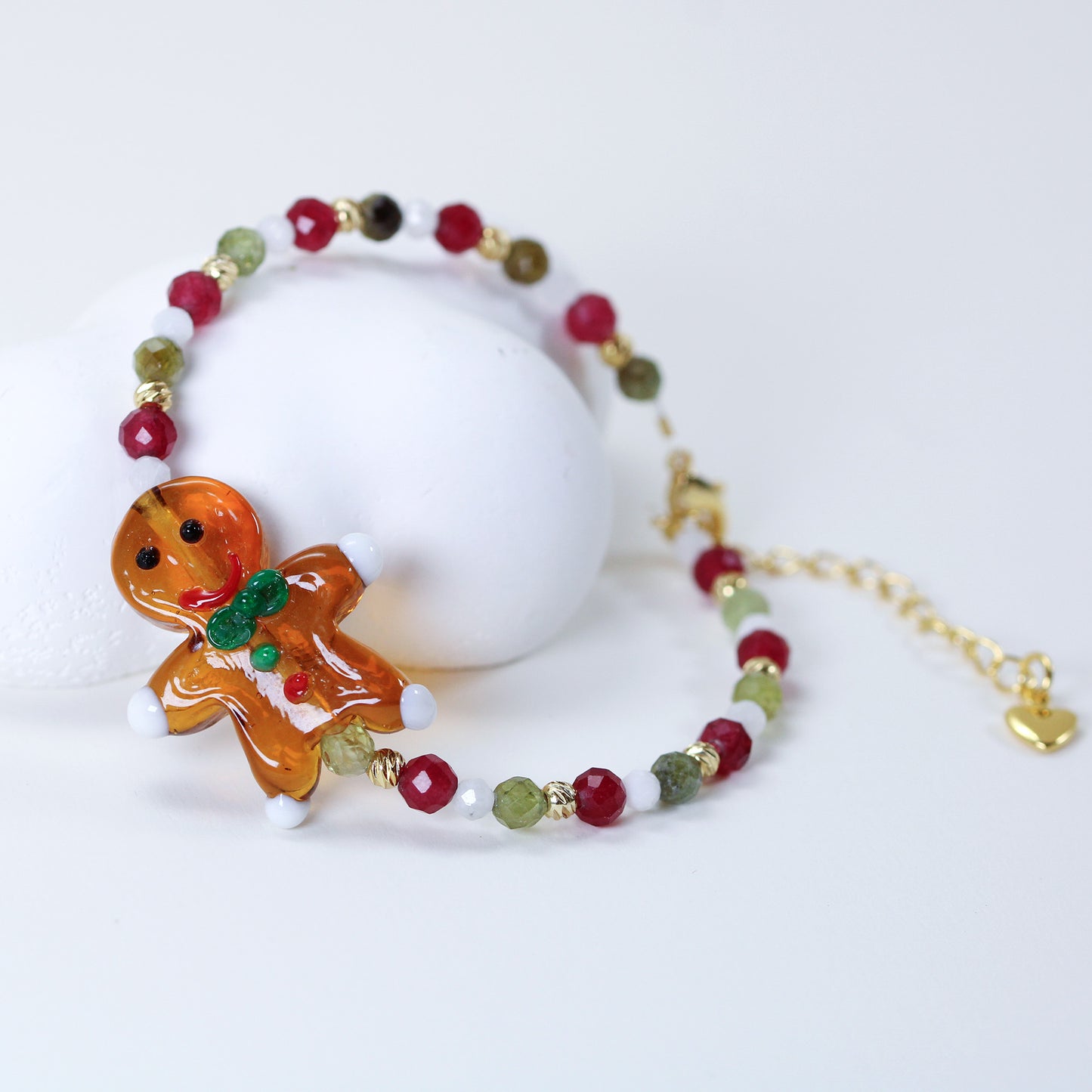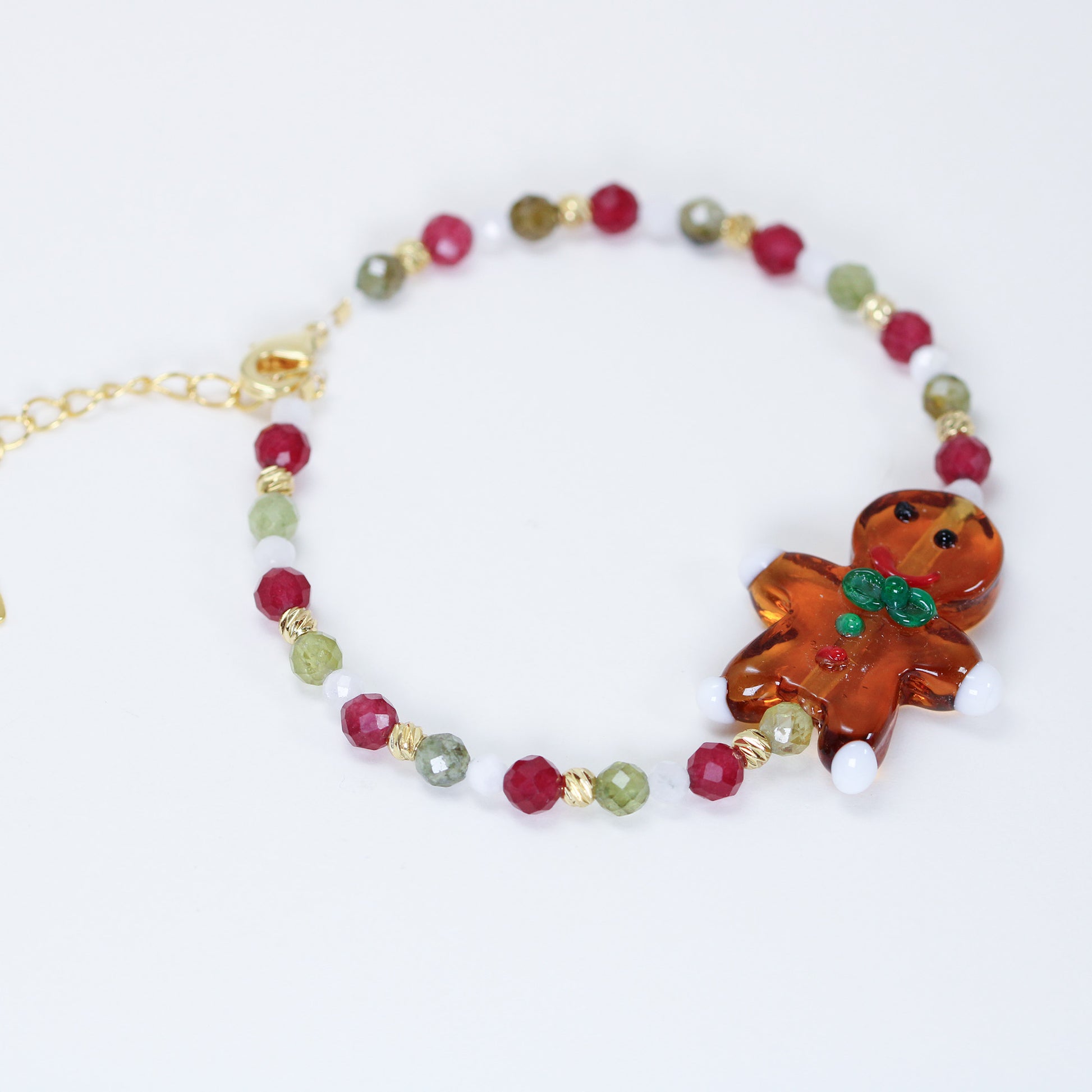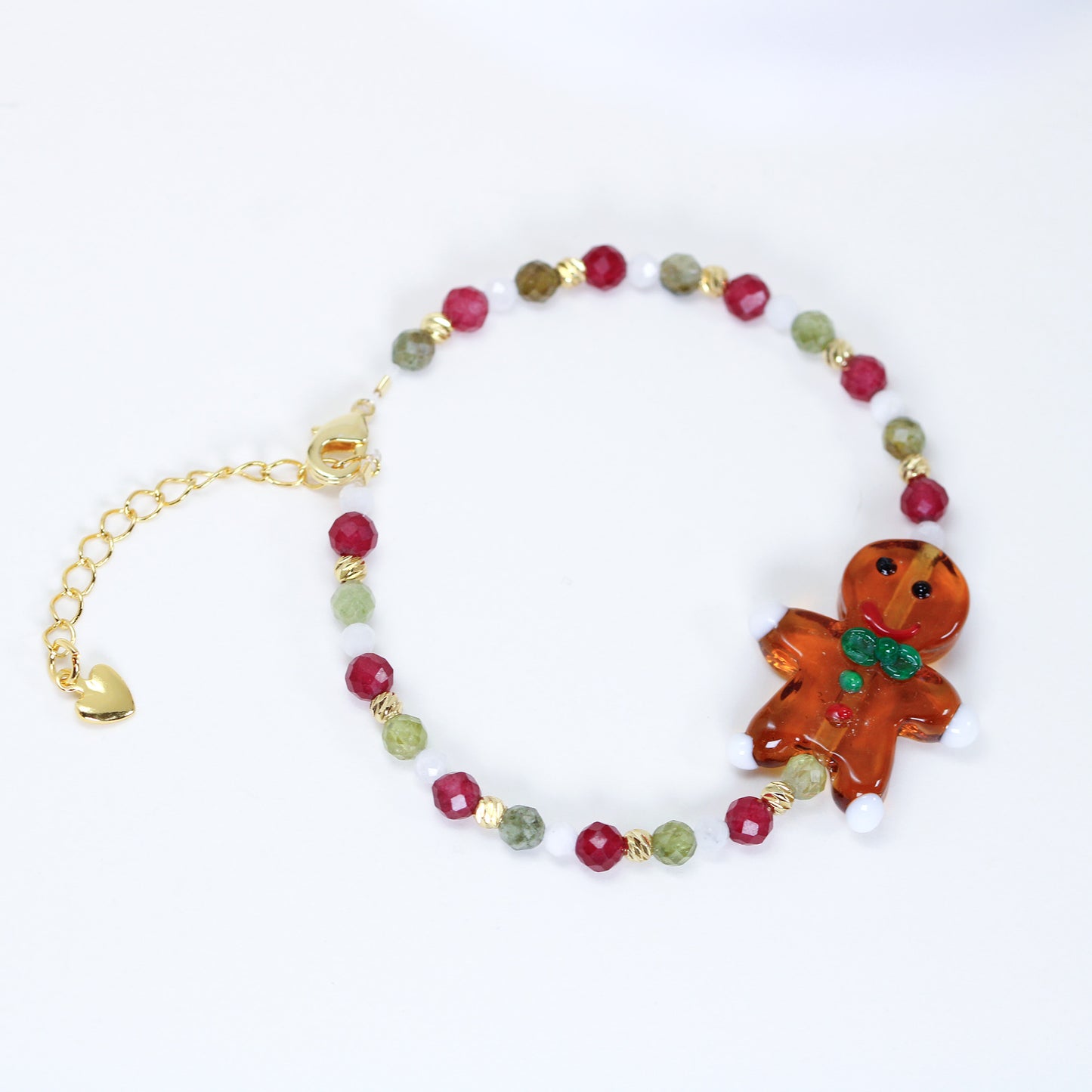 This Christmas beaded bracelet boasts traditional red ruby, green garnet, and white moonstone semi-precious faceted beads, accented with 18k gold plated brass round beads. A unique highlight is the lamp worked gingerbread man glass bead, making this a festive and luxurious addition to any holiday outfit.