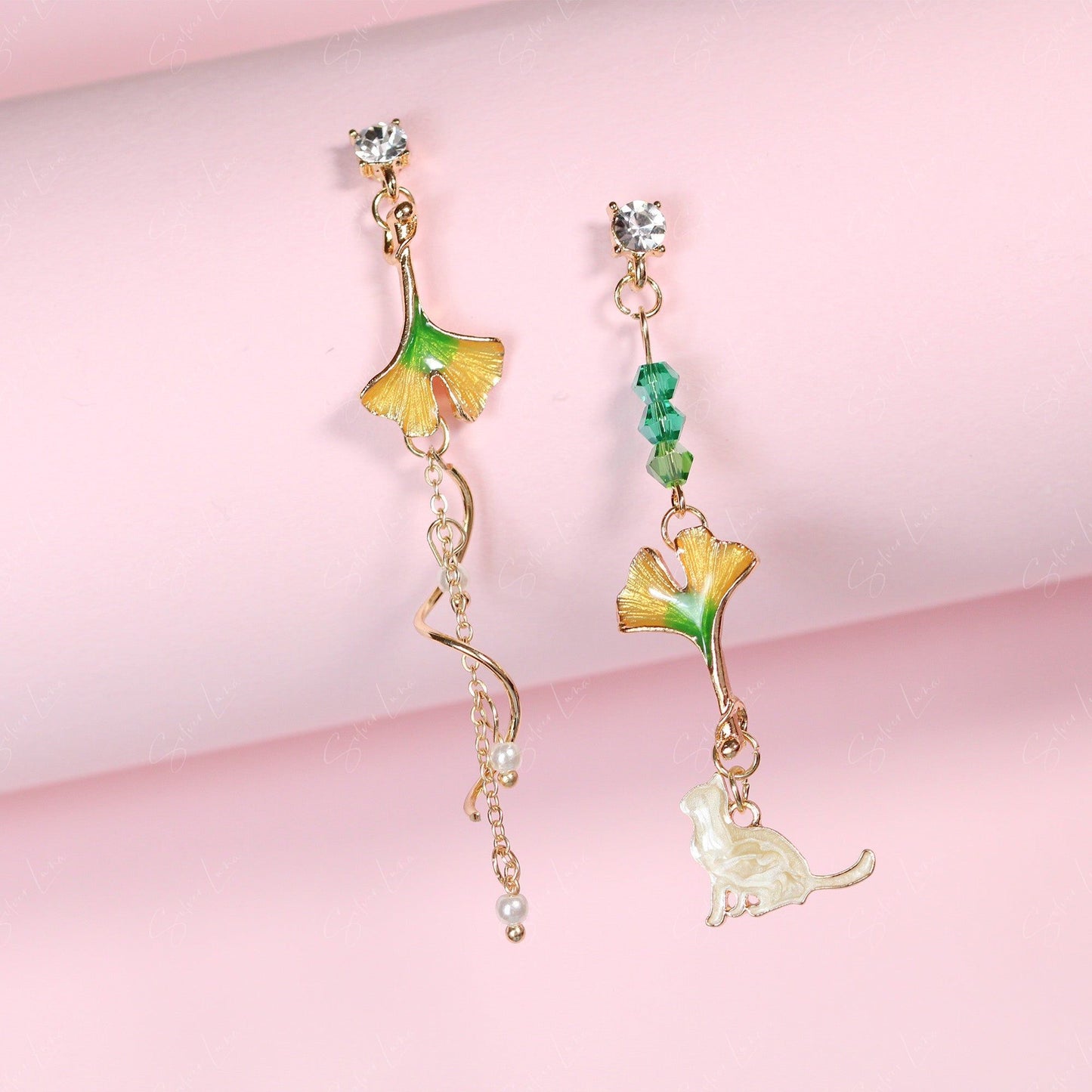 A charming pair of long dangle drop asymmetric earrings with enamel leaves charm, pearls charm on golden brass base and a cute white cat enamel charm at the end of one earring.