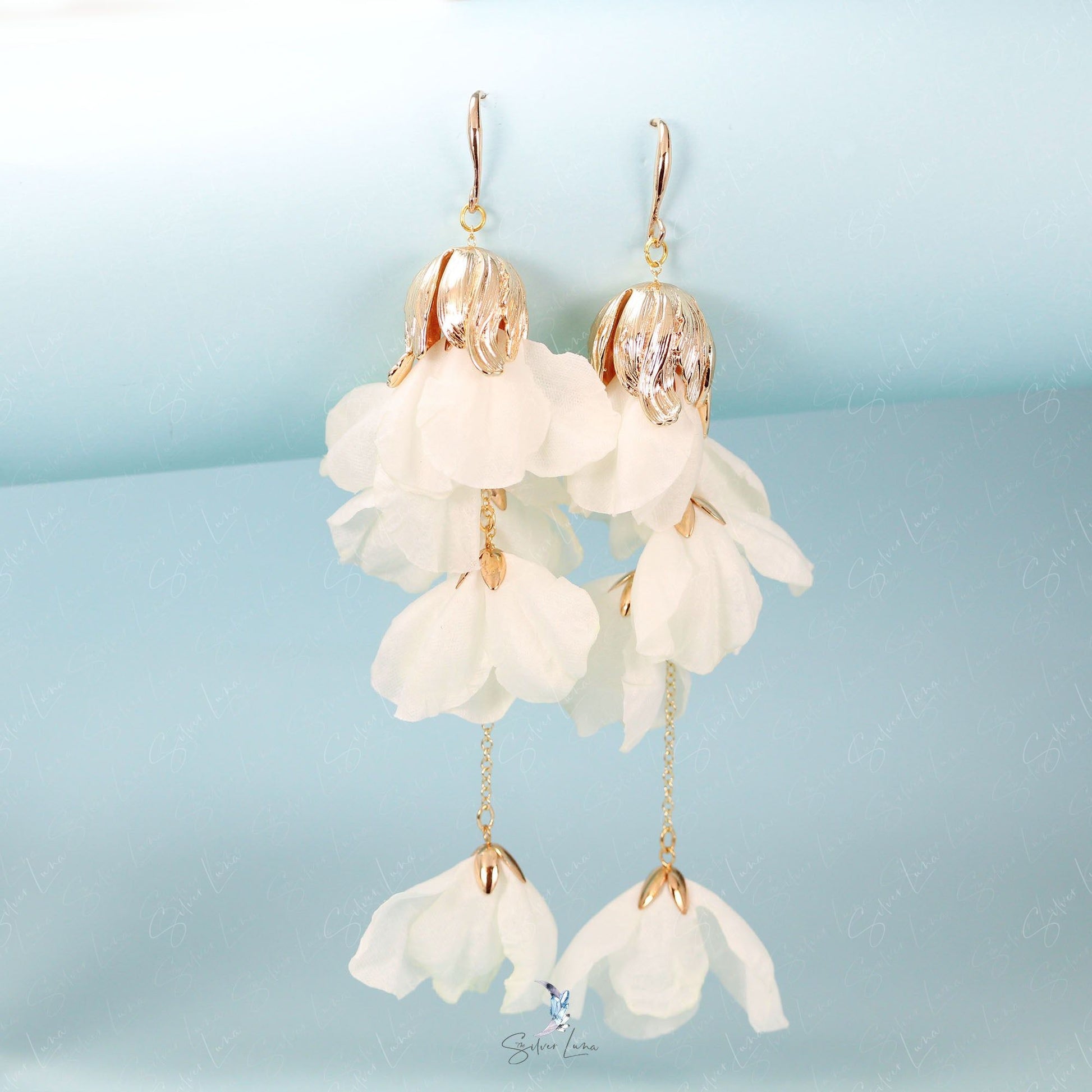 These elegant fabric flower long drop earrings feature beautiful fabric flower long drop Elevate your style with these stunning red and blue flower long drop earrings. They feature a 24k gold plated brass bell charm and elegant gold plated brass ear wires. The intricate design and high quality 18k gold plated copper chains and flower caps make these earrings perfect for any occasion, from weddings to cocktail parties. Don't miss the chance to add these exquisite long drop earrings to your fashion jewelry collection or give them as a special gift to someone you love.