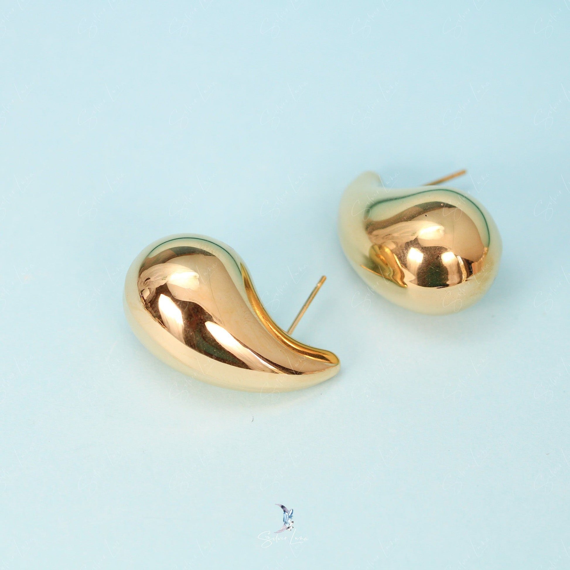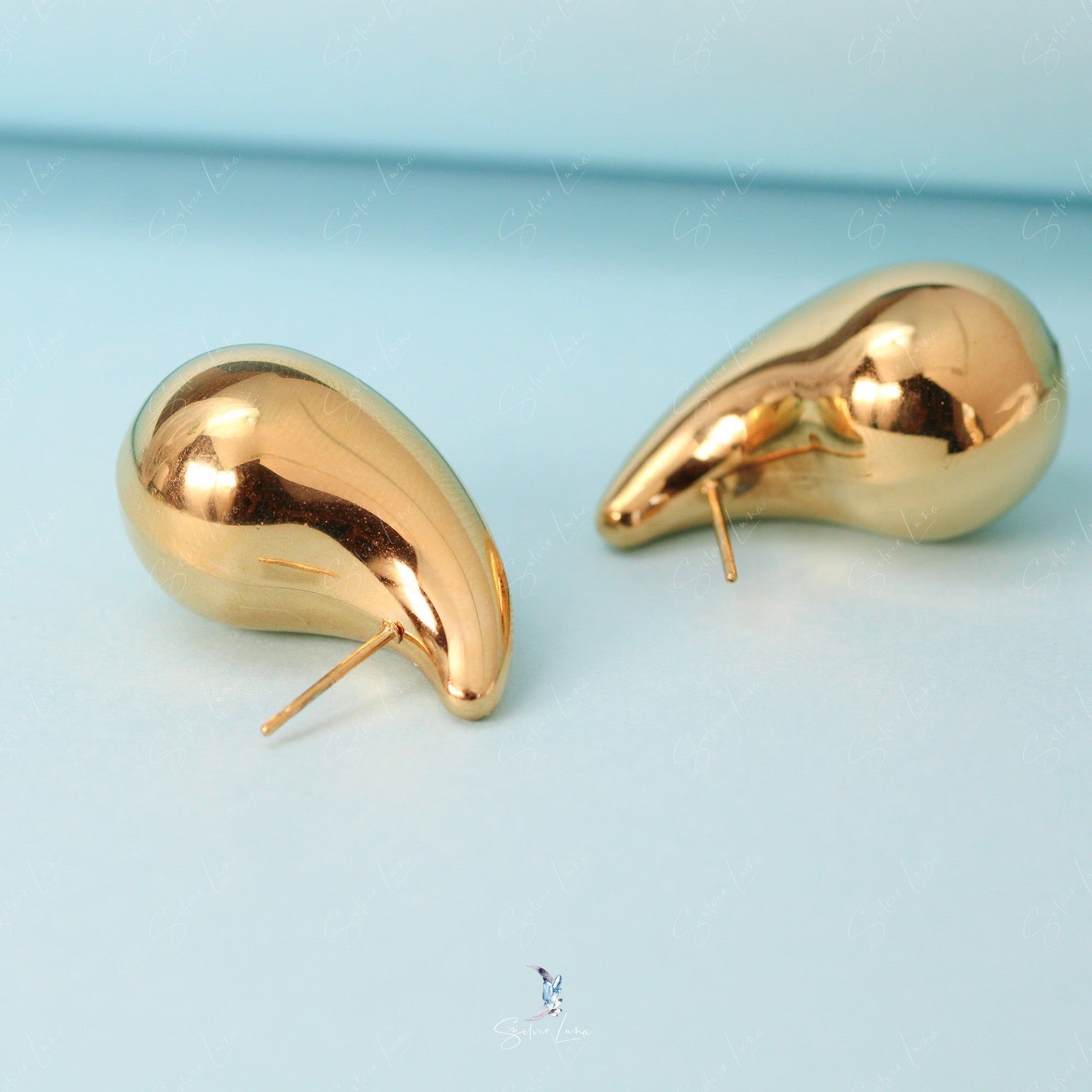 These unique golden water drop stud earrings feature a teardrop shape stud, stainless steal material, light weight and comfortable to wear.