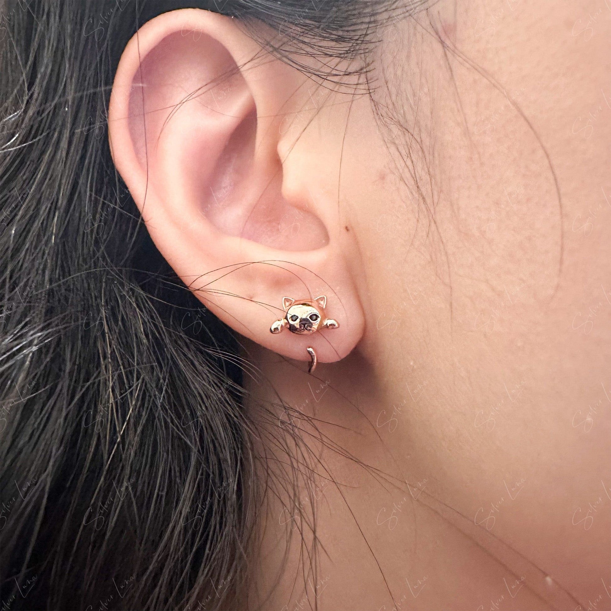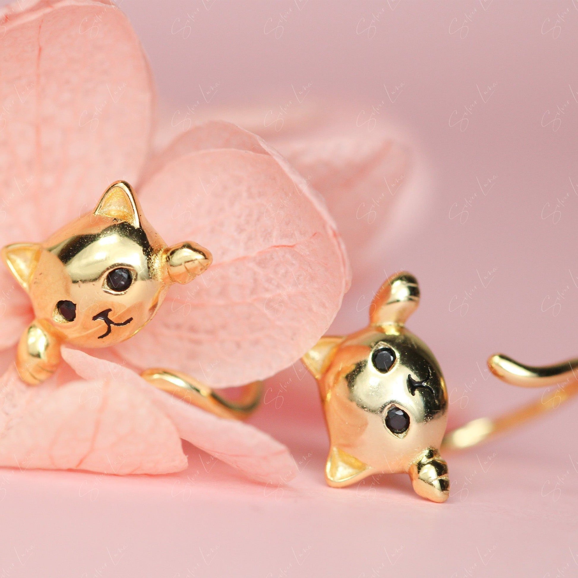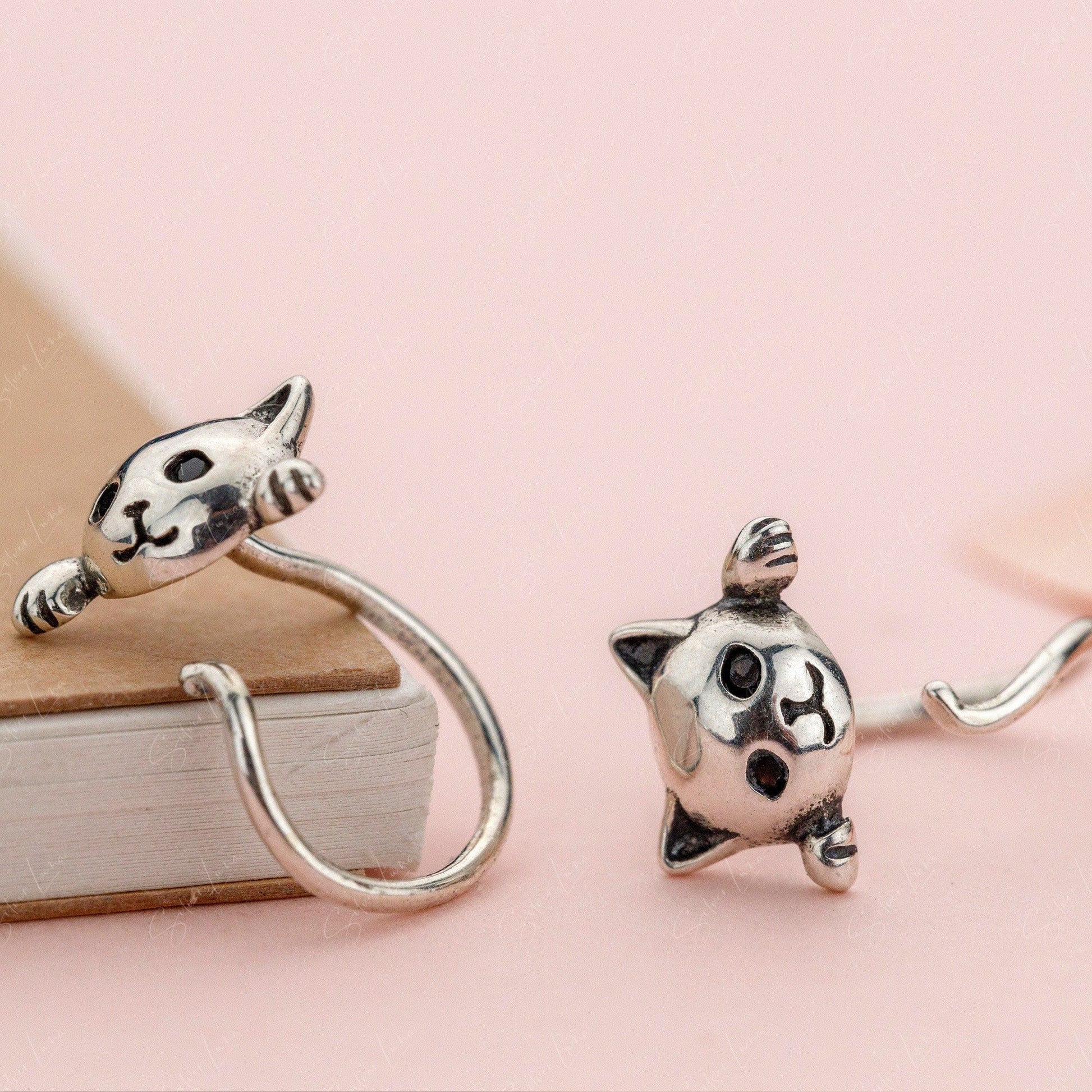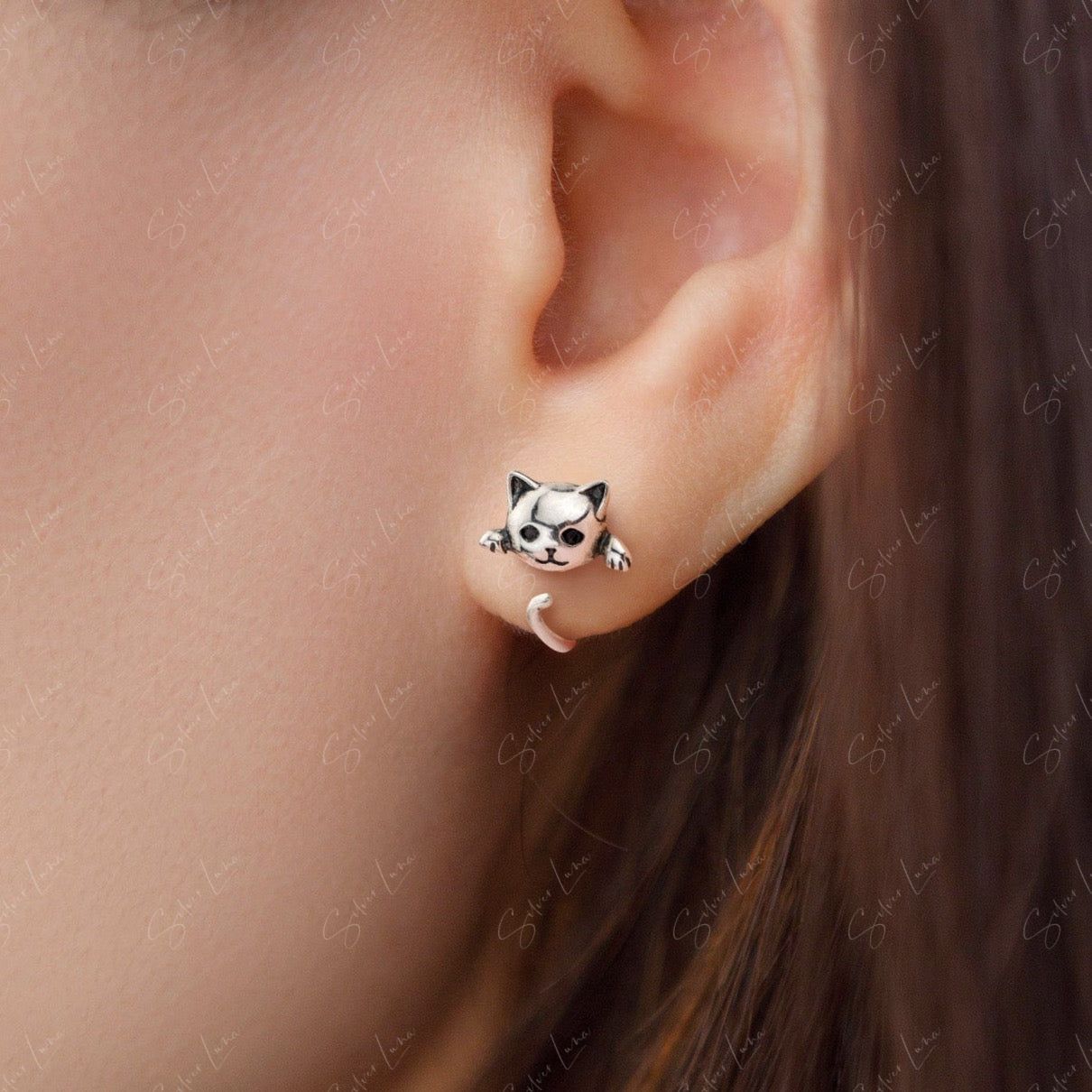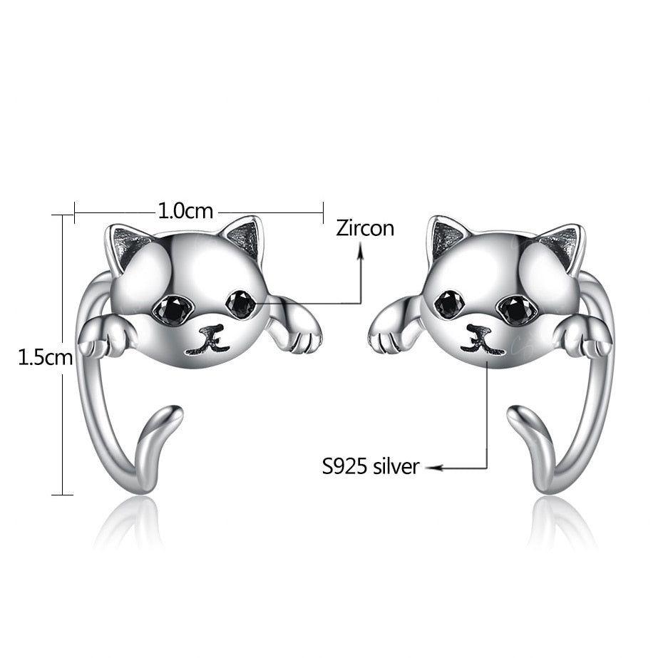 These feline-funny earrings add a playful touch of whimsy to any outfit. Made of sterling silver, each earring features an adorable hanging cat design with its tail wrapped around your earlobe. The cat's mischievous expression and dangling pose will have you smiling every time you catch your reflection. Whether you're an animal lover or just love unique jewelry, these one-of-a-kind sterling silver animal earrings are a purr-fect accessory for any fashionista. Available in silver, gold, rose gold and black finishes, they're sure to become your go-to pair for everyday wear that also packs some quirky style. So add a little levity and joy to your day with these hanging cat stud wrap sterling silver earrings.