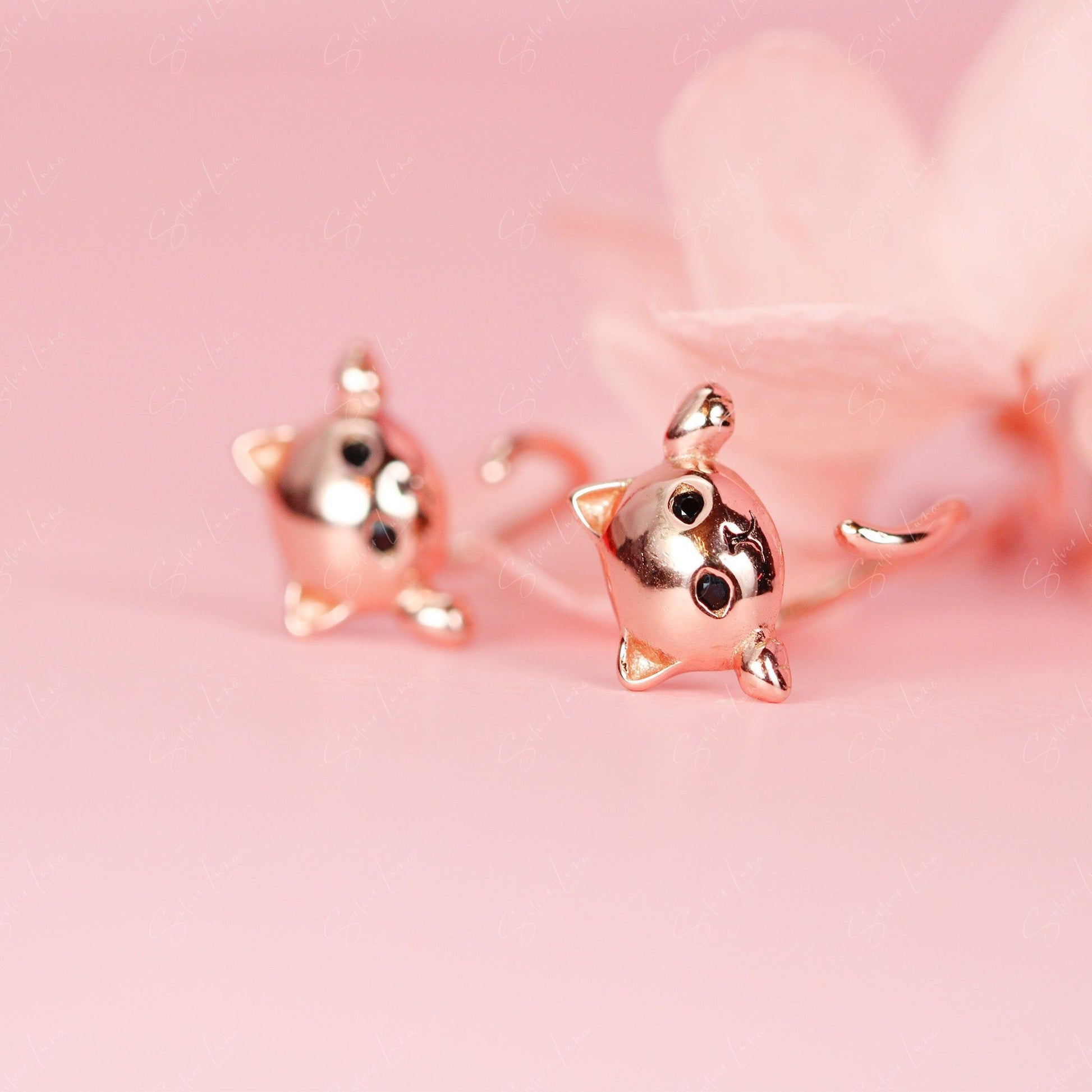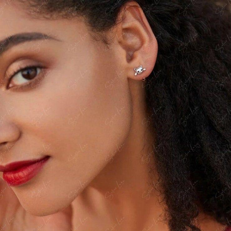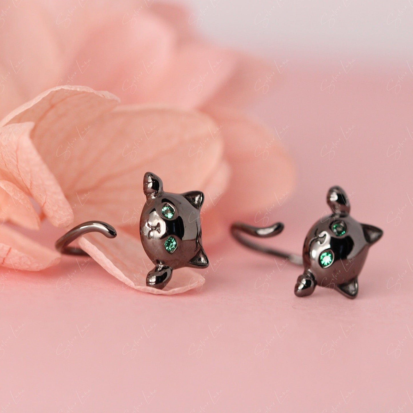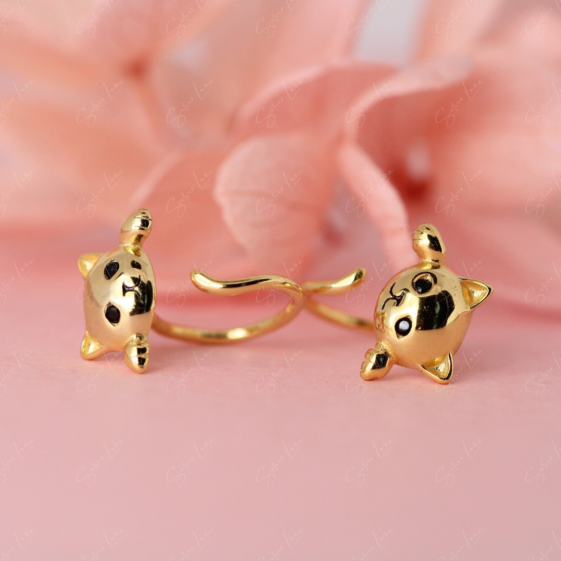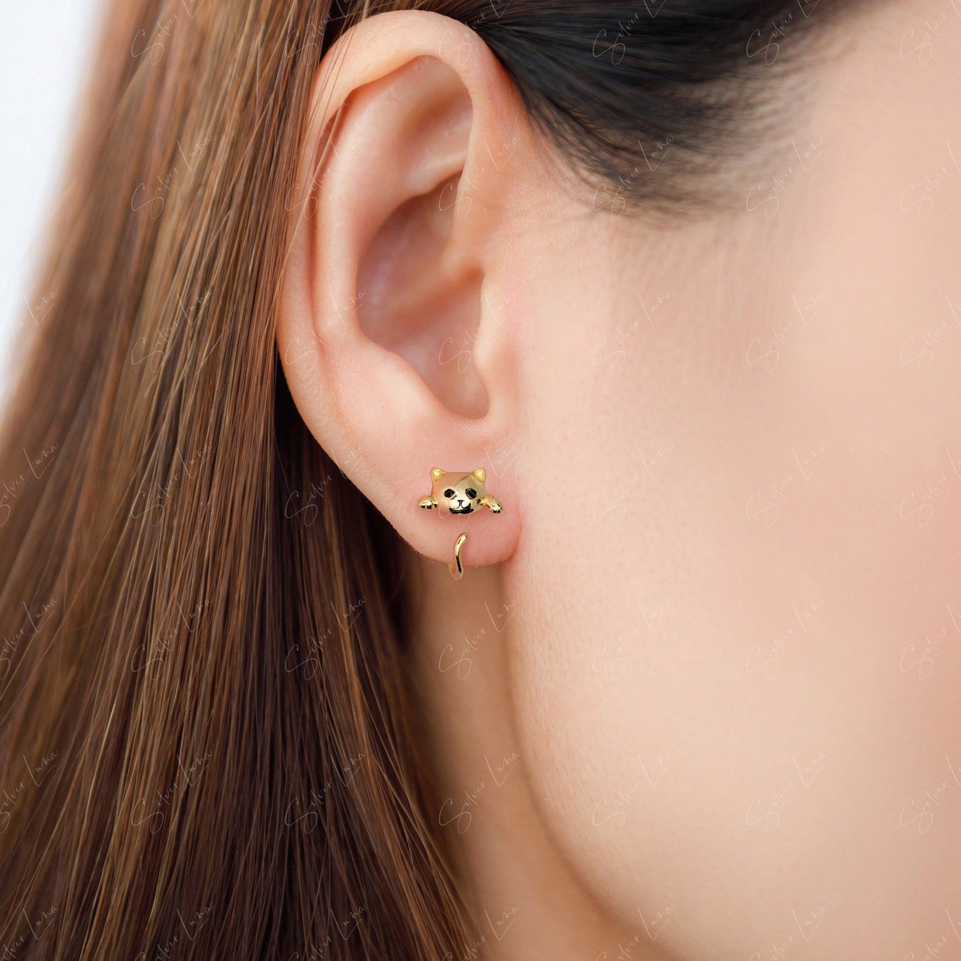 These feline-funny earrings add a playful touch of whimsy to any outfit. Made of sterling silver, each earring features an adorable hanging cat design with its tail wrapped around your earlobe. The cat's mischievous expression and dangling pose will have you smiling every time you catch your reflection. Whether you're an animal lover or just love unique jewelry, these one-of-a-kind sterling silver animal earrings are a purr-fect accessory for any fashionista. Available in silver, gold, rose gold and black finishes, they're sure to become your go-to pair for everyday wear that also packs some quirky style. So add a little levity and joy to your day with these hanging cat stud wrap sterling silver earrings.