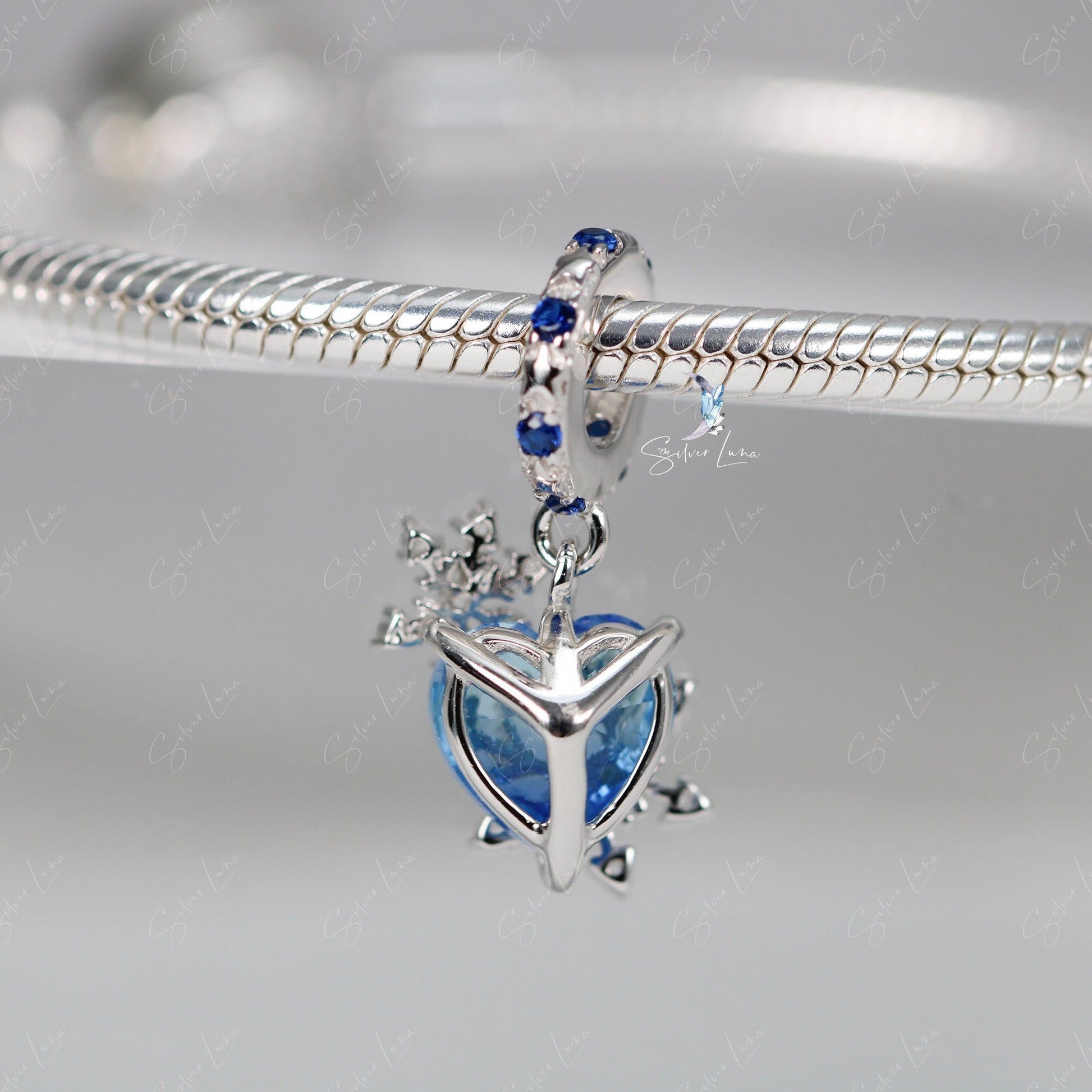 This snowflake dangle charm will fit original bracelet, features a blue heart crystal and snowflake design, made of solid 925 sterling silver with platinum plating and cubic zirconia. Turn heads and hearts with this stunning Heart Snowflake Pendant Charm! The charm is expertly crafted with a blue heart crystal and snowflake design, made of solid 925 sterling silver with platinum plating. You'll love the added sparkle from the cubic zirconia. A perfect addition to your original bracelet, it's a statement piece that will bring elegance and joy to any outfit. Treat yourself to a touch of luxury with our Heart Snowflake Pendant Charm.