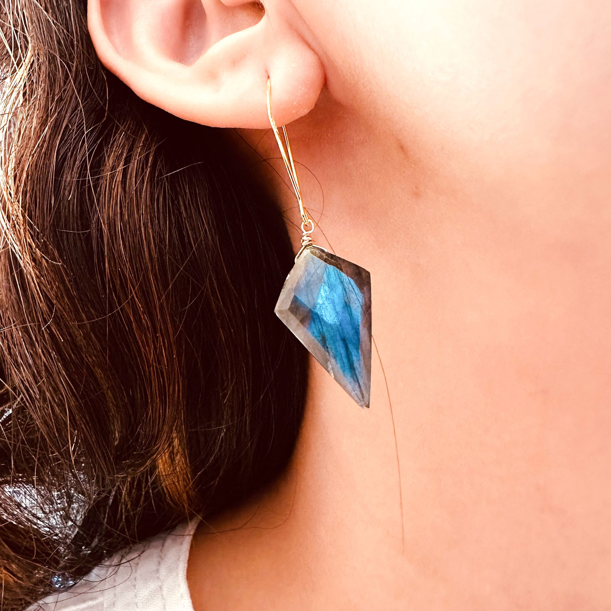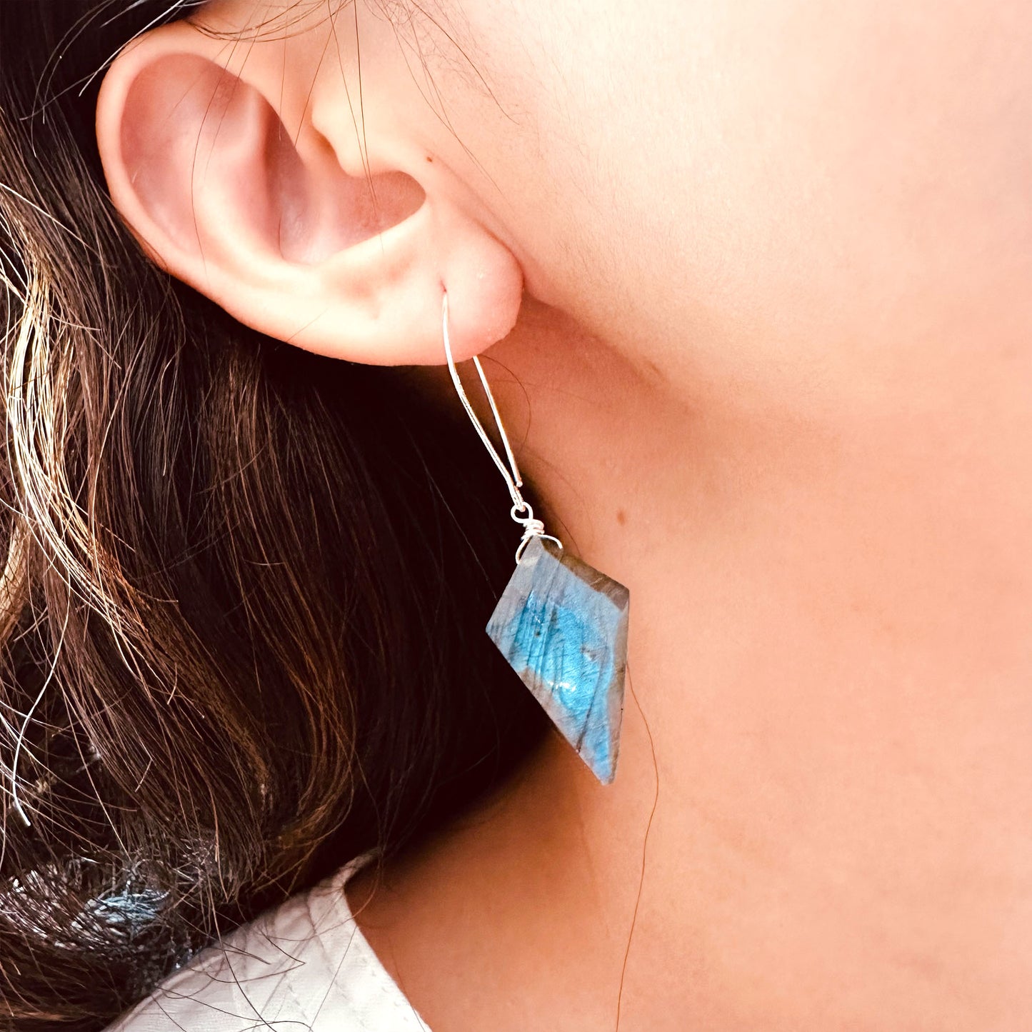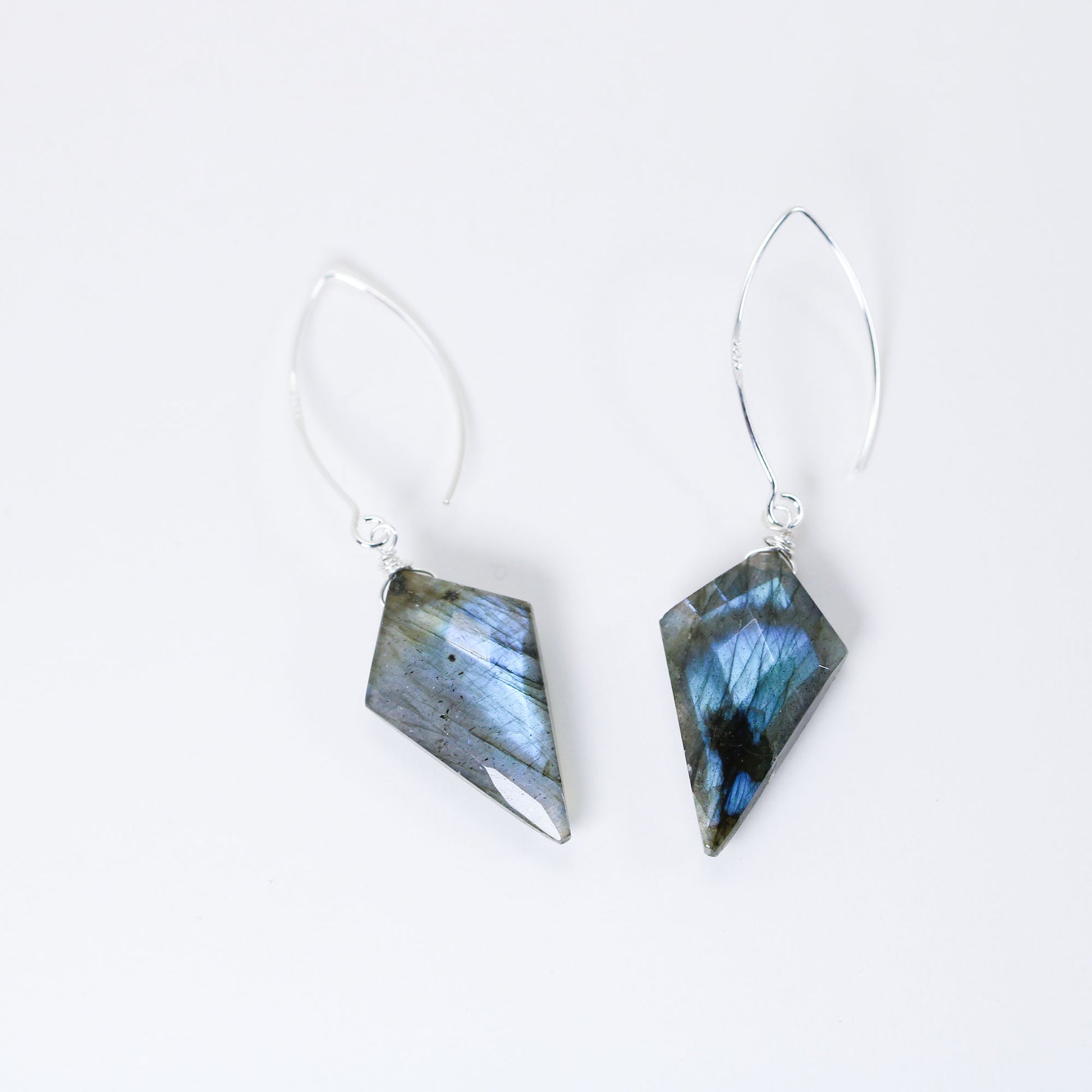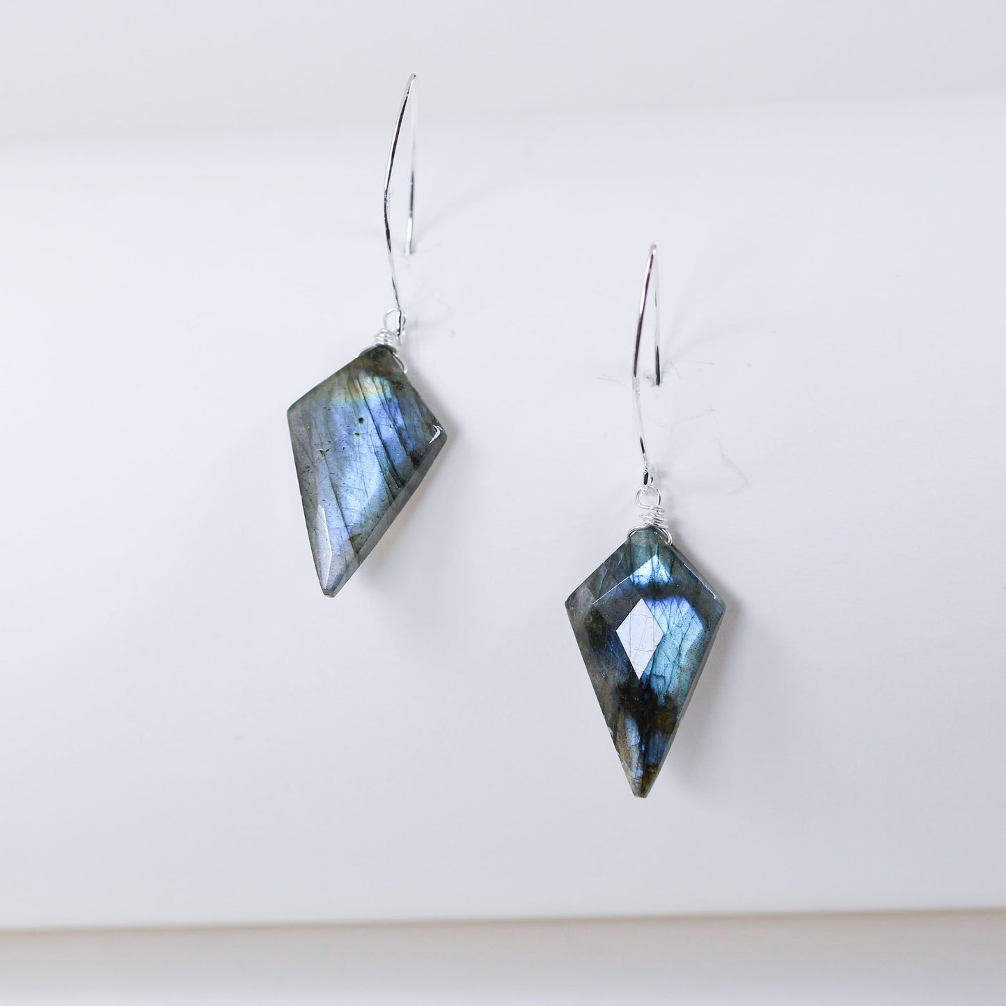 Expertly crafted with 925 sterling silver ear wires, these Kite diamond cut Labradorite dangle earrings exude elegance and sophistication. The unique cut of the Labradorite stones creates a mesmerizing play of colors, making them a versatile and eye-catching addition to any outfit. Enhance your style with these stunning and timeless earrings.