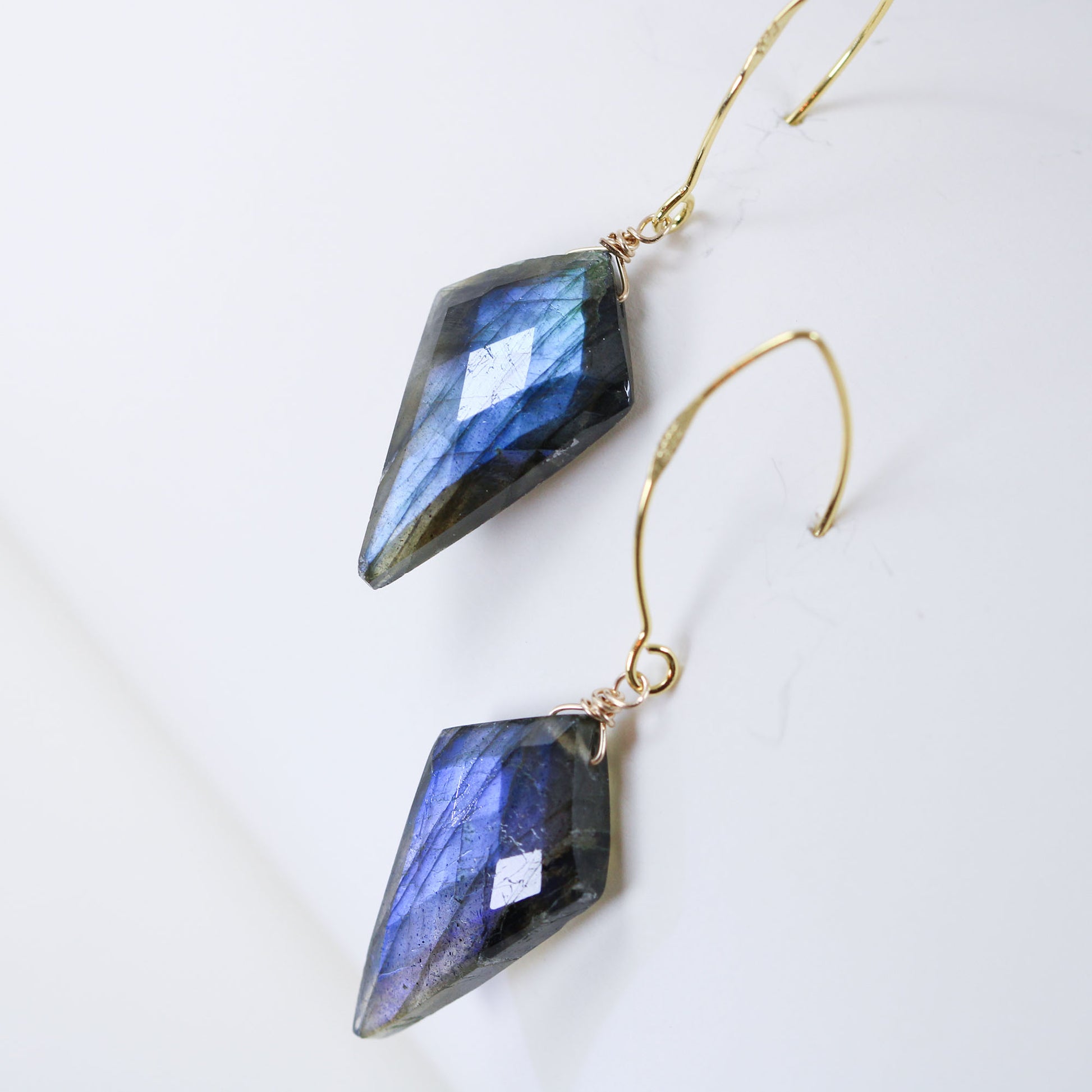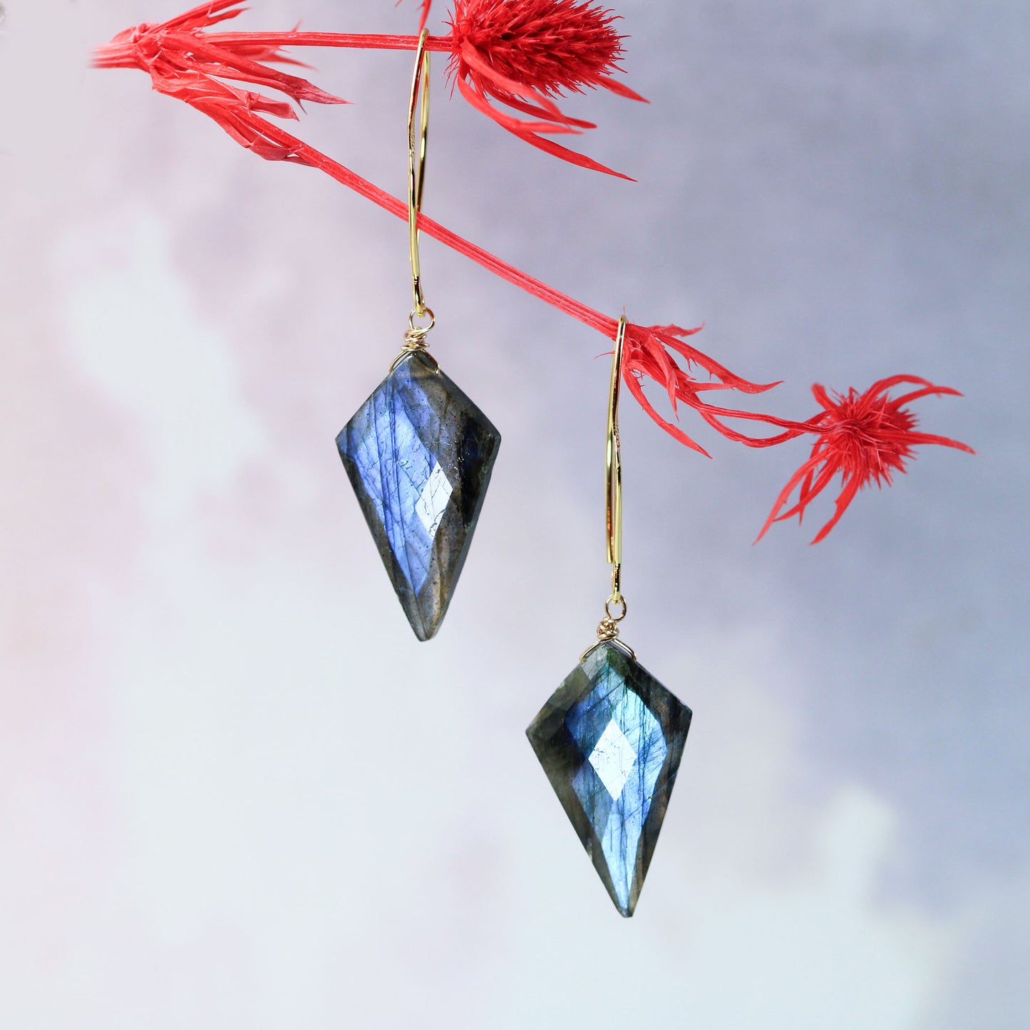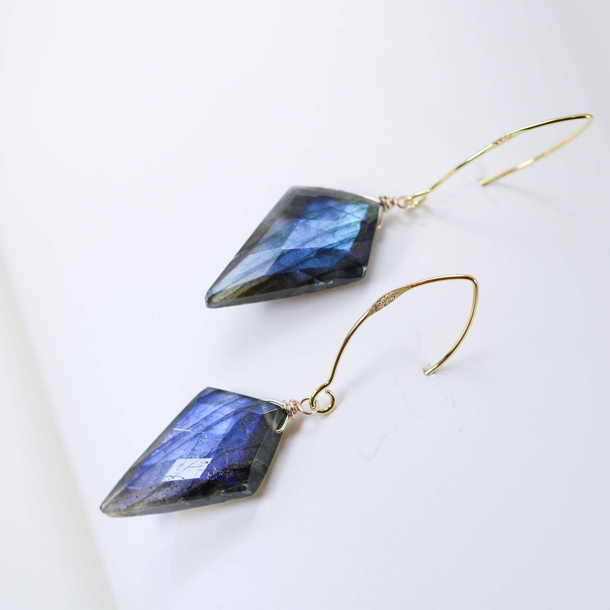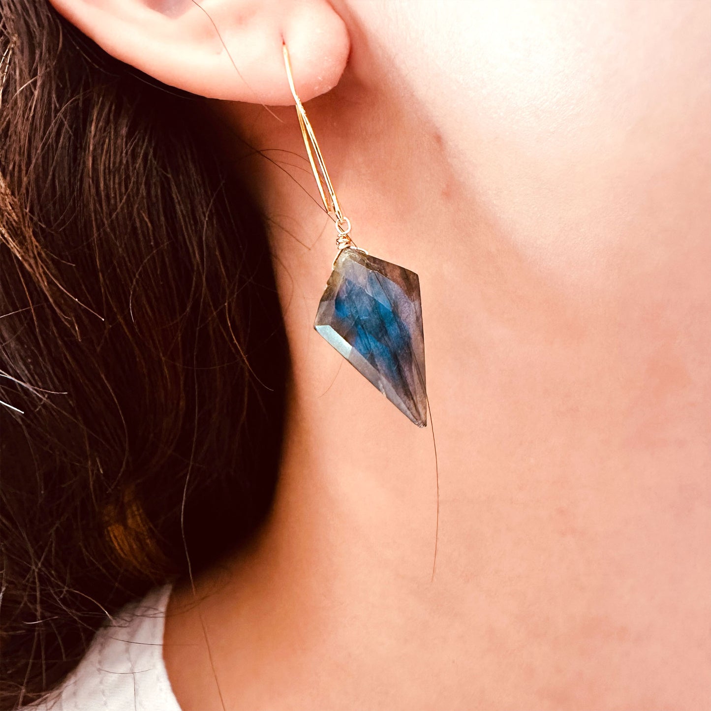 Expertly crafted with 925 sterling silver ear wires, these Kite diamond cut Labradorite dangle earrings exude elegance and sophistication. The unique cut of the Labradorite stones creates a mesmerizing play of colors, making them a versatile and eye-catching addition to any outfit. Enhance your style with these stunning and timeless earrings.