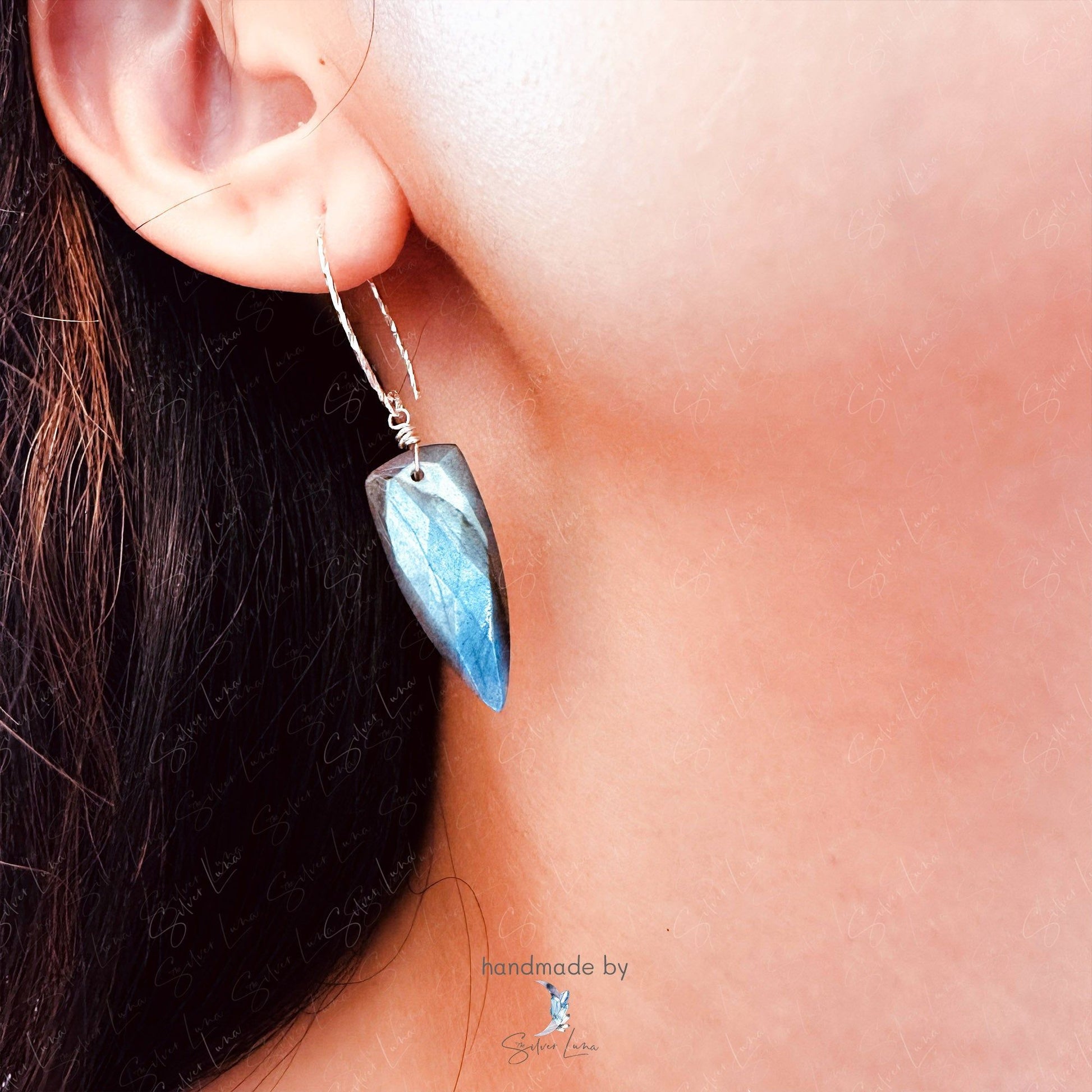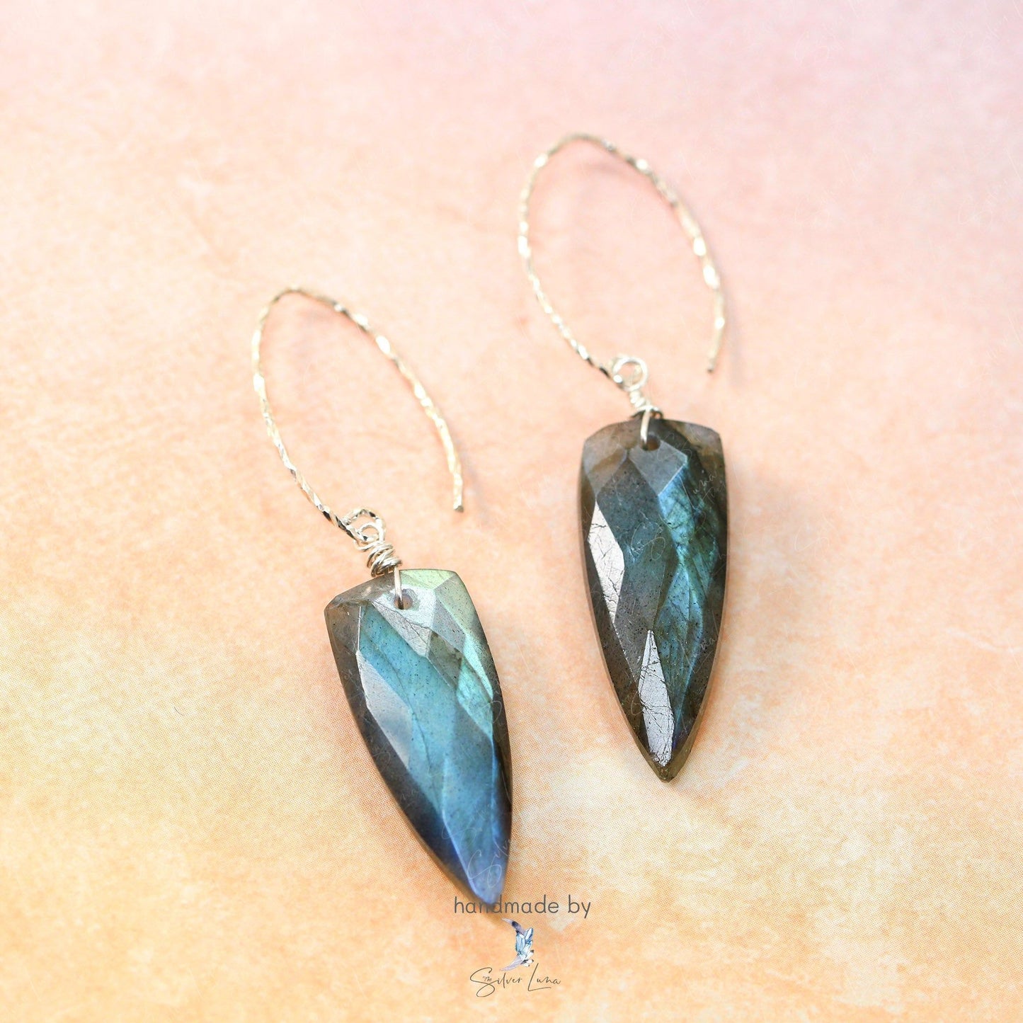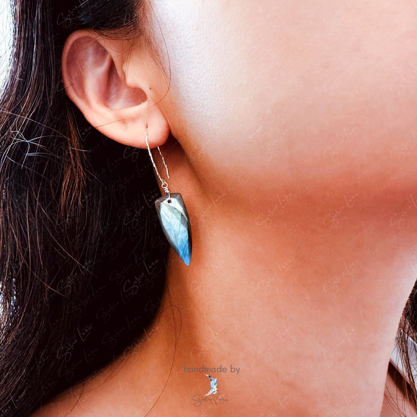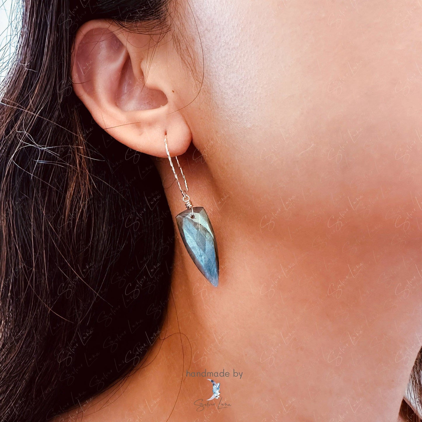 These elegant arrow shape faceted Labradorite dangle drop earrings feature a beautiful blue green flash Labradorite dangle drop on solid 925 sterling silver fish hook ear wires. Add these unique, elegant arrow Labradorite earrings to your everyday fine jewelry collection or as a gift for your loved one. Experience a stunning display of color with every turn of your head! These earrings feature a breathtaking blue green flash Labradorite stone, hung delicately on 925 sterling silver fish hook ear wires. Elevate your style with these one-of-a-kind Labradorite arrow shape drop earrings, perfect for any occasion.
