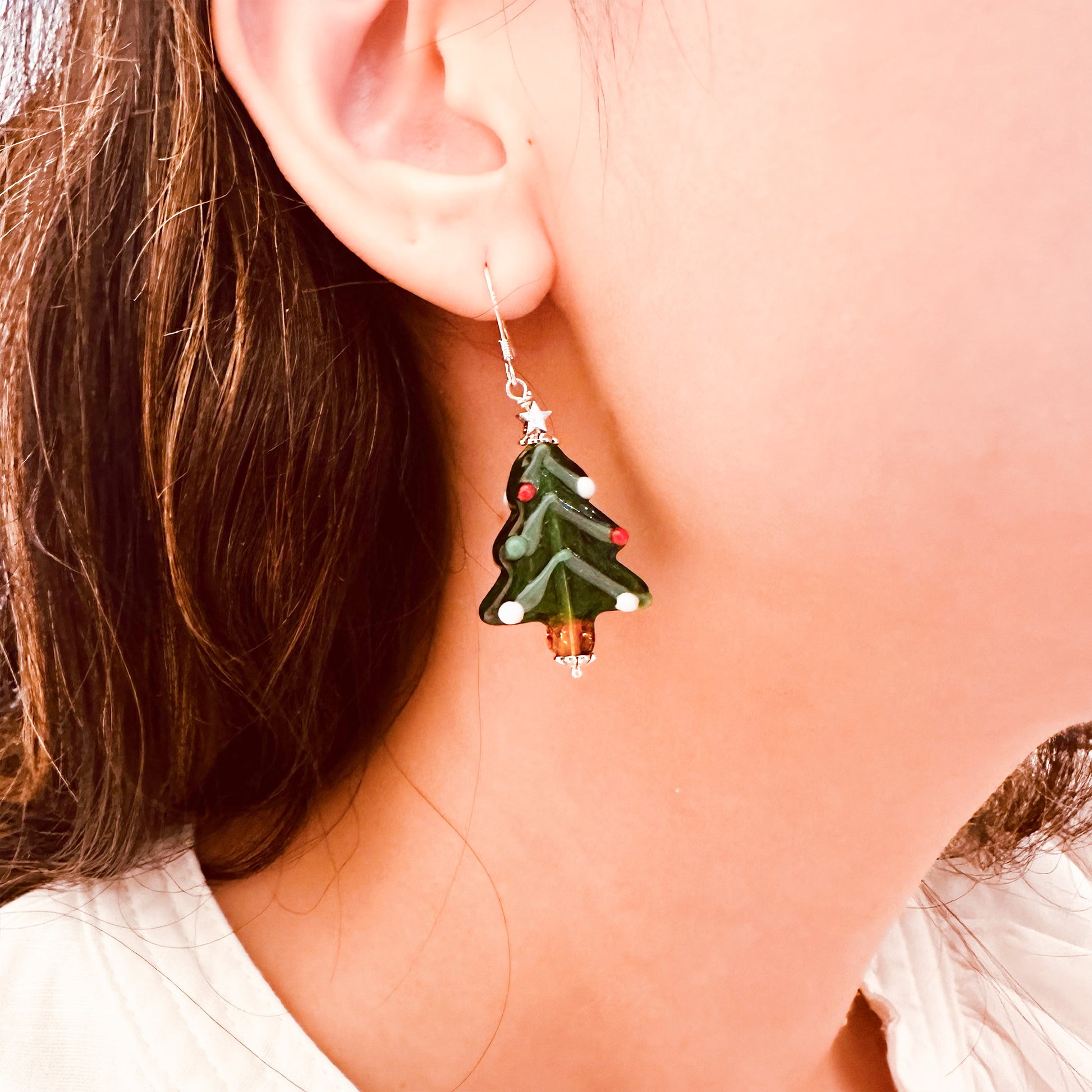 Add some festive flair to your holiday outfit with these lamp worked glass bead Christmas tree dangle earrings. The vibrant glass beads are skillfully crafted and hang from 925 sterling silver ear wires for a touch of elegance. Perfect for any holiday occasion.