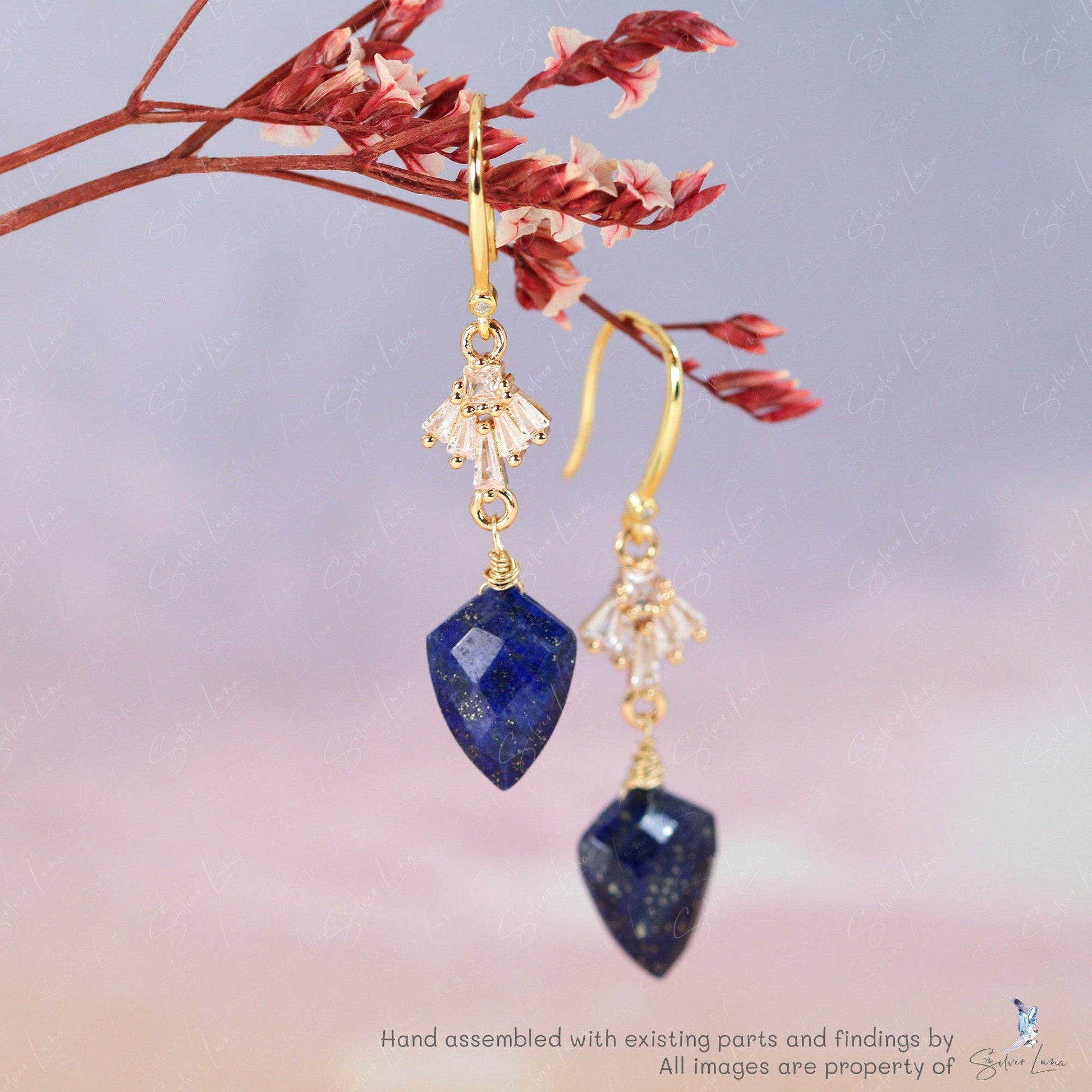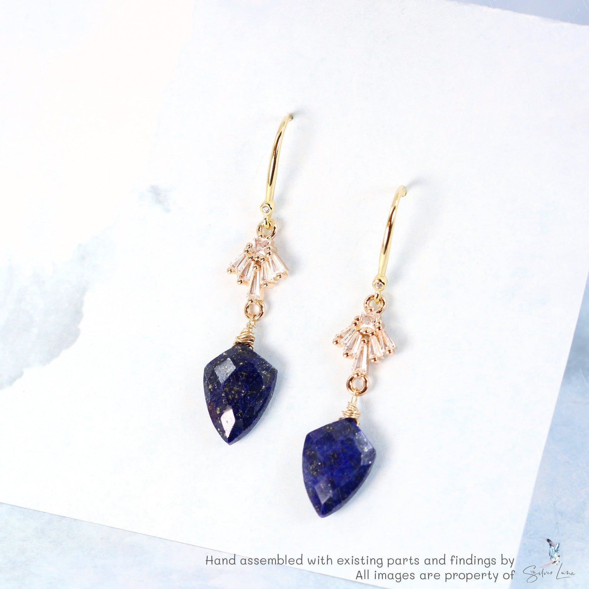 Materials: lapis lazuli gemstones, 24k gold plated brass fan connector charms, 925 sterling silver ear wires, cubic zirconia.