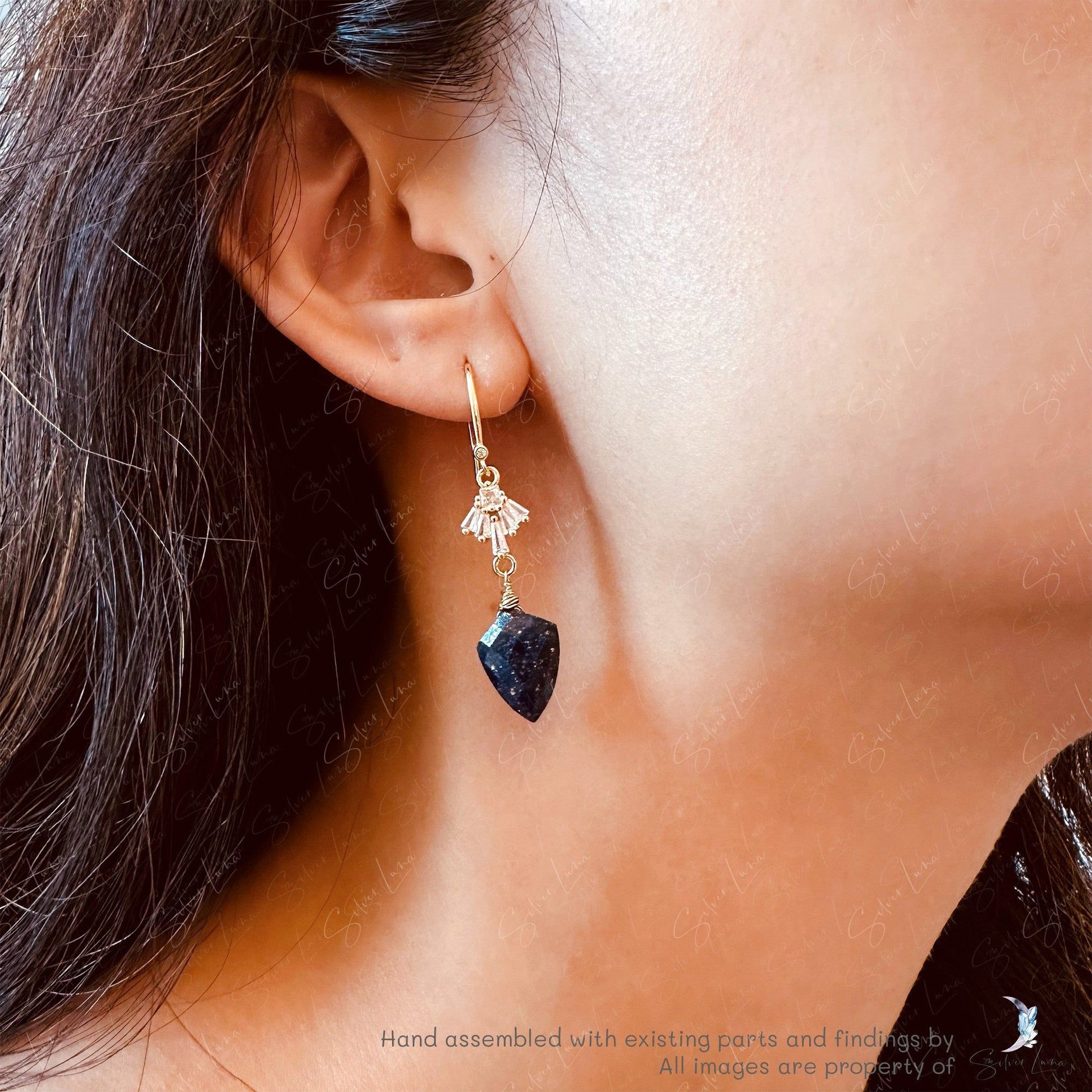 Transform your everyday look with these stunning Lapis Lazuli drop earrings. The faceted arrow-shaped deep blue gemstones are elegantly wire-wrapped with 14k gold fill wires and hang delicately from 24k gold plated brass fan connectors. The 18k gold plated 925 sterling silver ear wires add a touch of luxury to the design. A perfect addition to your fine jewelry collection, or a thoughtful gift for someone special. Order yours today.