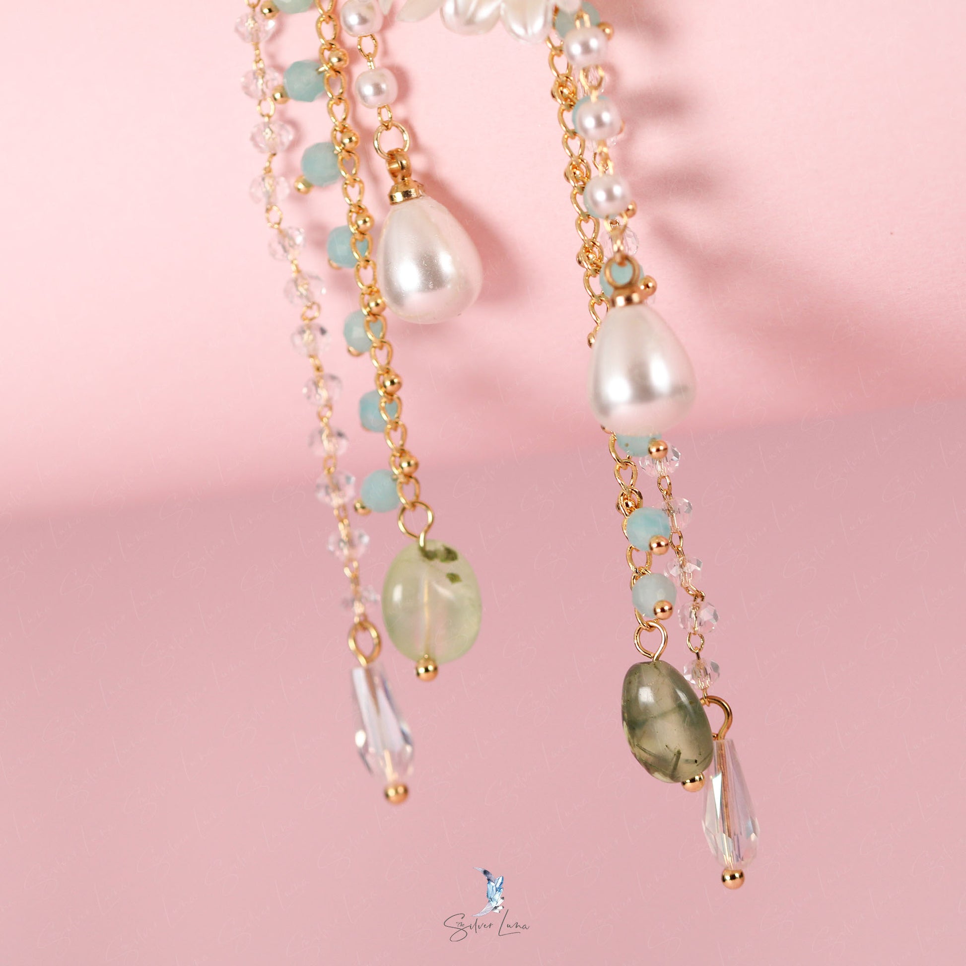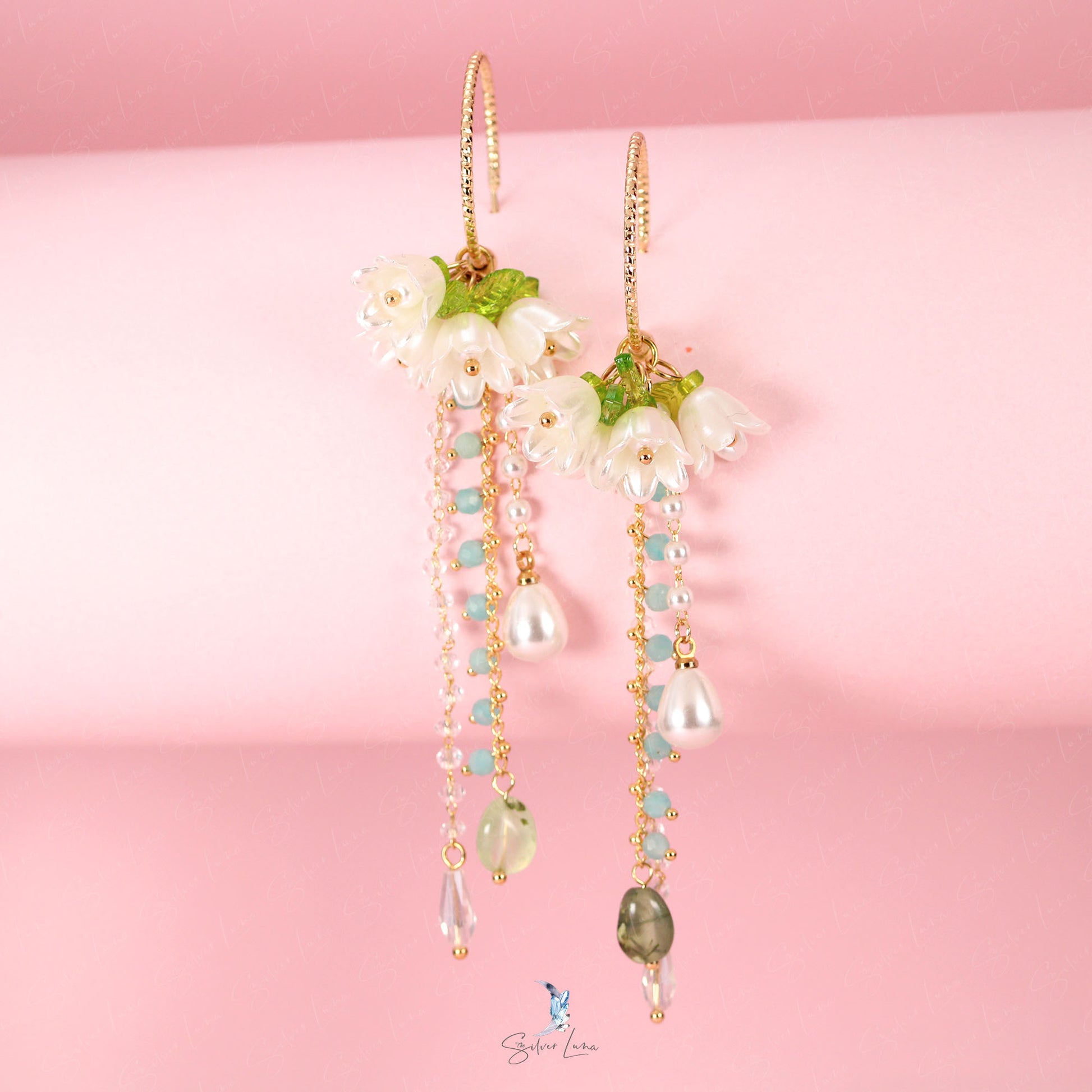 Enhance your style with our Lily flowers natural stone long drop fashion earrings! These stunning earrings feature lily flowers, artificial pearls, and green resin leaves, adorned with crystal chain and Amazonite beads for an elegant touch. The subtle green natural stone adds a unique flair to the white pearl flowers, while the hoop studs are made of luxurious 24k gold plated brass and the long trail chain is crafted from 18k gold plated copper. Elevate your look with these beautiful and high-quality earrings today!