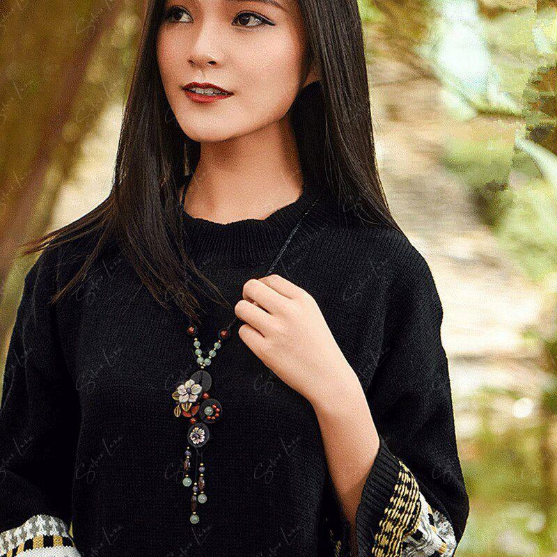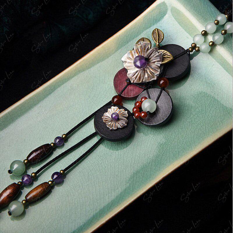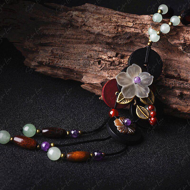 This bohemian long fashion necklace features unique design, a combination of different materials such as wood, wood bead, shell flower, natural stone. Unique vintage boho style make it a perfect accessories that will elevate simple outfit.