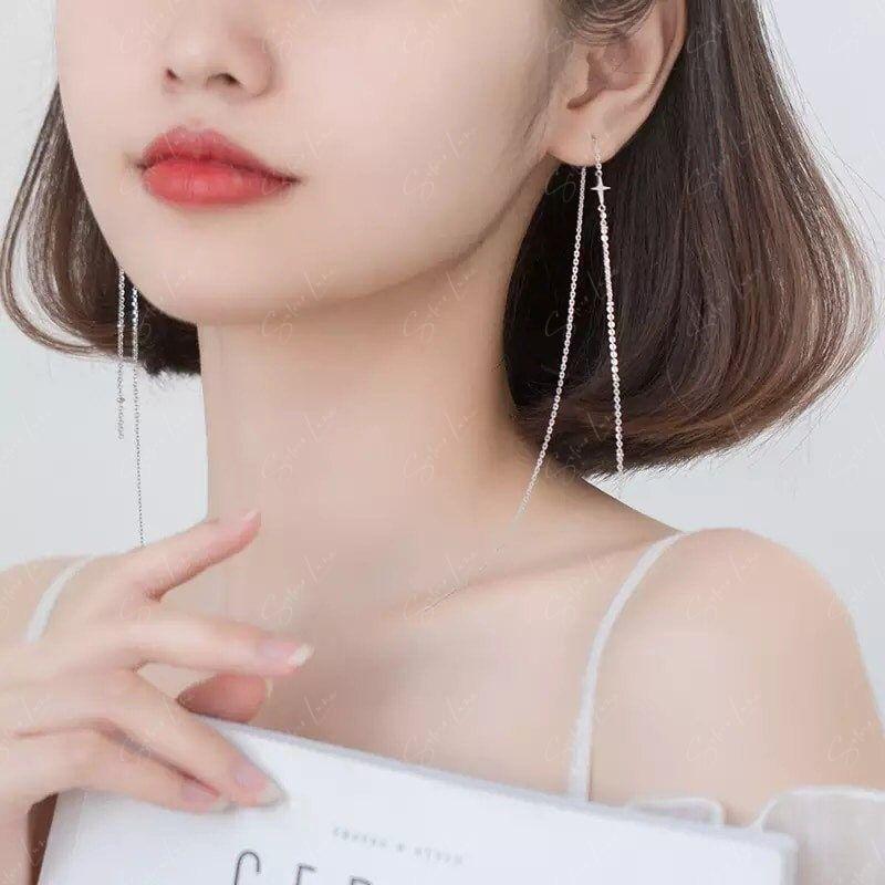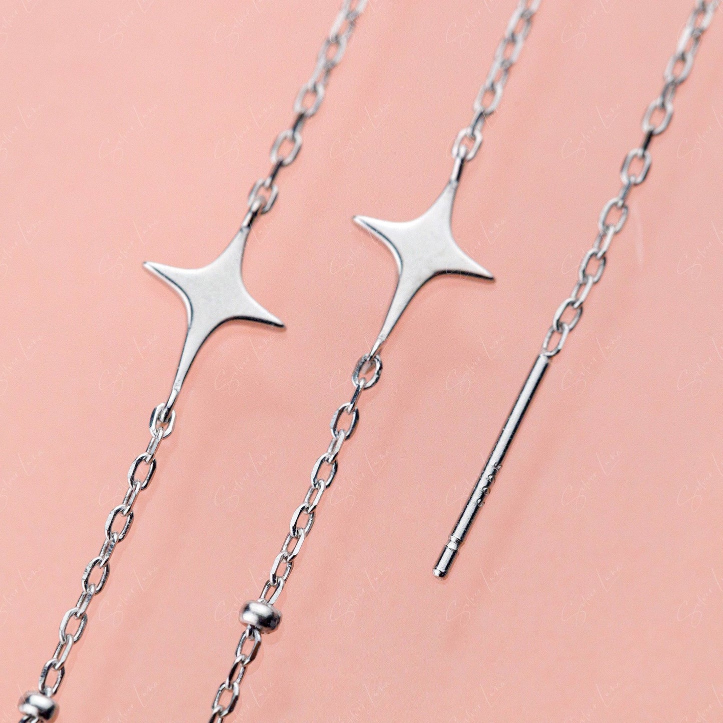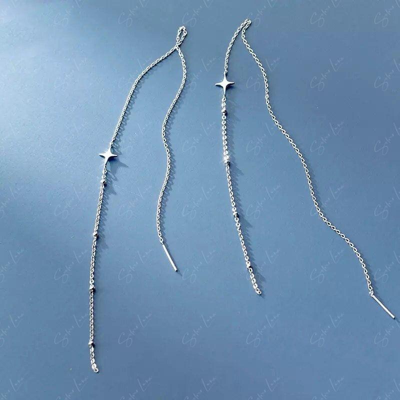 Experience the stunning elegance of these 925 sterling silver and platinum plated Long drop star ear threader earrings, featuring delicate stars and an extended chain for a truly glamorous appearance. Get ready to shine like a star with every outfit. These beautiful earrings are crafted with 925 sterling silver and platinum plating, giving them a luxurious and eye-catching appearance. With its unique extended chain design, these earrings will make any outfit pop and add a touch of elegance and glam to your look. A must-have accessory for any fashion-forward individual.