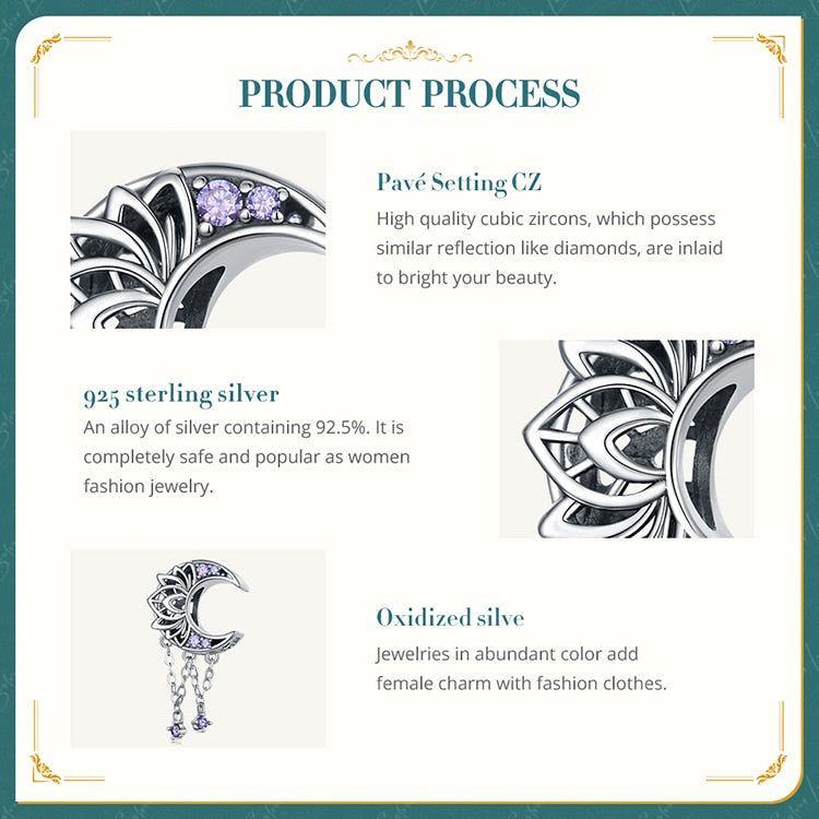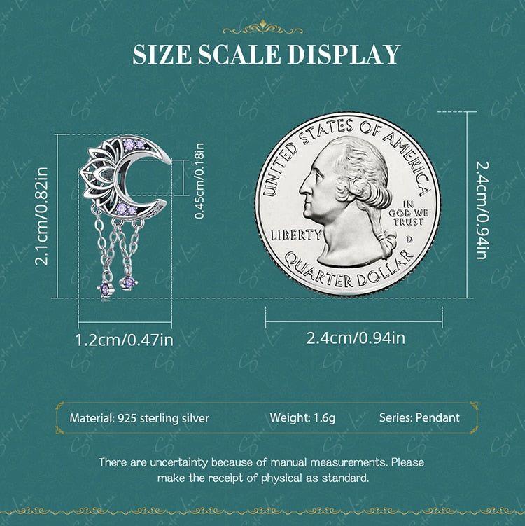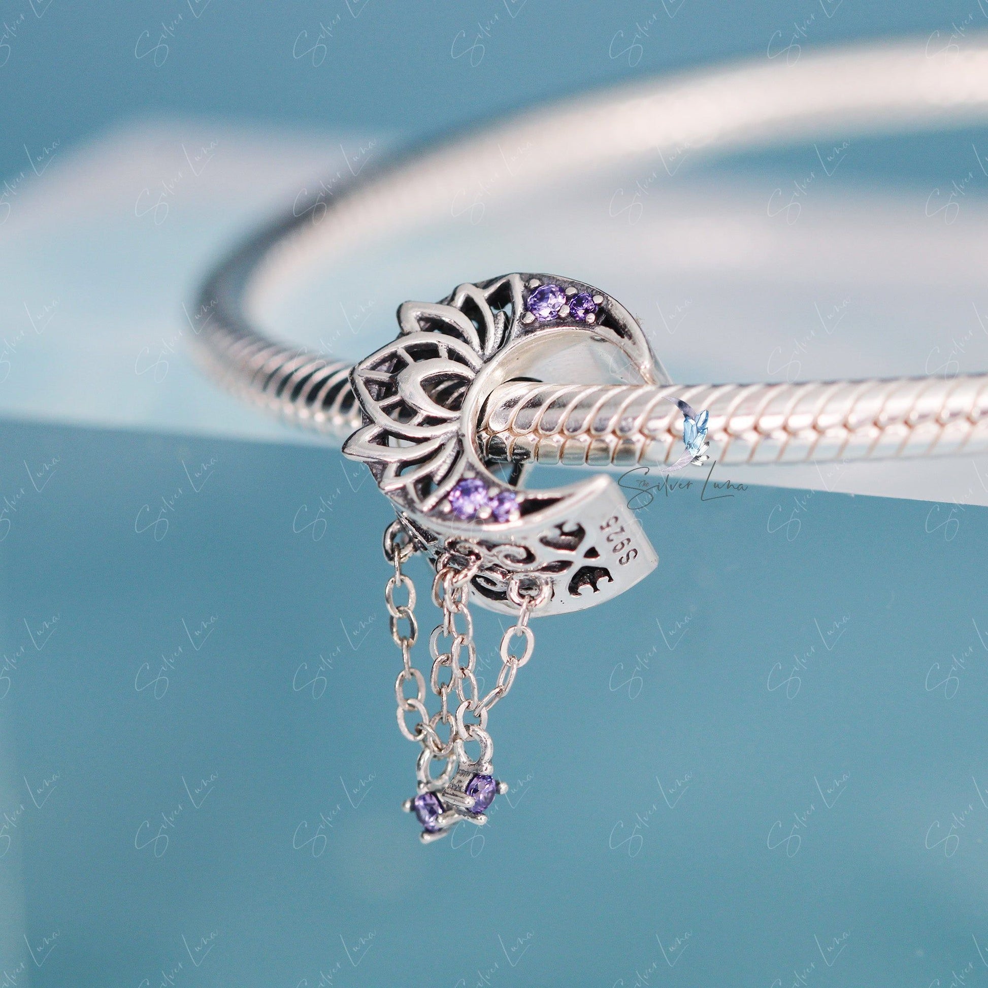These elegant lotus crescent moon charm features lotus design crescent moon with dangle chain, made of solid 925 sterling silver and cubic zirconia. Add these elegant crescent moon pendant charm to your existing charm bracelet or necklace or as gift for your love one.