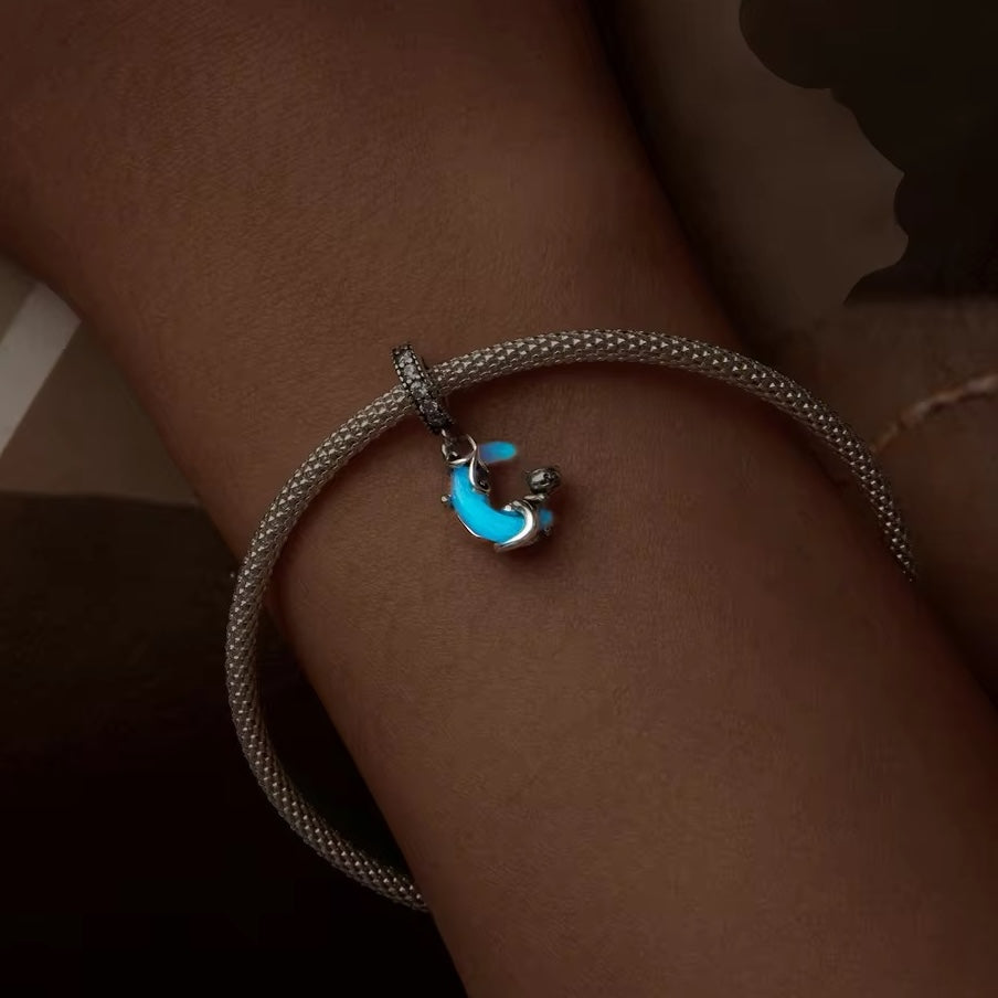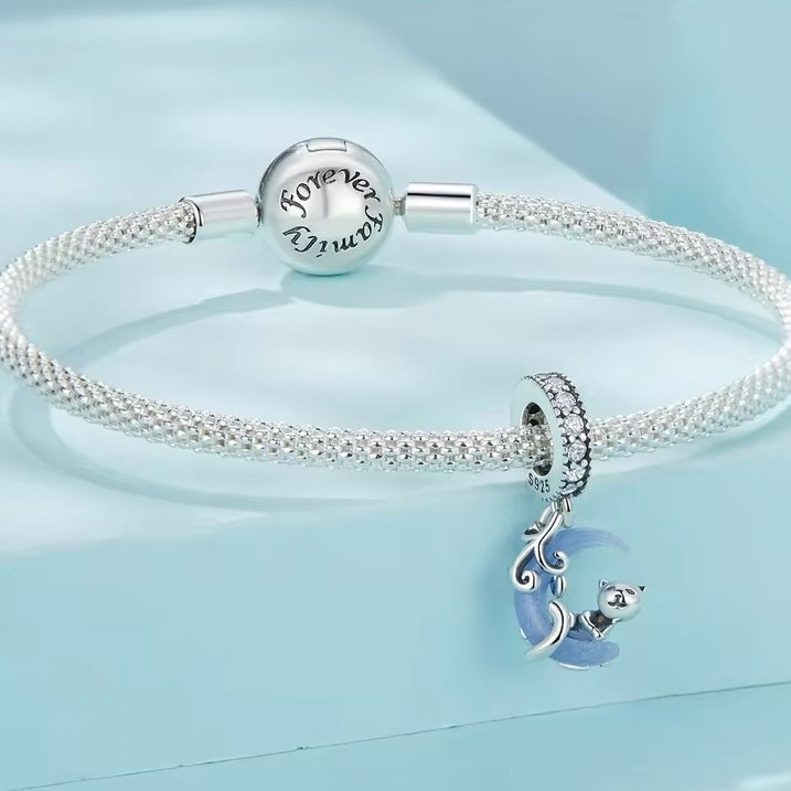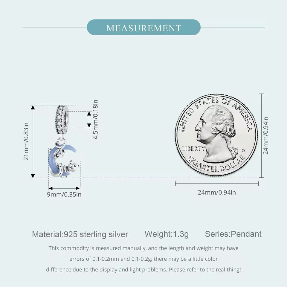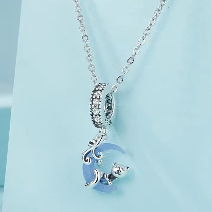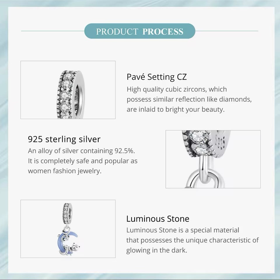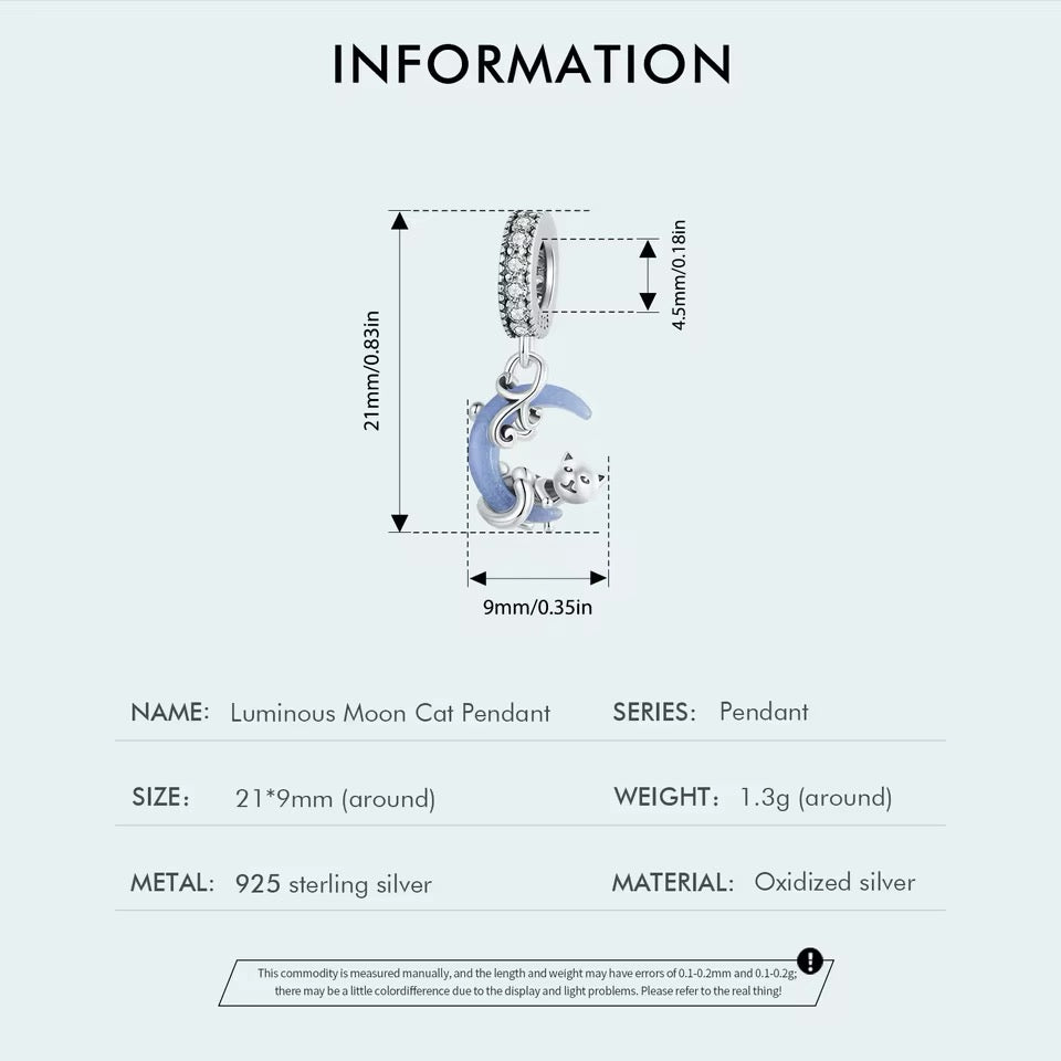 This stunning pendant charm features a luminous cat gracefully hanging on a moon, crafted in 925 sterling silver. Perfect for adorning any pendant or necklace, it's a unique and charming addition to any jewelry collection. Glow in the dark and let your inner spirit animal shine bright!
