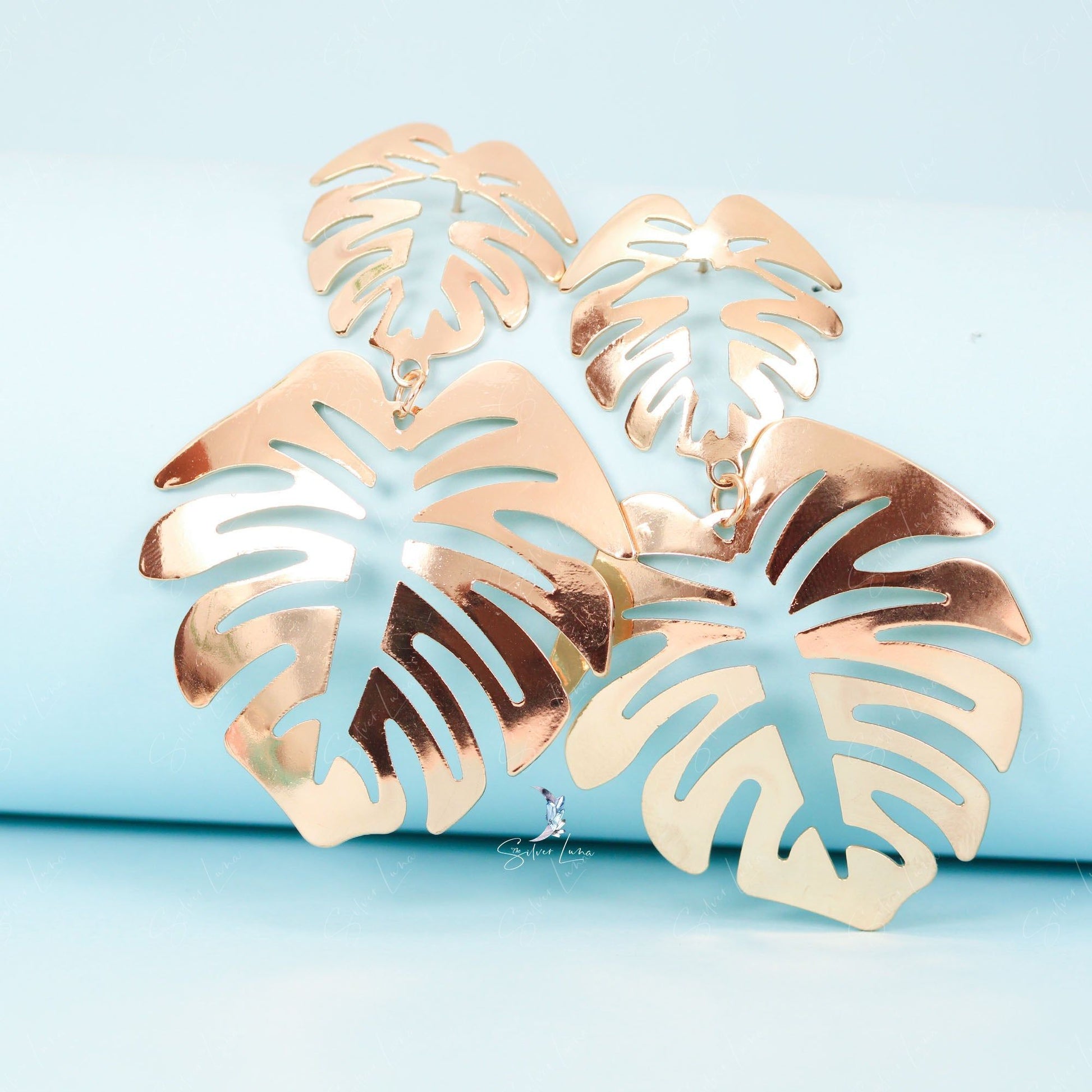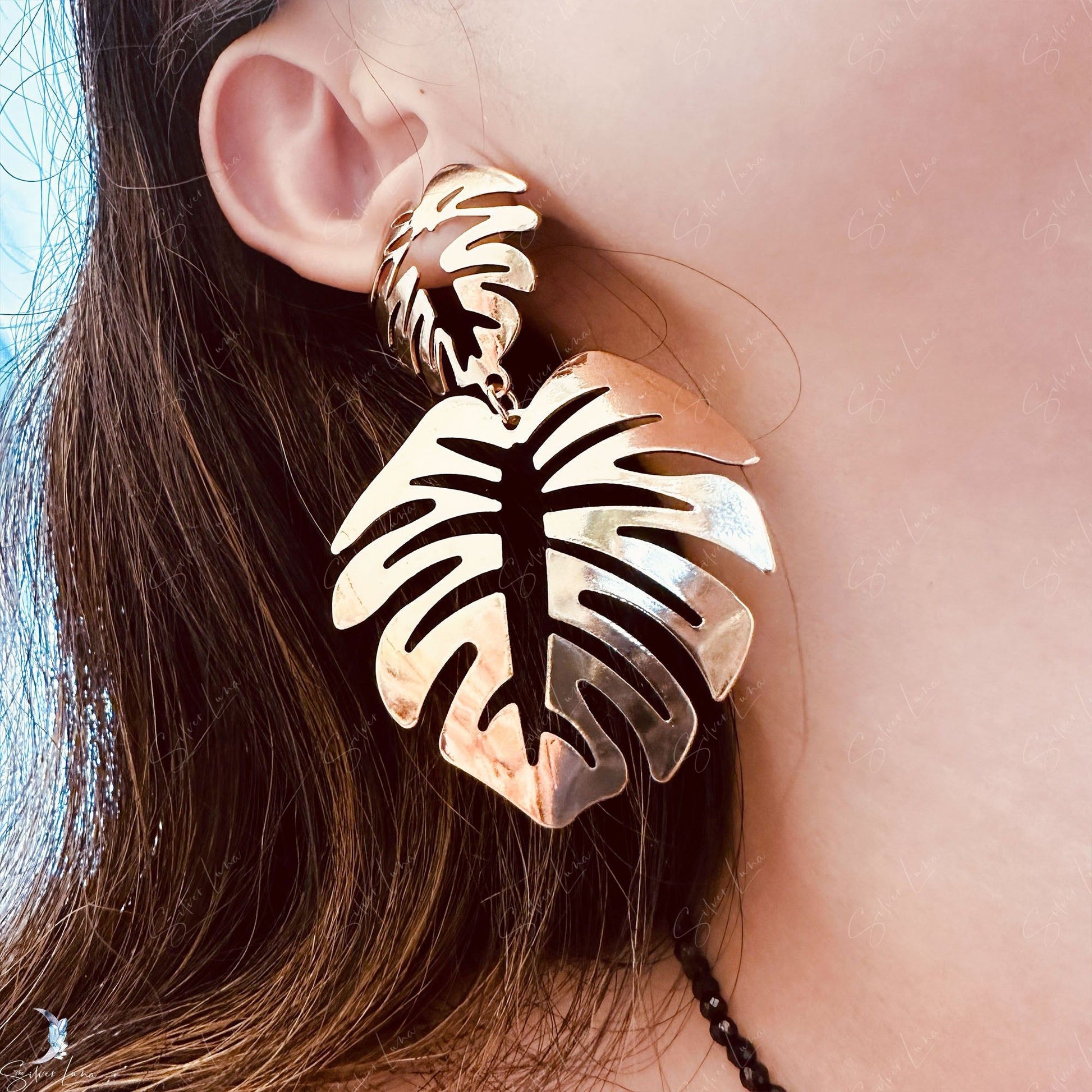 Monstera leaves metal statement dangle drop earrings