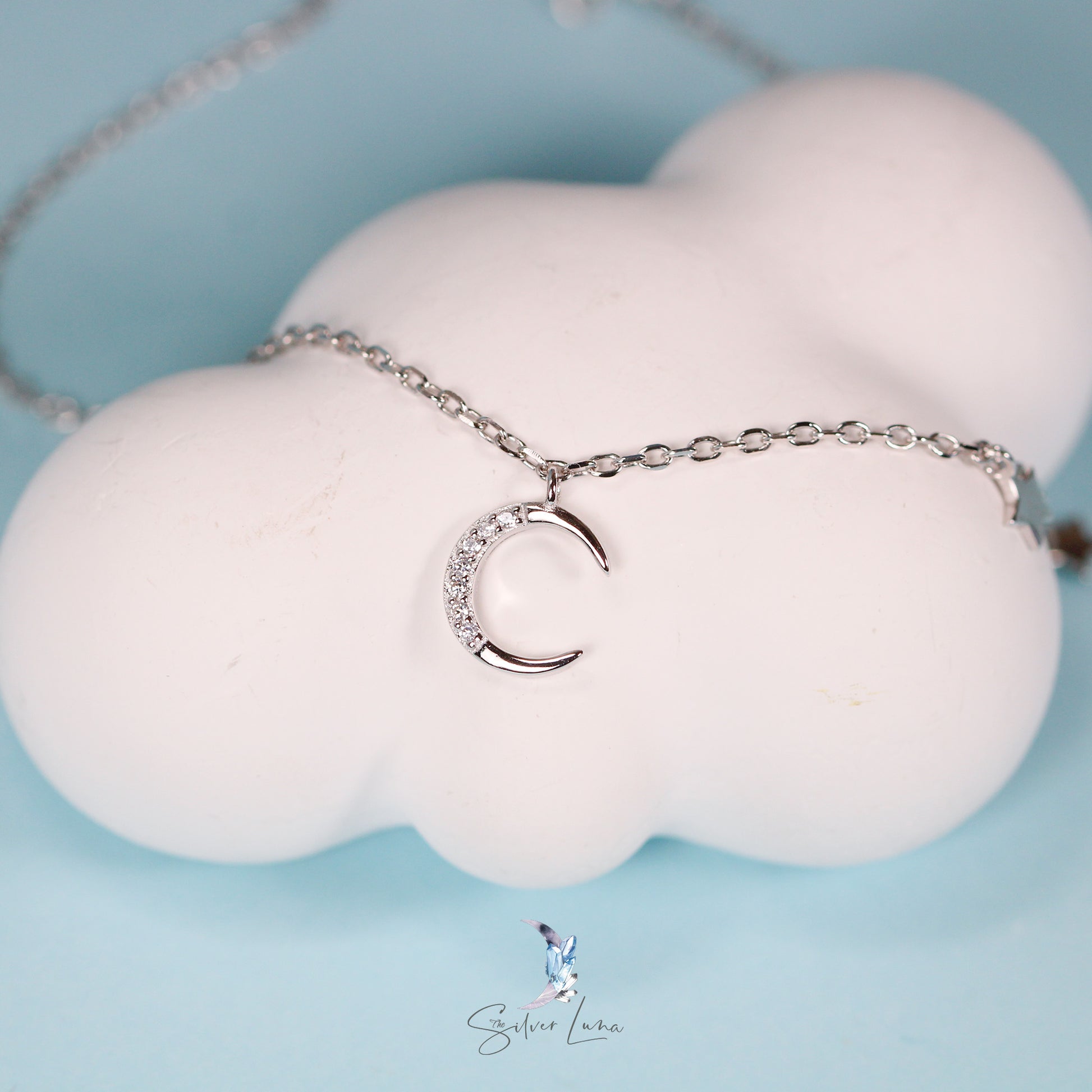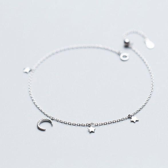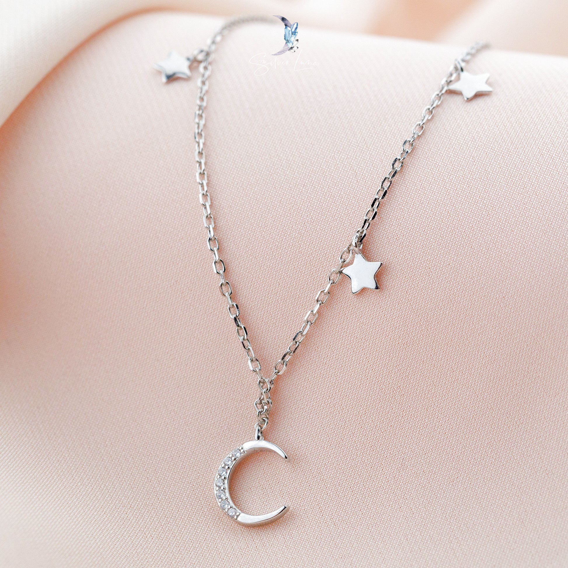 This stylish anklet boasts an adjustable ball hook (complete with a silicon plug) that allows for easy sizing. It showcases an elegant crescent moon charm adorned with a sparkling cubic zirconia stone and delicate dangling star charms. Made of premium 925 sterling silver with platinum plating, ensuring a luxurious appearance and durable shine.