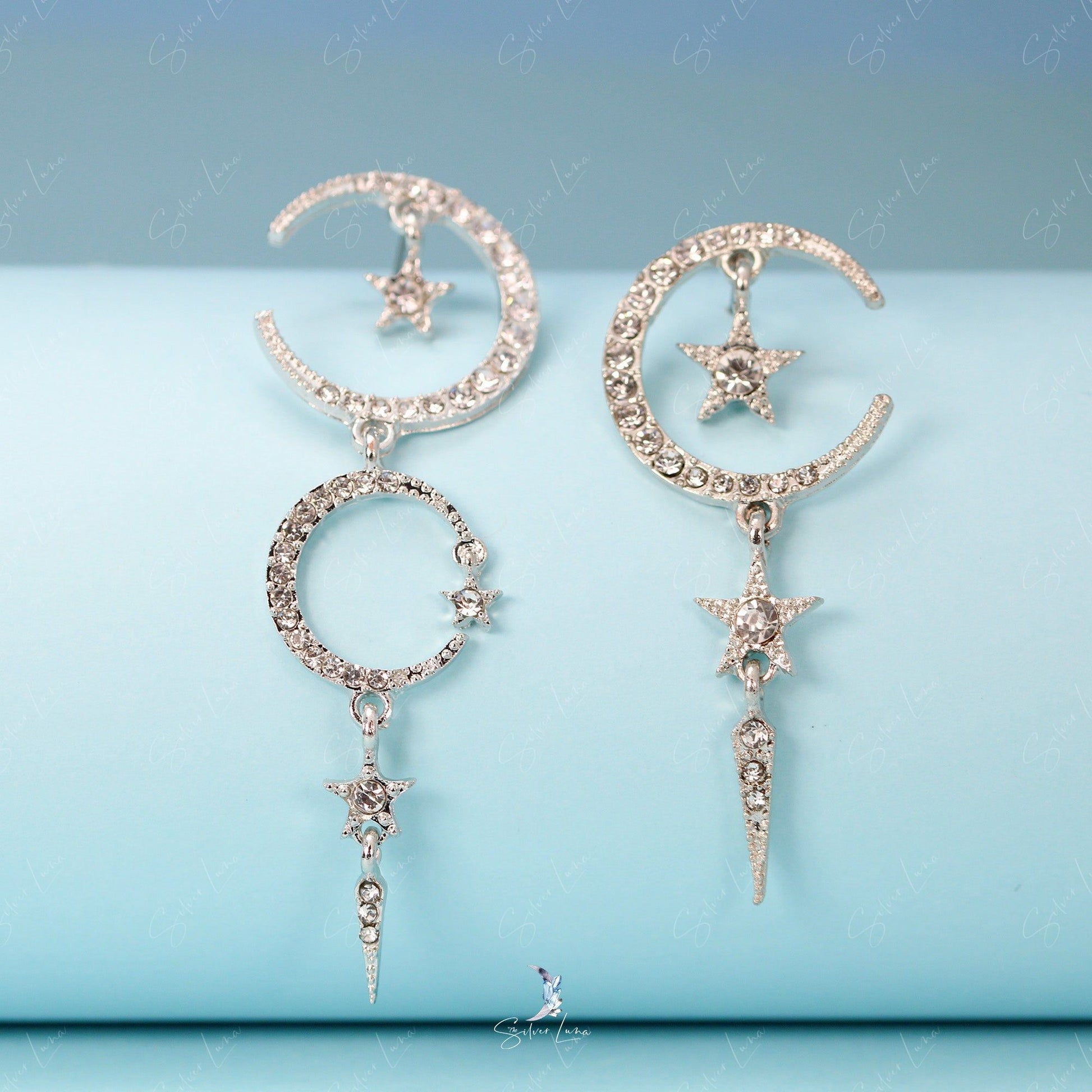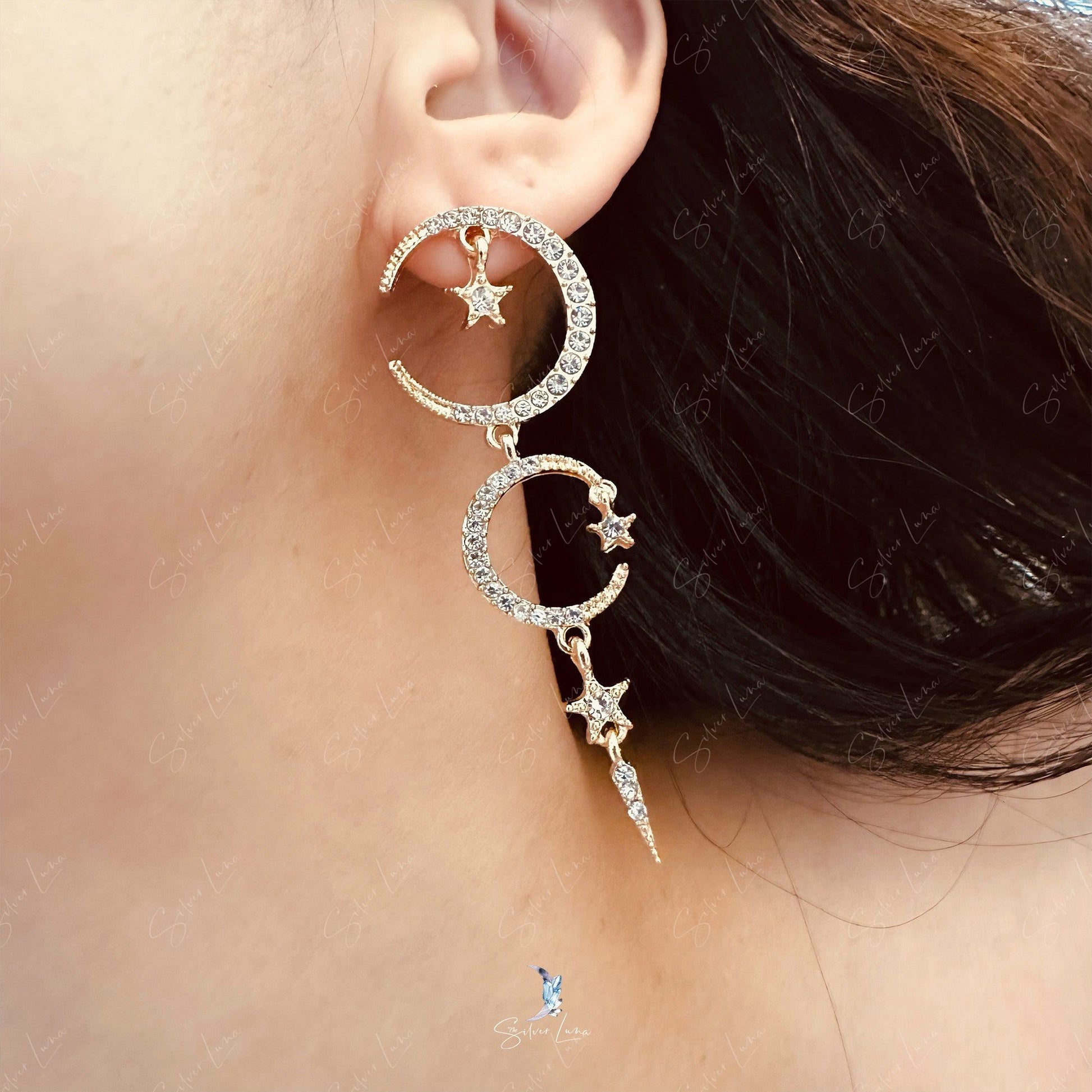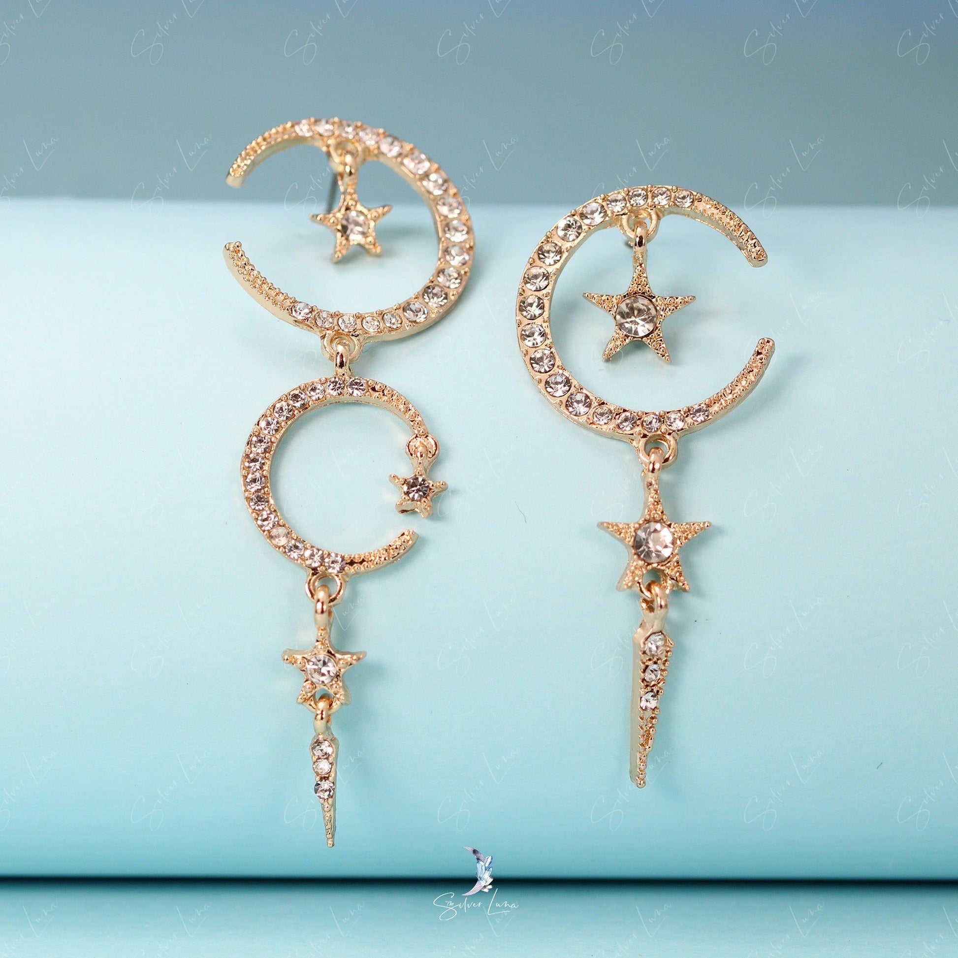 These beautiful statement fashion earrings features the golden color crescent moon and star dangle asymmetric design. Dazzling, charming, elegant design, these celestial earrings will sure mare a statement. Add this to your fashion jewelry collection and match with your favorite outfit, you will look charming for a night out.
