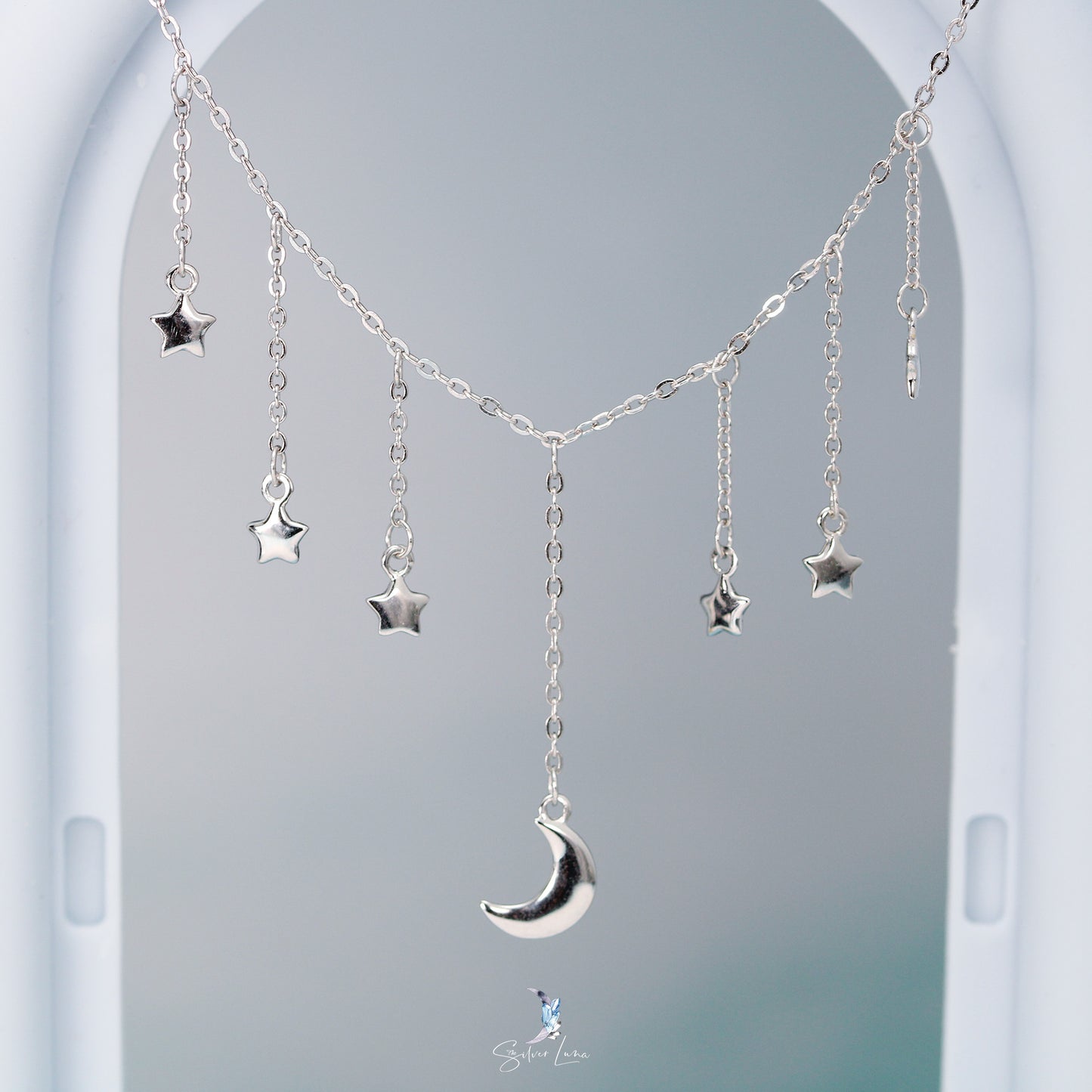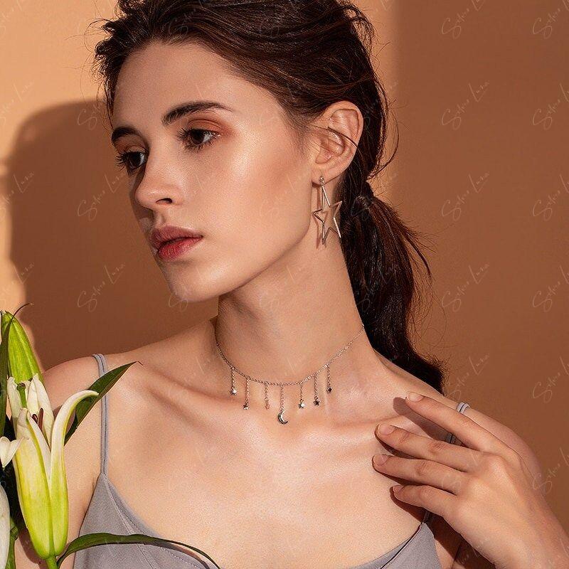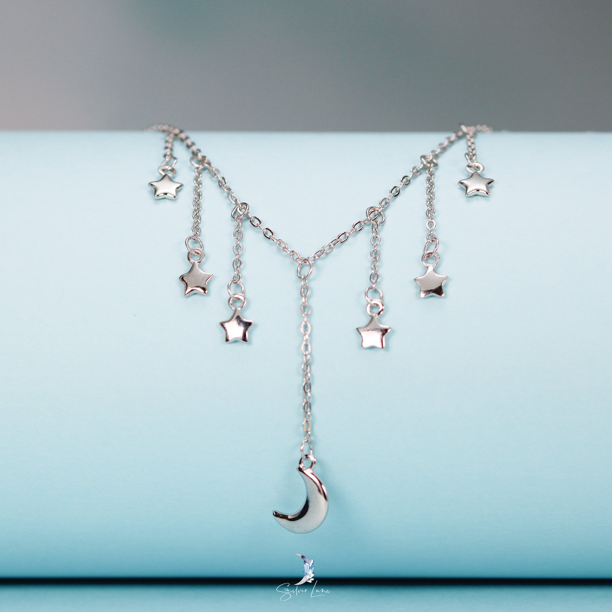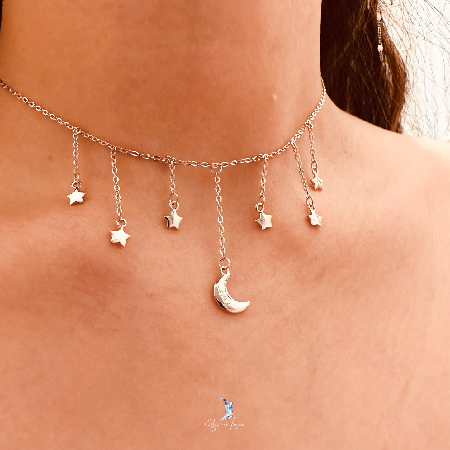 Indulge in the stunning beauty of this exquisite choker necklace, adorned with a dangling moon and star charm on a delicate cable chain. Crafted from durable 925 sterling silver and coated in platinum, this accessory radiates a luxurious shine that will endure over time. Elevate your fine jewelry collection with this celestial pendant choker or gift it to a cherished loved one.