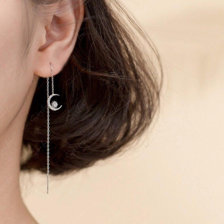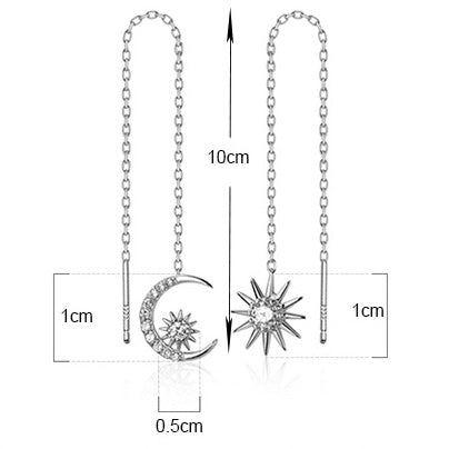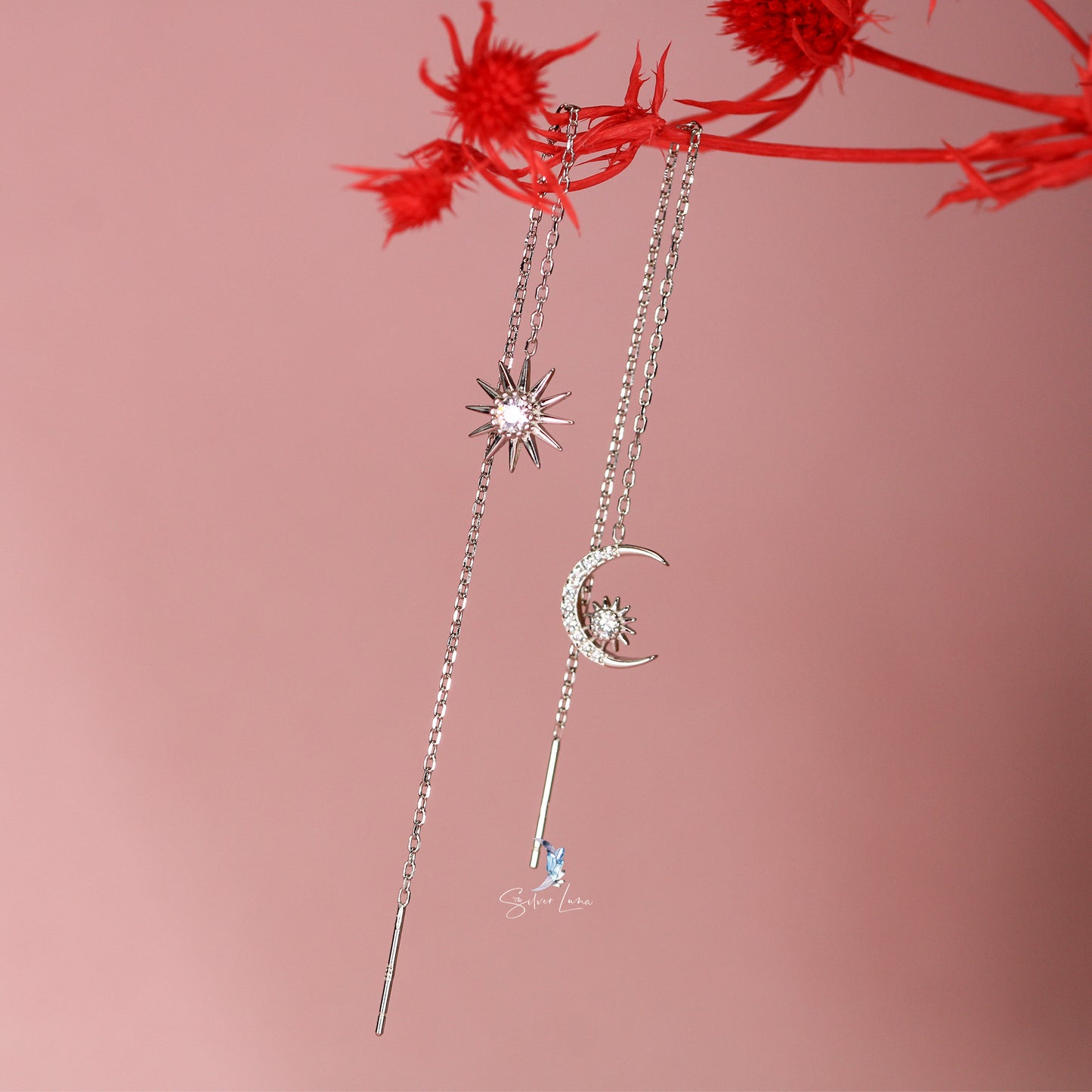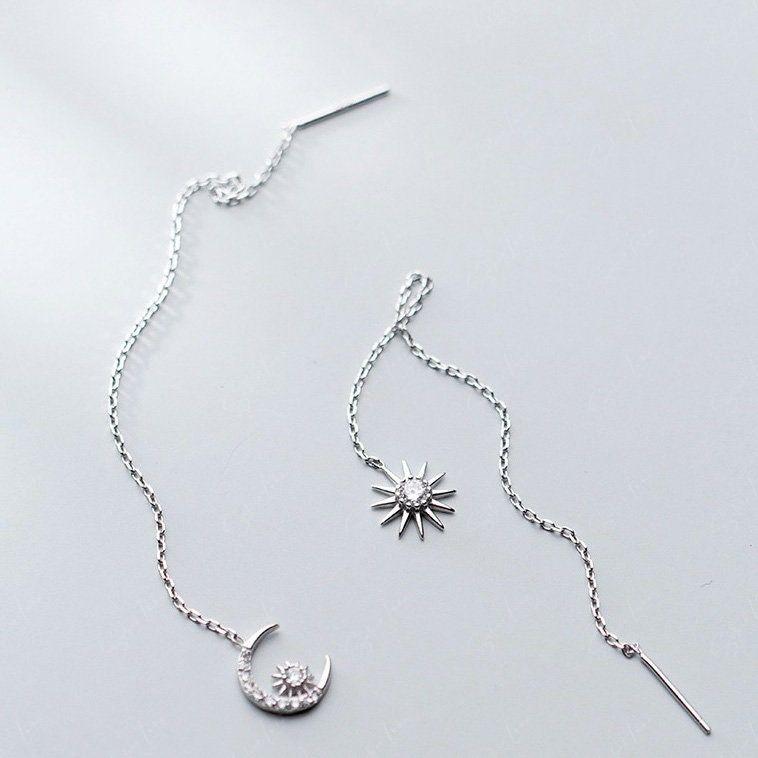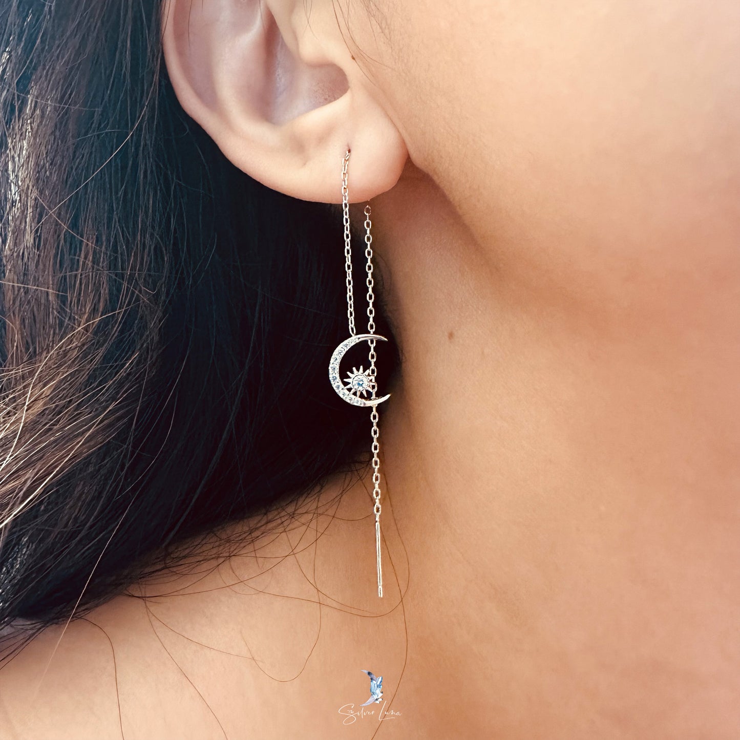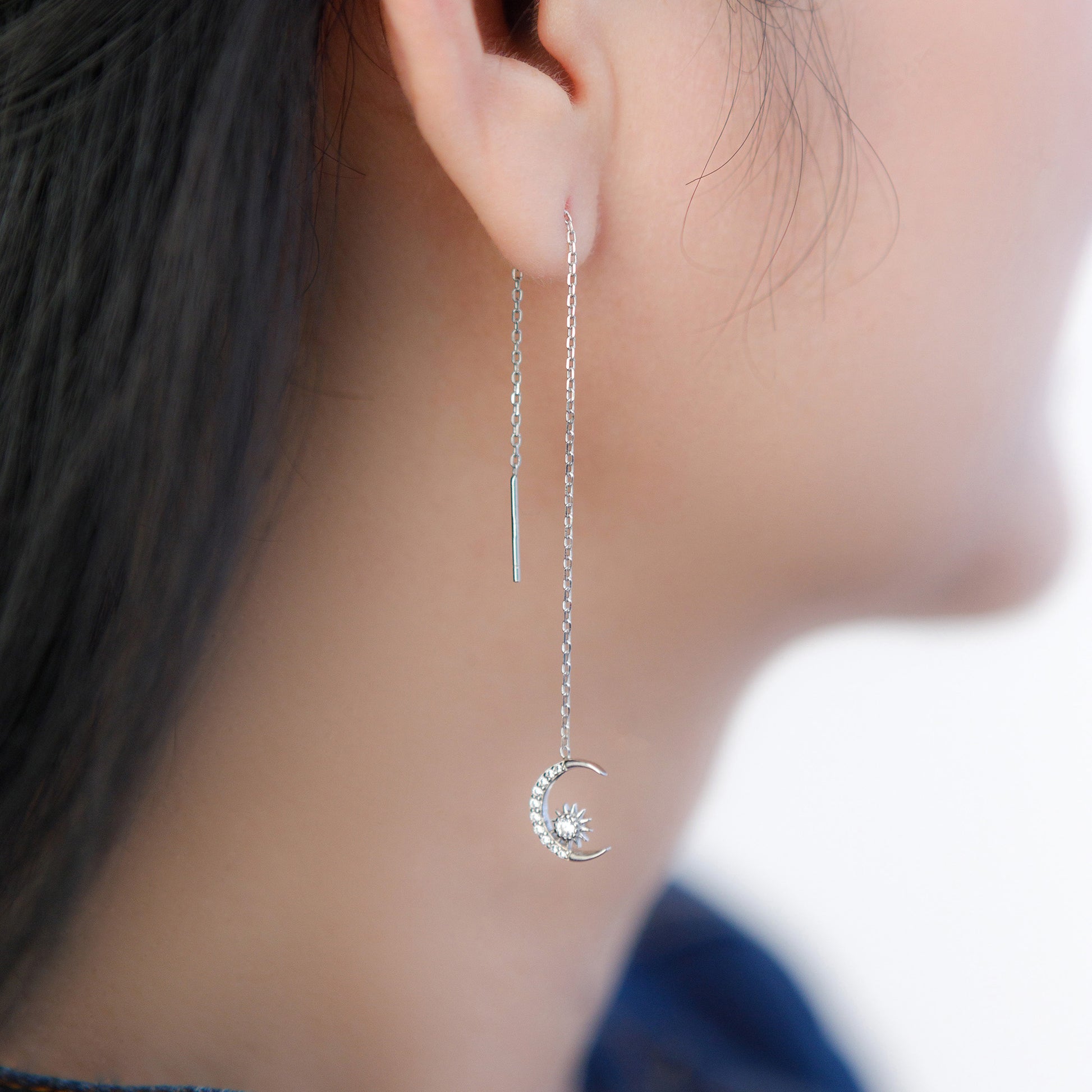 Discover the allure of these asymmetric Sun and Moon ear threader earrings, adorned with a delicate celestial design of shimmering cubic zirconia. Crafted from premium 925 sterling silver and finished with a luxurious platinum plate, these earrings are both lightweight and comfortable for everyday wear. Elevate your fine jewelry collection or surprise a loved one with these charming and elegant earrings.