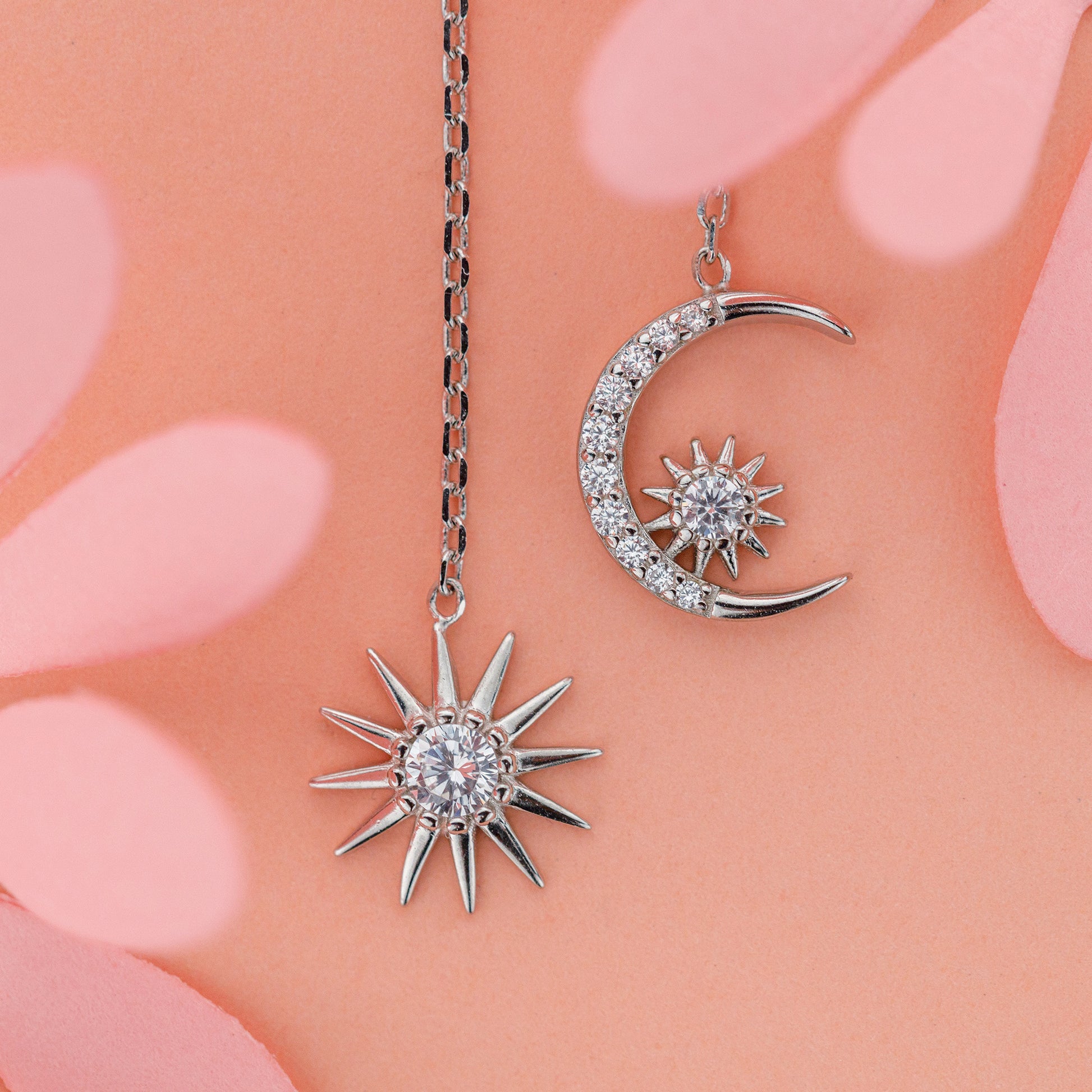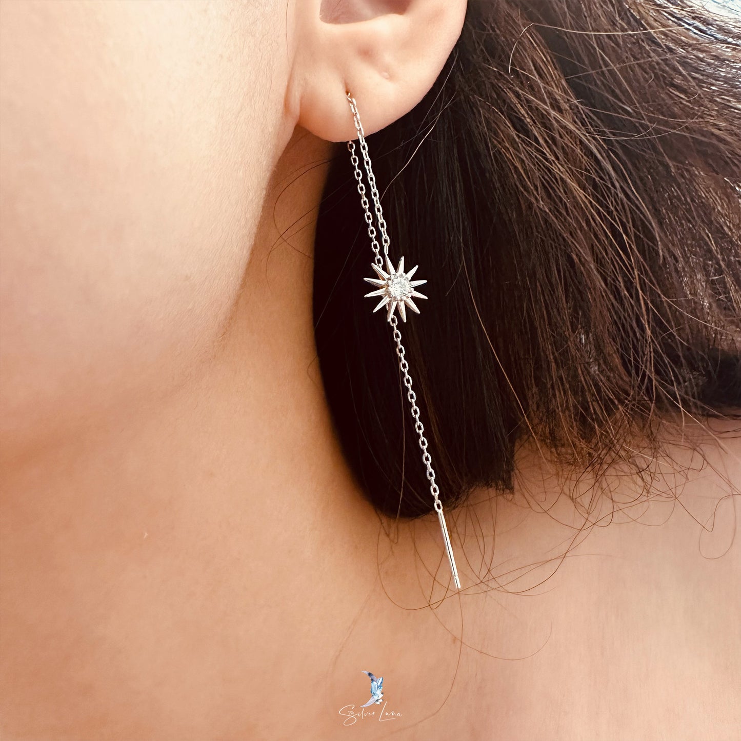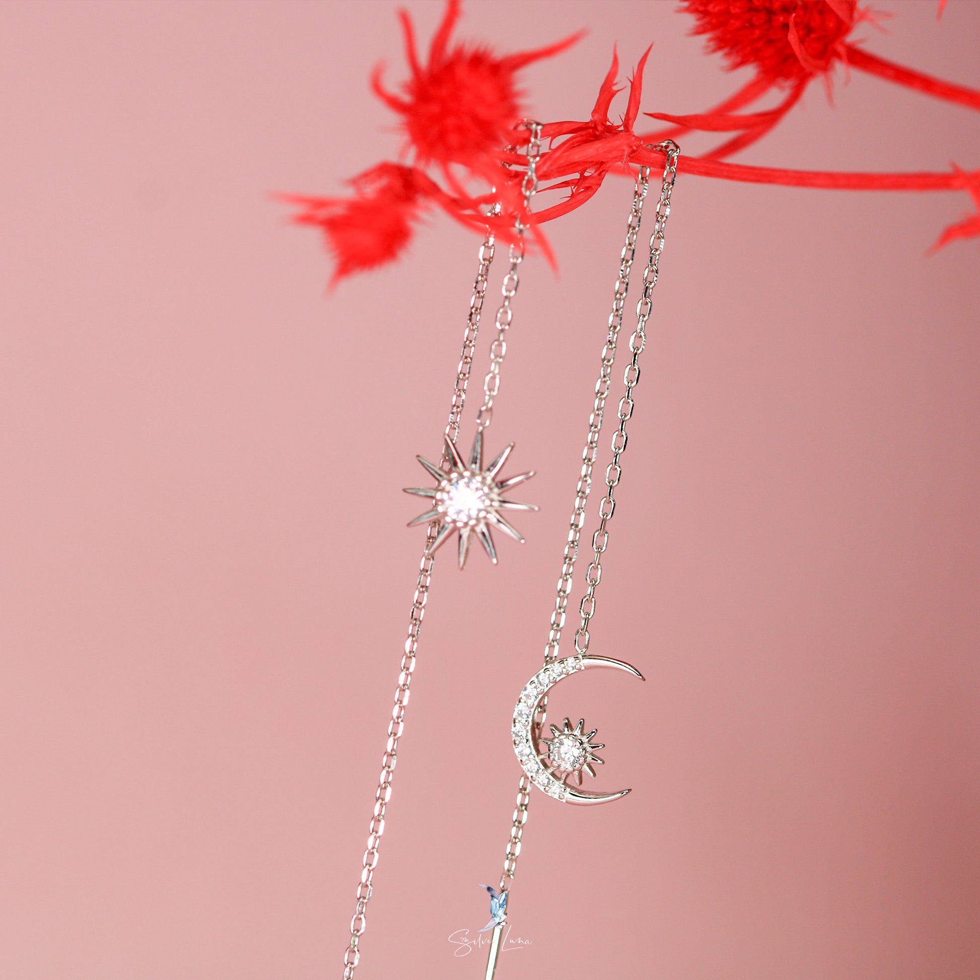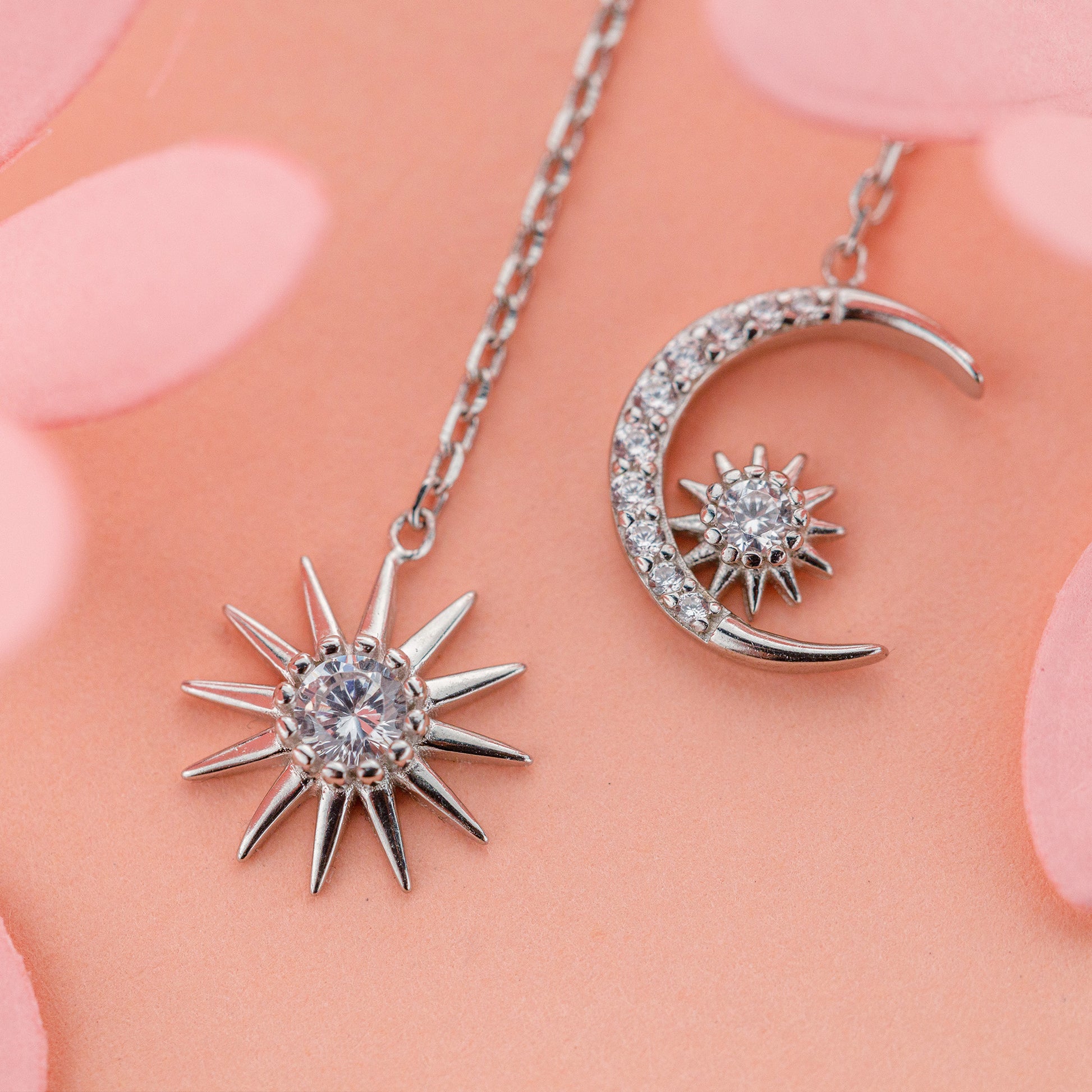 Discover the allure of these asymmetric Sun and Moon ear threader earrings, adorned with a delicate celestial design of shimmering cubic zirconia. Crafted from premium 925 sterling silver and finished with a luxurious platinum plate, these earrings are both lightweight and comfortable for everyday wear. Elevate your fine jewelry collection or surprise a loved one with these charming and elegant earrings.