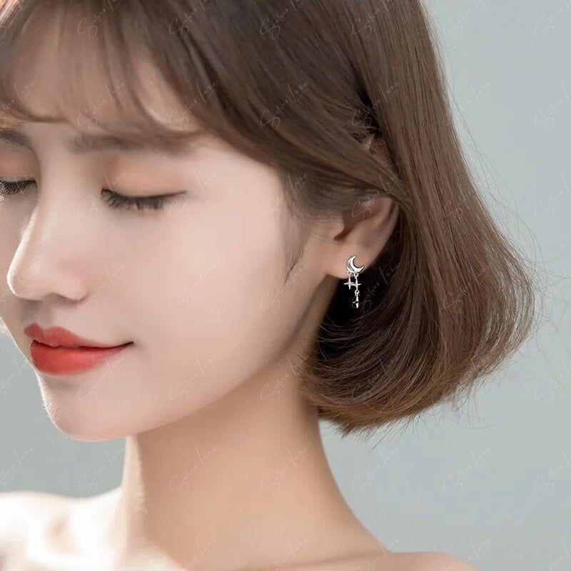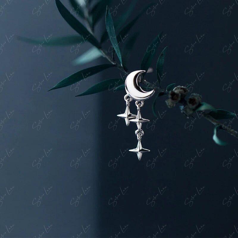 These cute dainty moon and stars stud earrings features a cute crescent moon and a trail of stars drop, made of solid 925 sterling silver and platinum plating. Add these elegant moon and stars stud drop earrings to your everyday fine jewelry collection or as a gift for your love one.