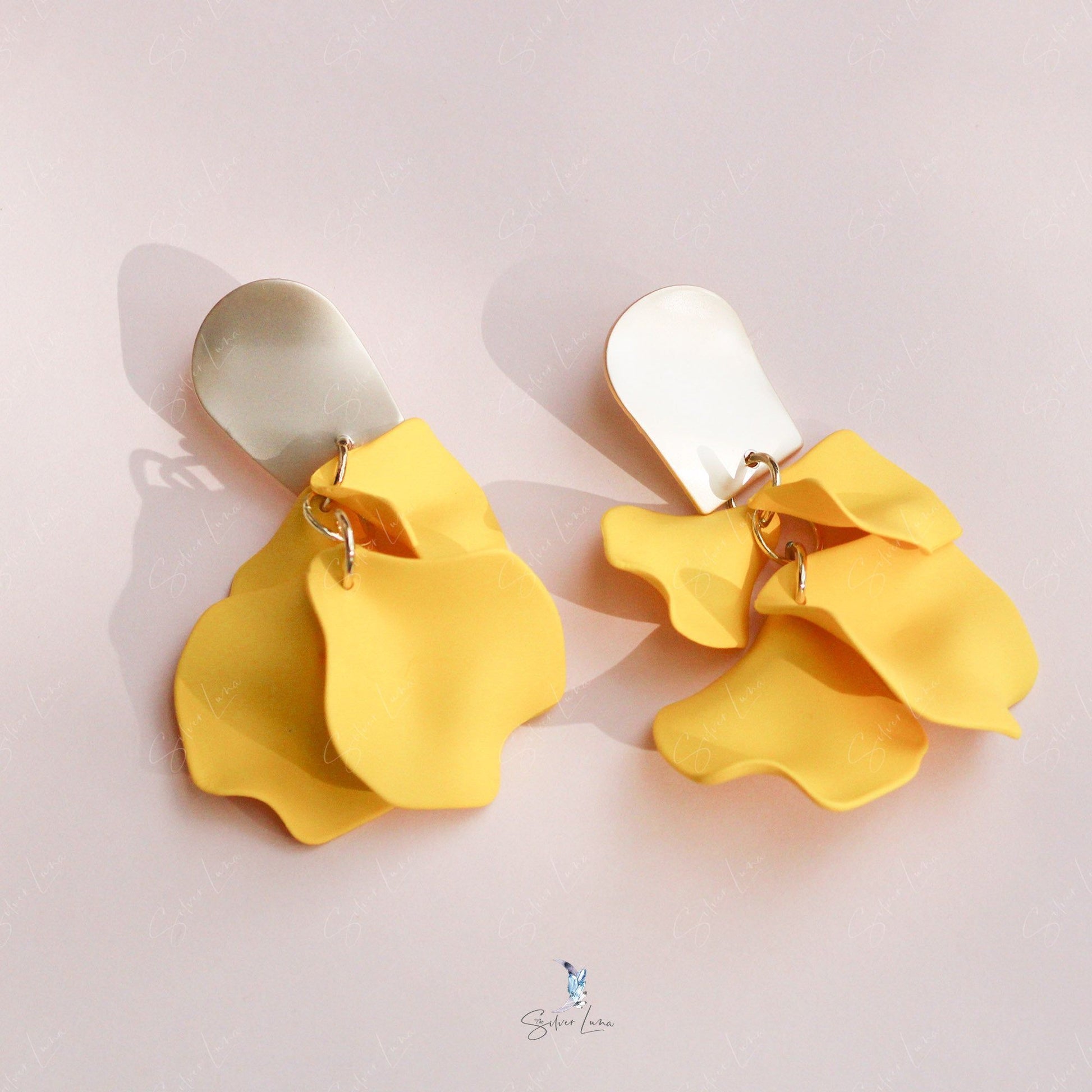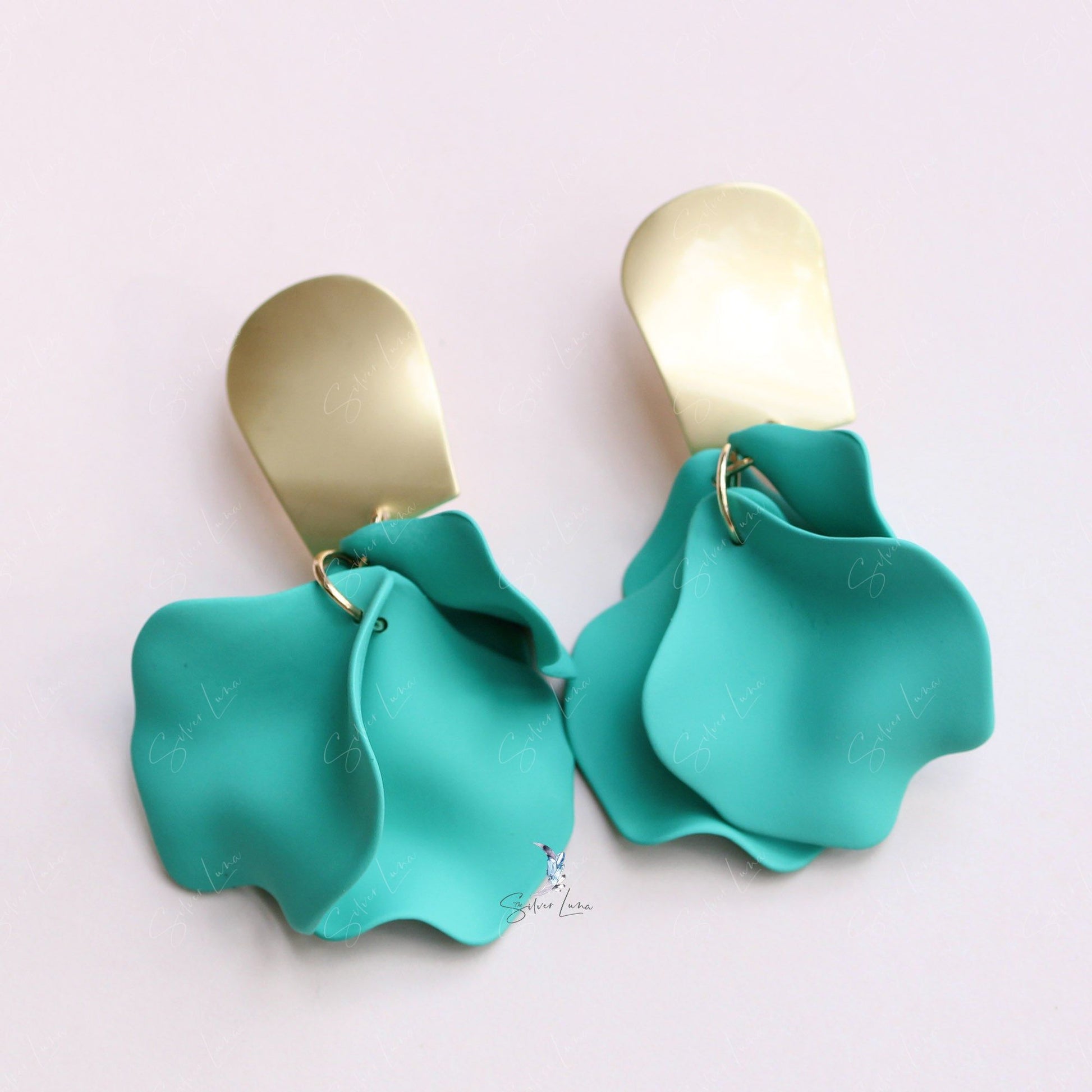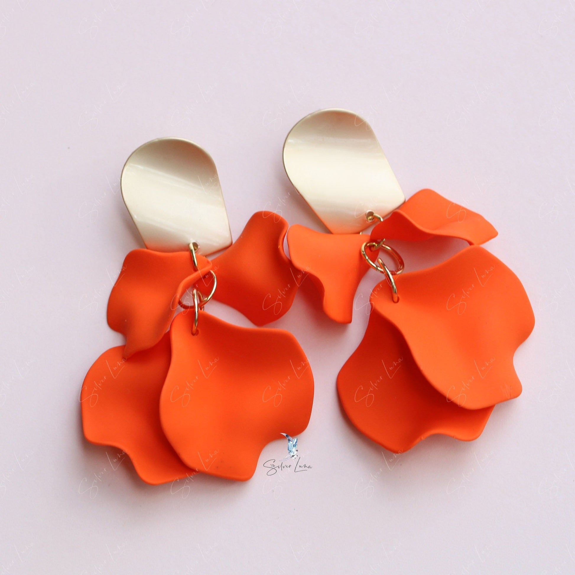These colorful petal dangle drop fashion earrings feature acrylic spray paint colorful flower petal, light weight and comfortable to wear. Add unique statement on your fashionable outfit with these rose flower petal dangle drop earrings.