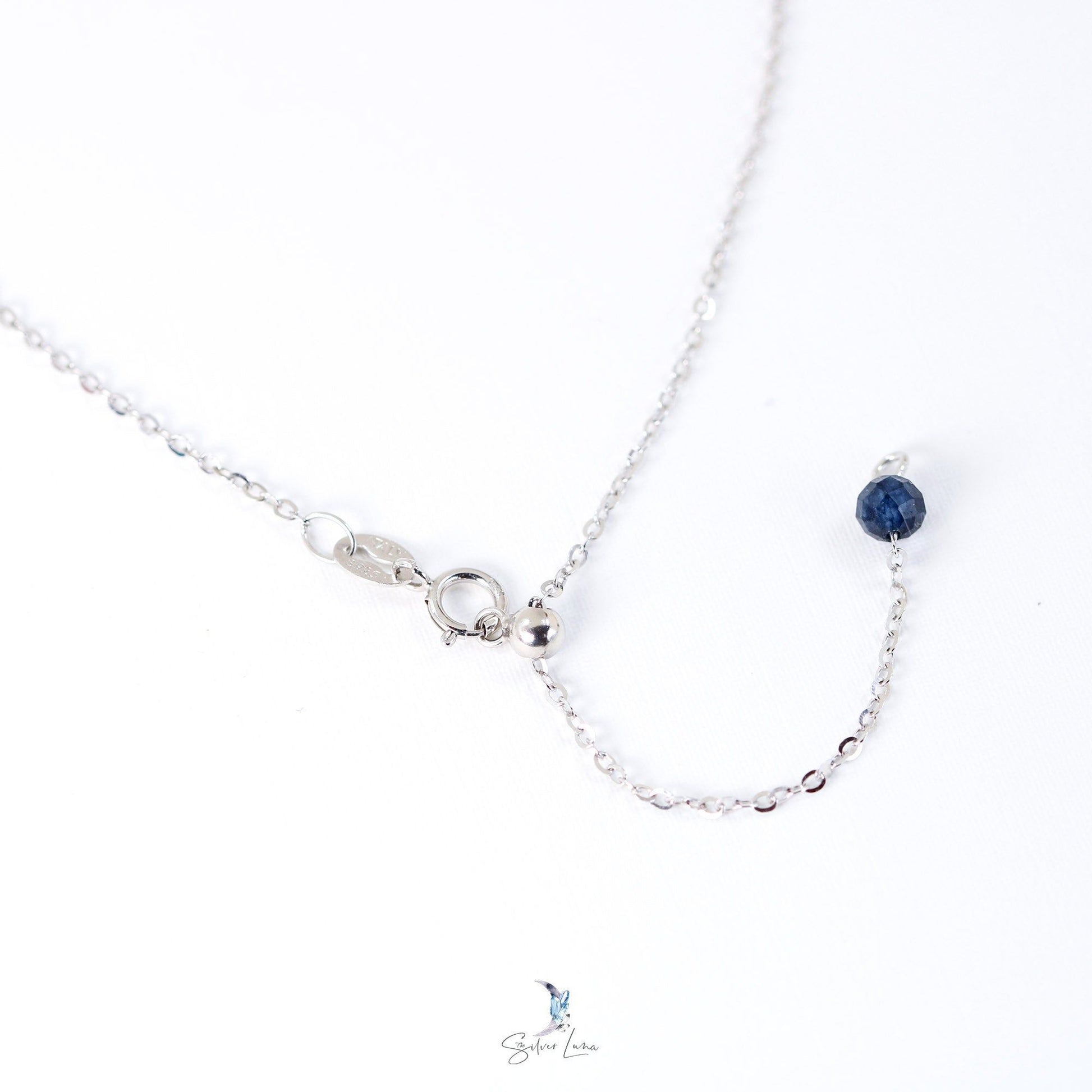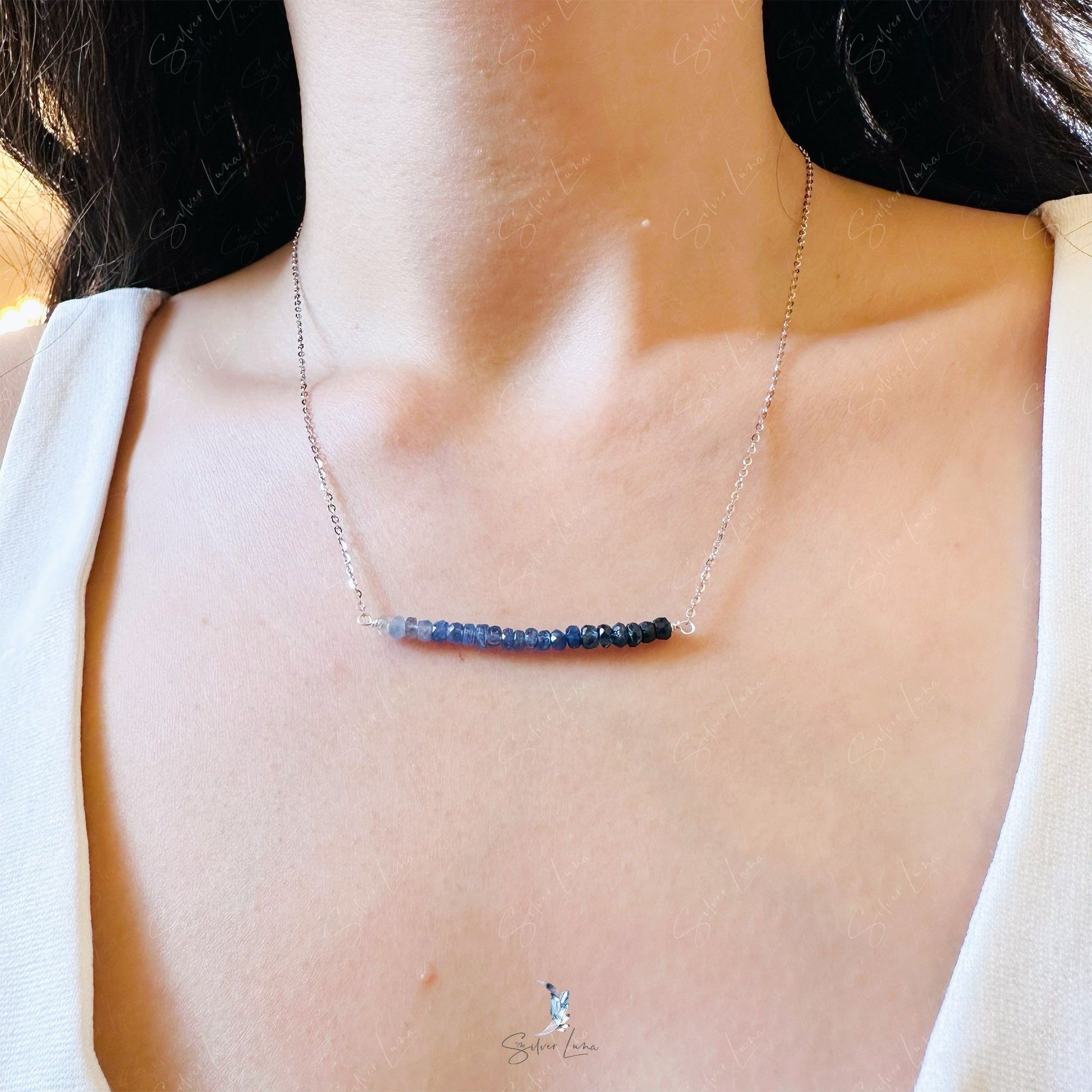 This exquisite blue sapphire beaded gemstone row silver necklace showcases a stunning gradient of color using small faceted Rondelle beads on a cable chain and silver wires. From light to dark blue, these beads create a one-of-a-kind statement piece that is perfect for adding to your fine jewelry collection or gifting to someone special. Elevate your everyday look with this alluring and unique blue sapphire necklace.