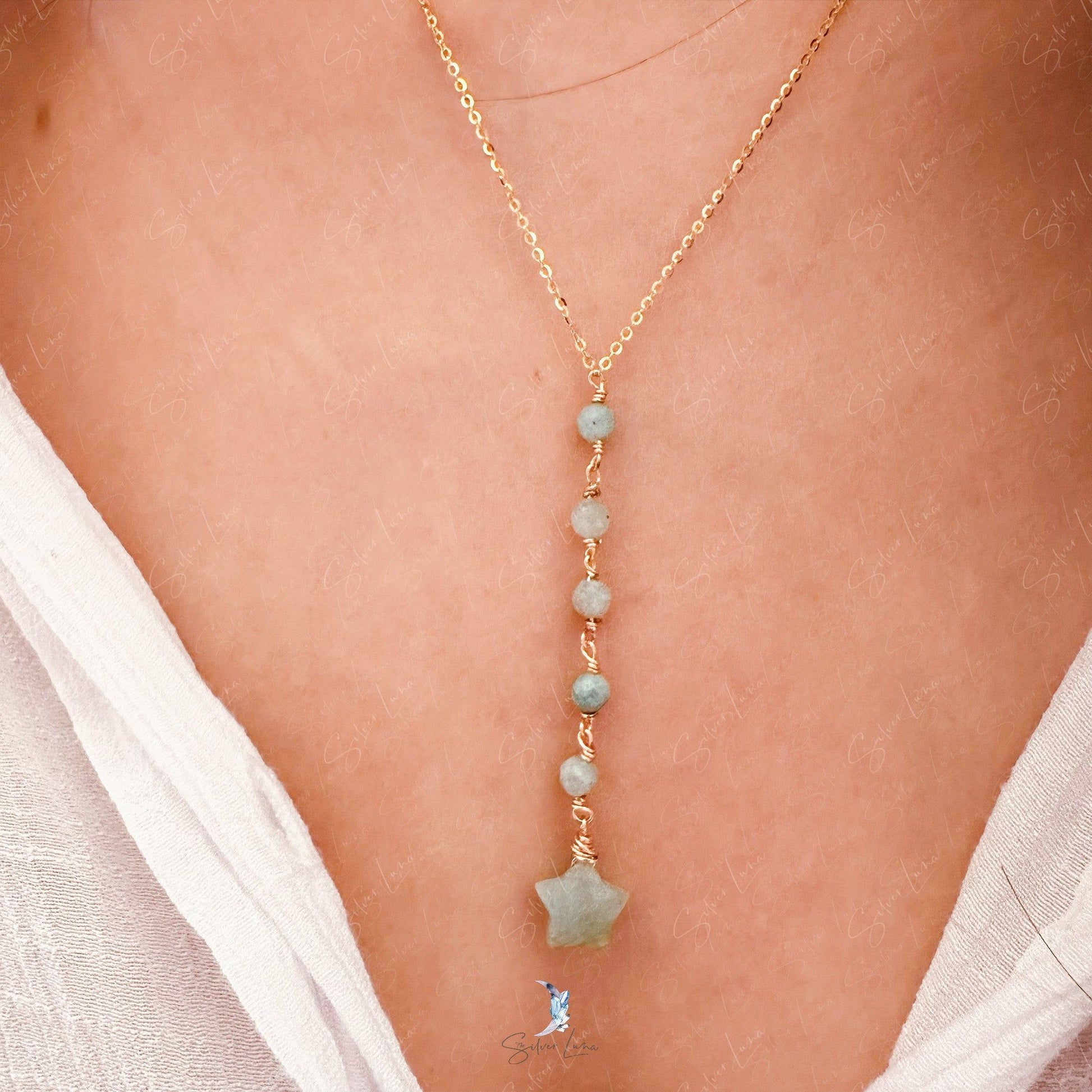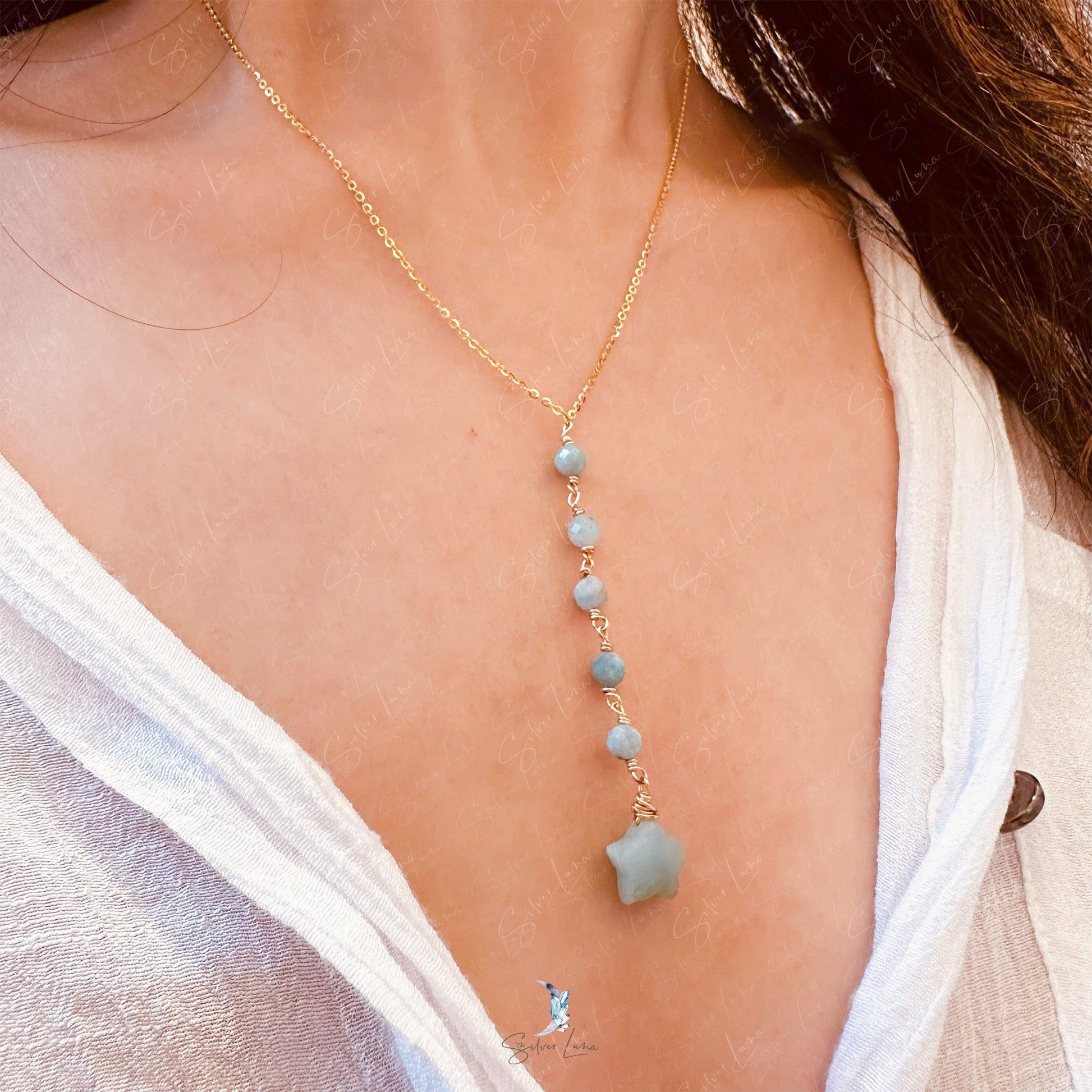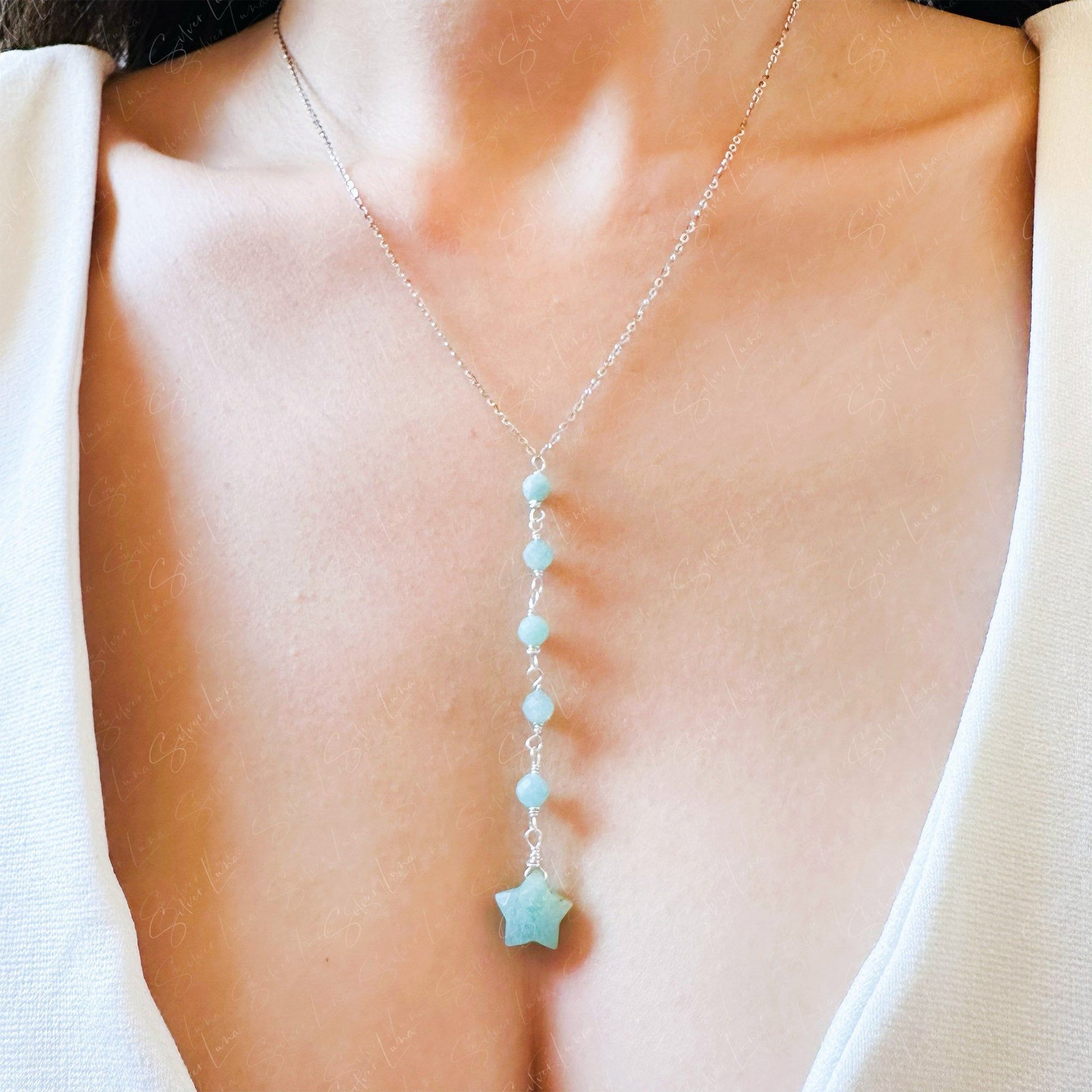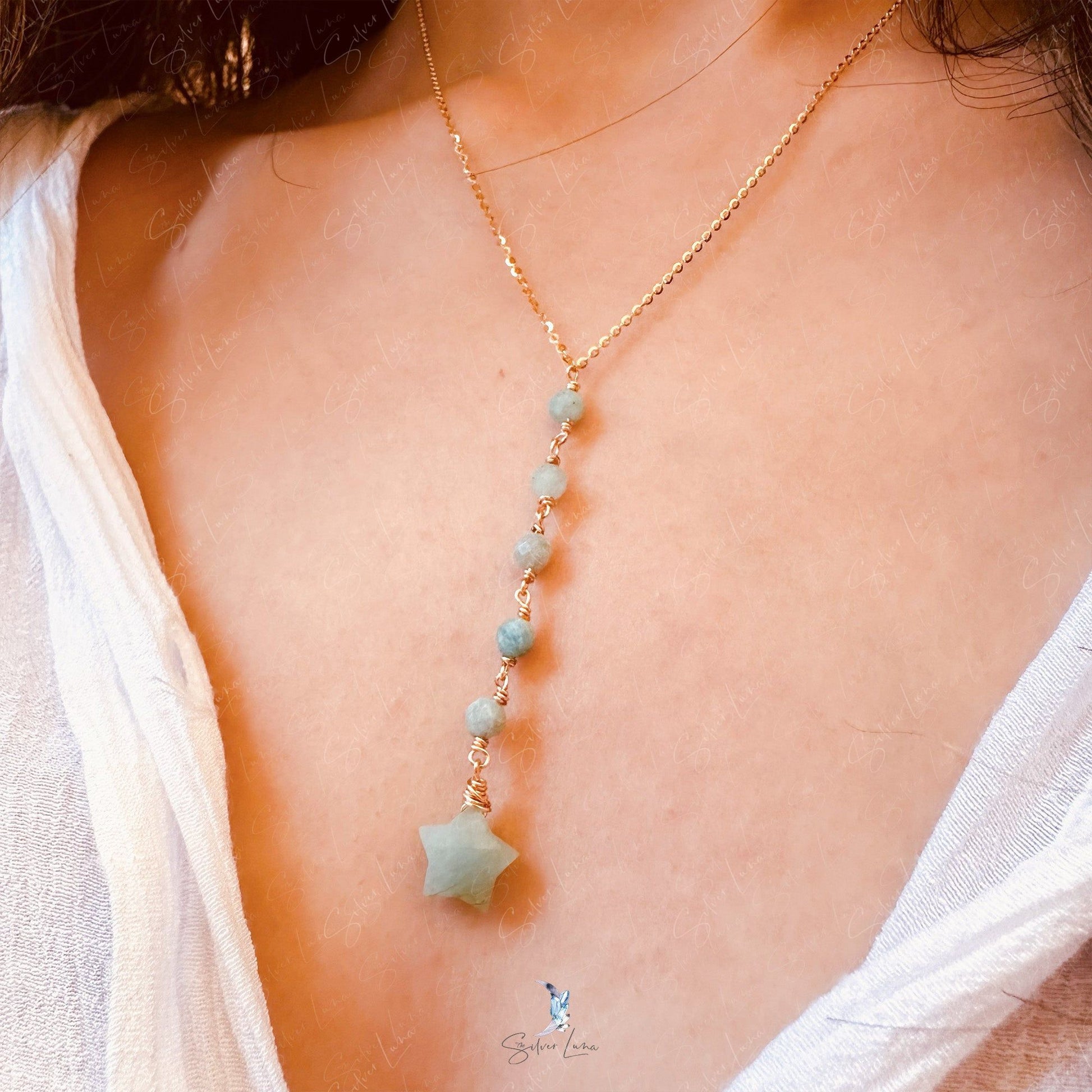 Indulge in the mesmerizing beauty of the Natural star Amazonite lariat pendant necklace. Featuring a string of 4 mm faceted green Amazonite beads and a stunning carved star-shaped Amazonite drop, this necklace is a must-have for any jewelry collection. Whether as a personal accessory or a thoughtful gift, this unique piece will surely captivate and enchant.