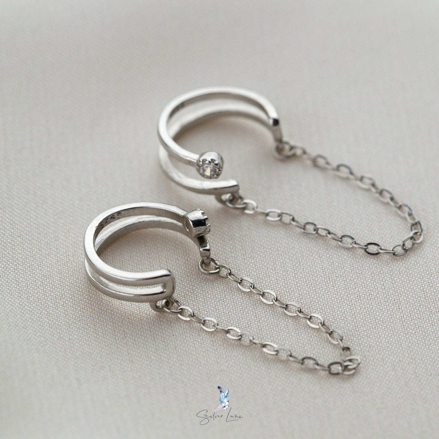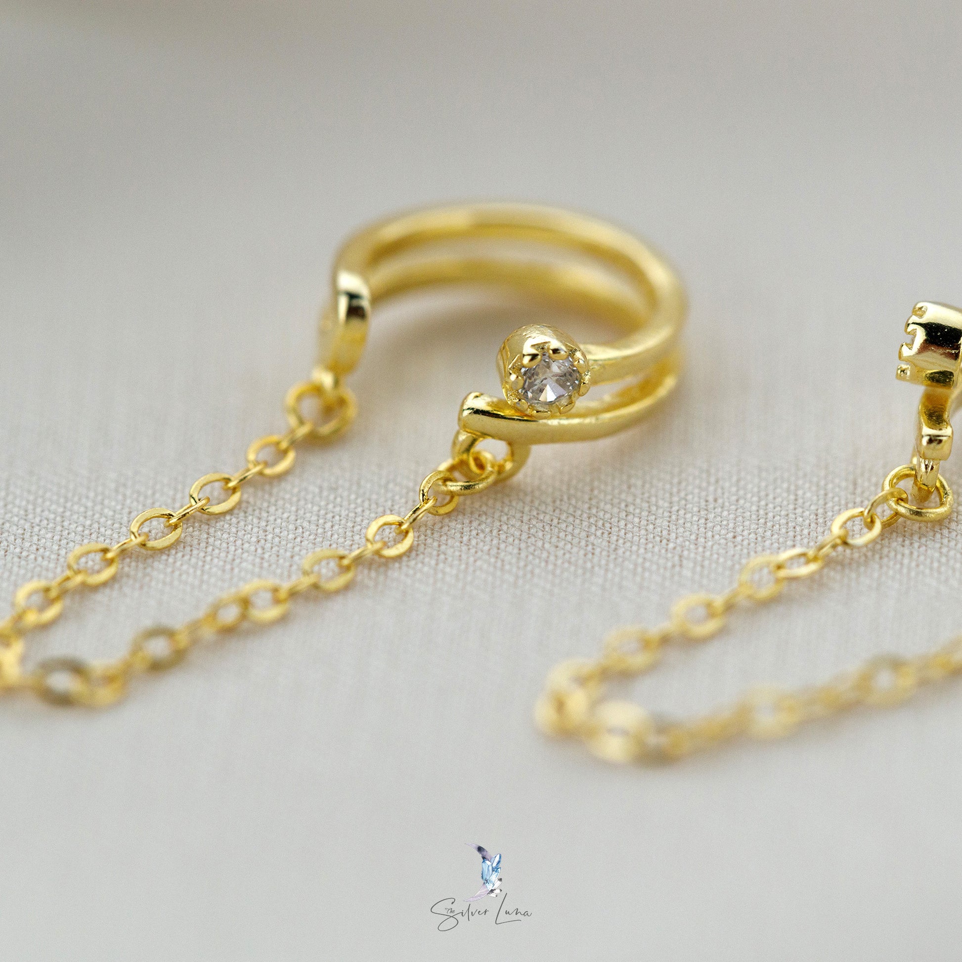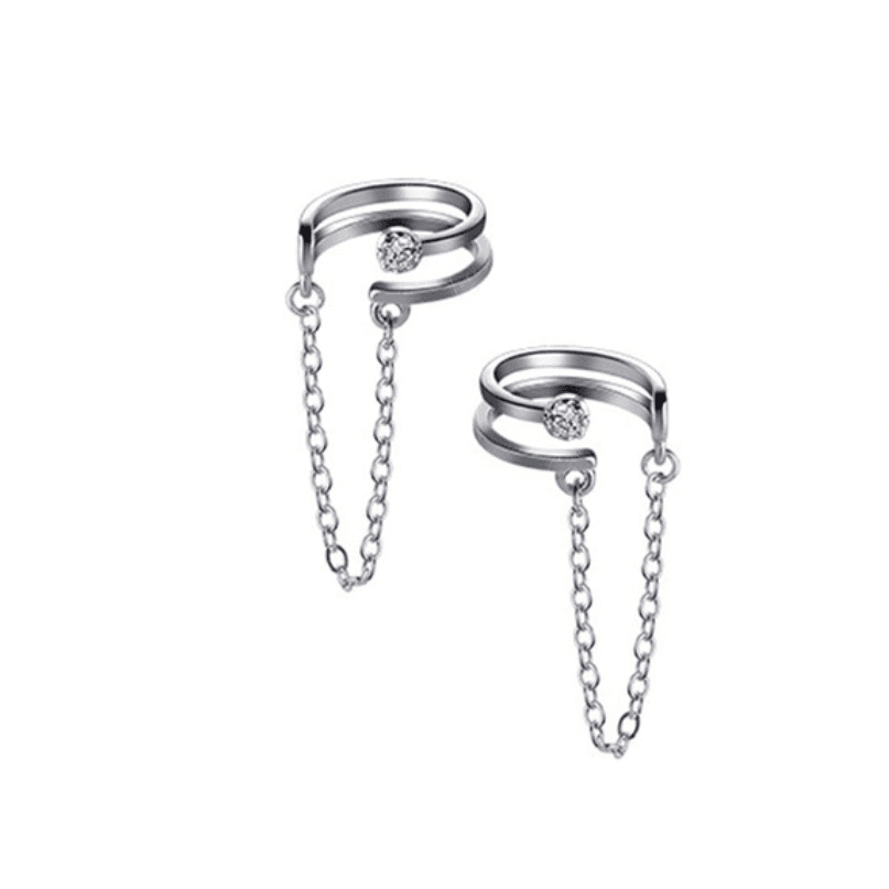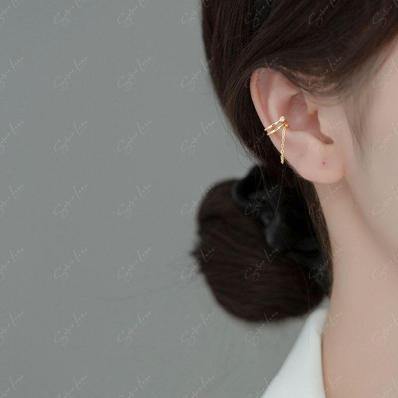 These cute, dainty ear cuff features double cuff with cubic zirconia stone and a dangle chain, made of solid 925 sterling silver, come in silver and gold color. Get the perfect balance of elegance and edge with these stunning non-piercing ear cuffs. Featuring a double cuff design with a sparkling cubic zirconia stone and a delicate dangle chain, these cuffs are crafted from high-quality 925 sterling silver in your choice of silver or gold. Elevate your style and express your unique personality with these eye-catching ear cuffs