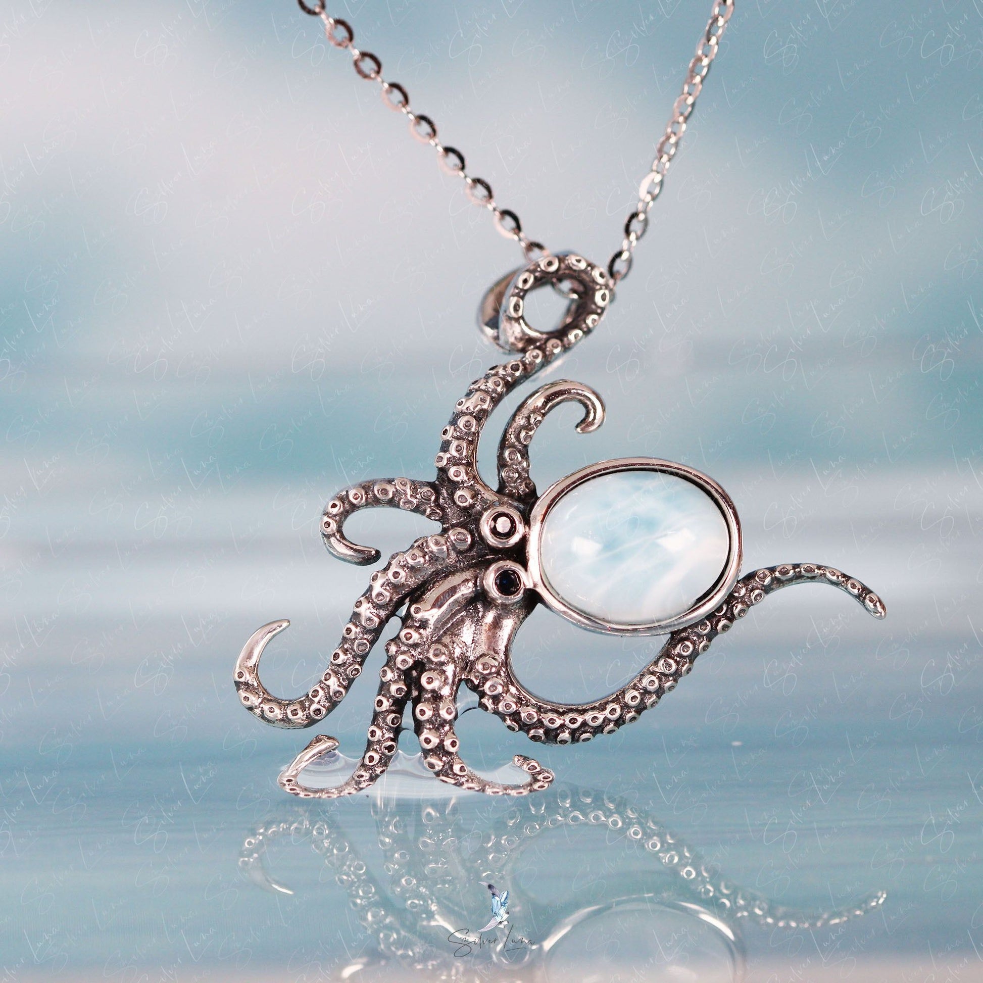 This charming octopus Larimar pendant necklace captures the beauty and mystery of the sea in solid sterling silver and aquamarine Larimar. The sterling silver cable chain fastens securely while the solid 925 sterling silver octopus body forms the perfect setting for the lovely Larimar stone head that evokes the ocean depths. Wear this beautiful and unique octopus necklace to channel the magic of the sea and complement your love of Larimar jewelry and sea animal-inspired designs. The necklace makes a perfect gift for those who dream of the ocean and appreciate stylish marine-themed accessories.