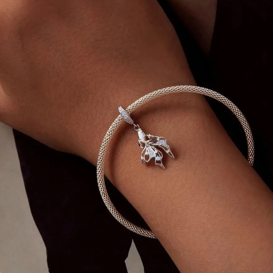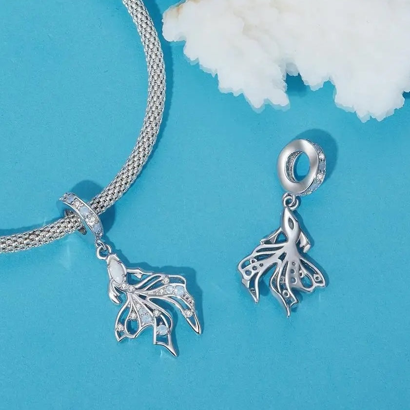 This opal fish charm for bracelets is the perfect addition to your collection. Made with genuine synthetic opal and sparkling cubic zirconia gemstones on a solid sterling silver base with platinum plating, this charm is sure to add a touch of elegance and uniqueness to any bracelet.