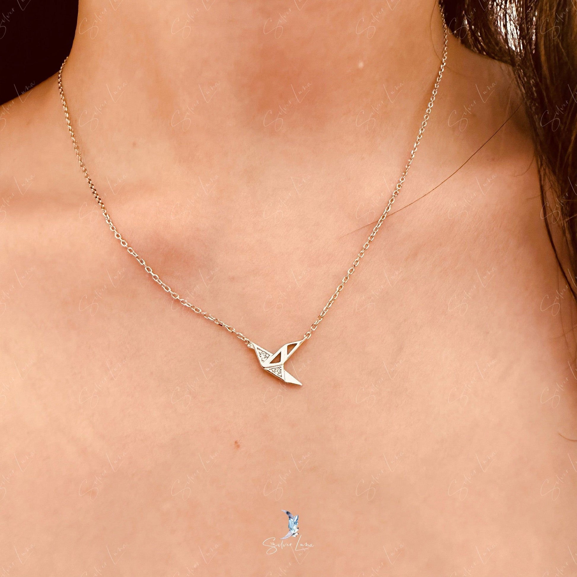 This cute dainty paper crane necklace features simple origami paper crane pendant on cable necklace, made of solid 925 sterling silver. Unleash your inner creativity and add a touch of elegance to any outfit with this stunning origami paper crane pendant necklace. Handcrafted with solid 925 sterling silver, it's the perfect accessory for any occasion.