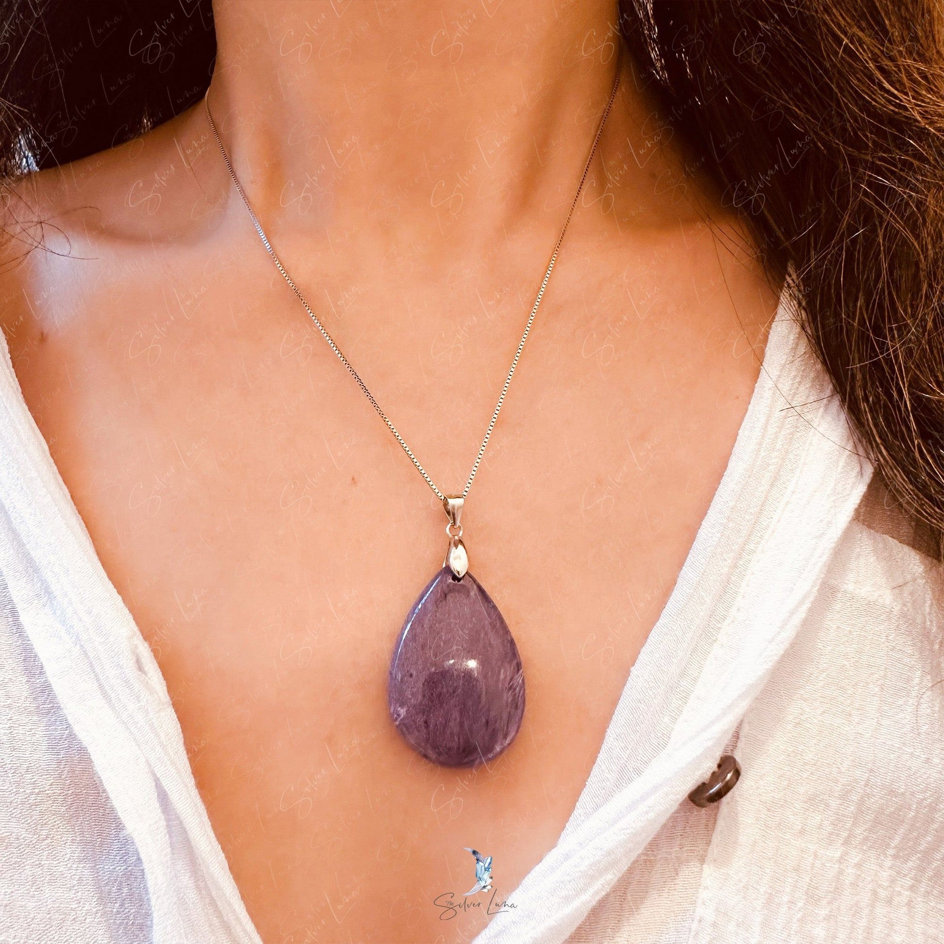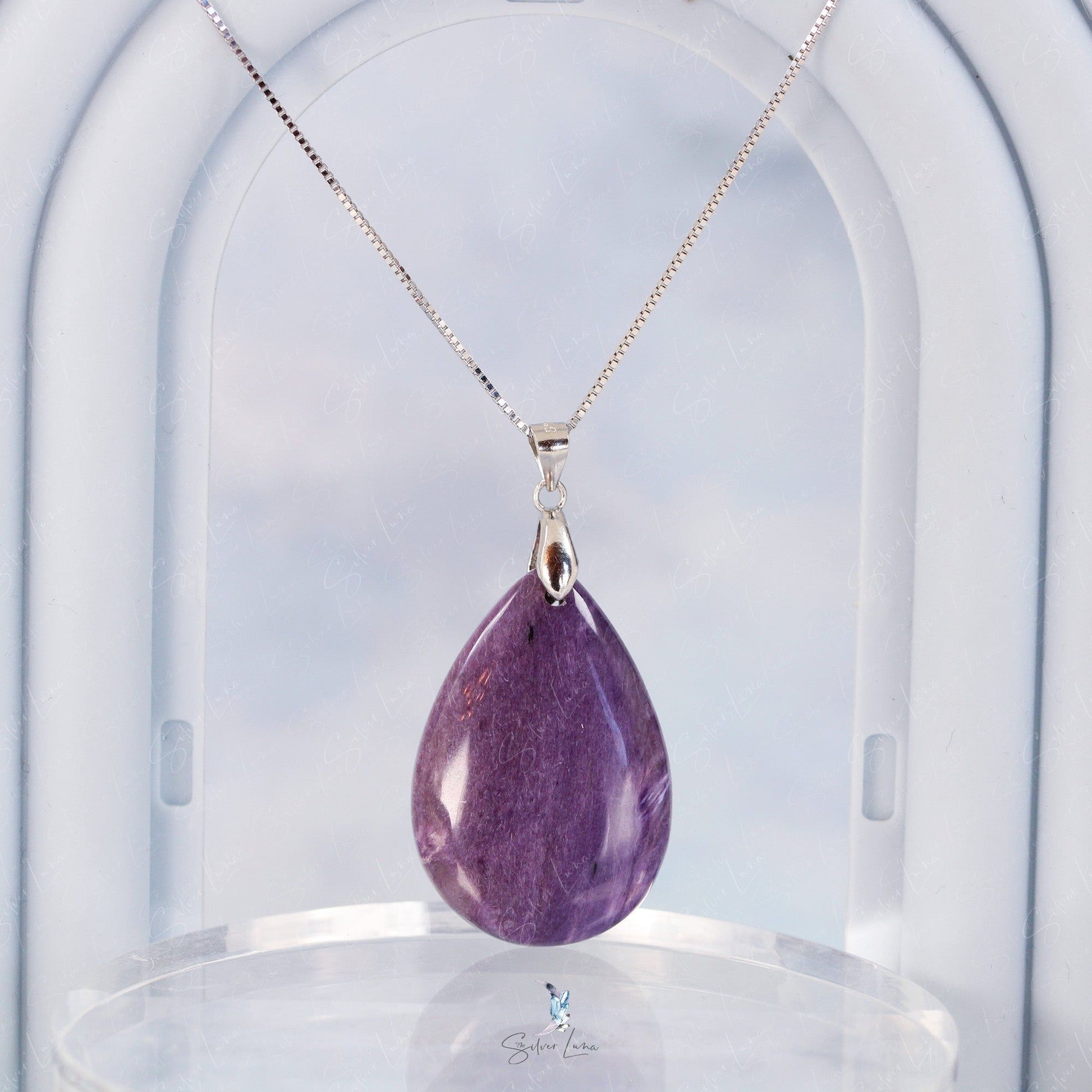 Let this captivating purple Charoite pendant necklace be your soul stone, creating a sense of courage and overcoming fears. The stunning natural stone Charoite boasts a striking purple hue with intricate marbling texture. Suspended on a 925 sterling silver box chain with a secure 925 sterling silver hook, this necklace exudes elegance and positivity. Plus, Charoite's unique ability to transmute negative energy into healing makes this necklace a must-have for any jewelry collection.