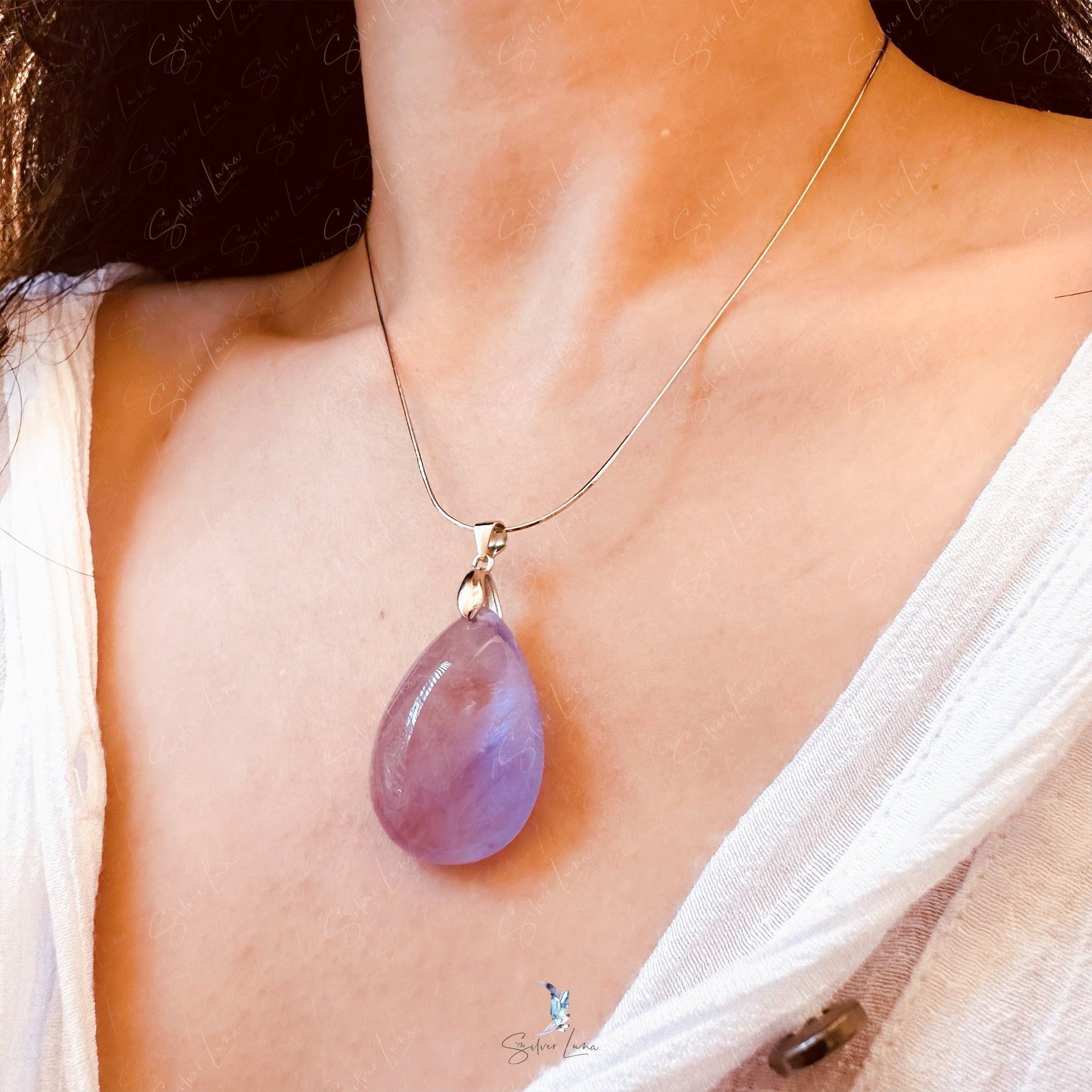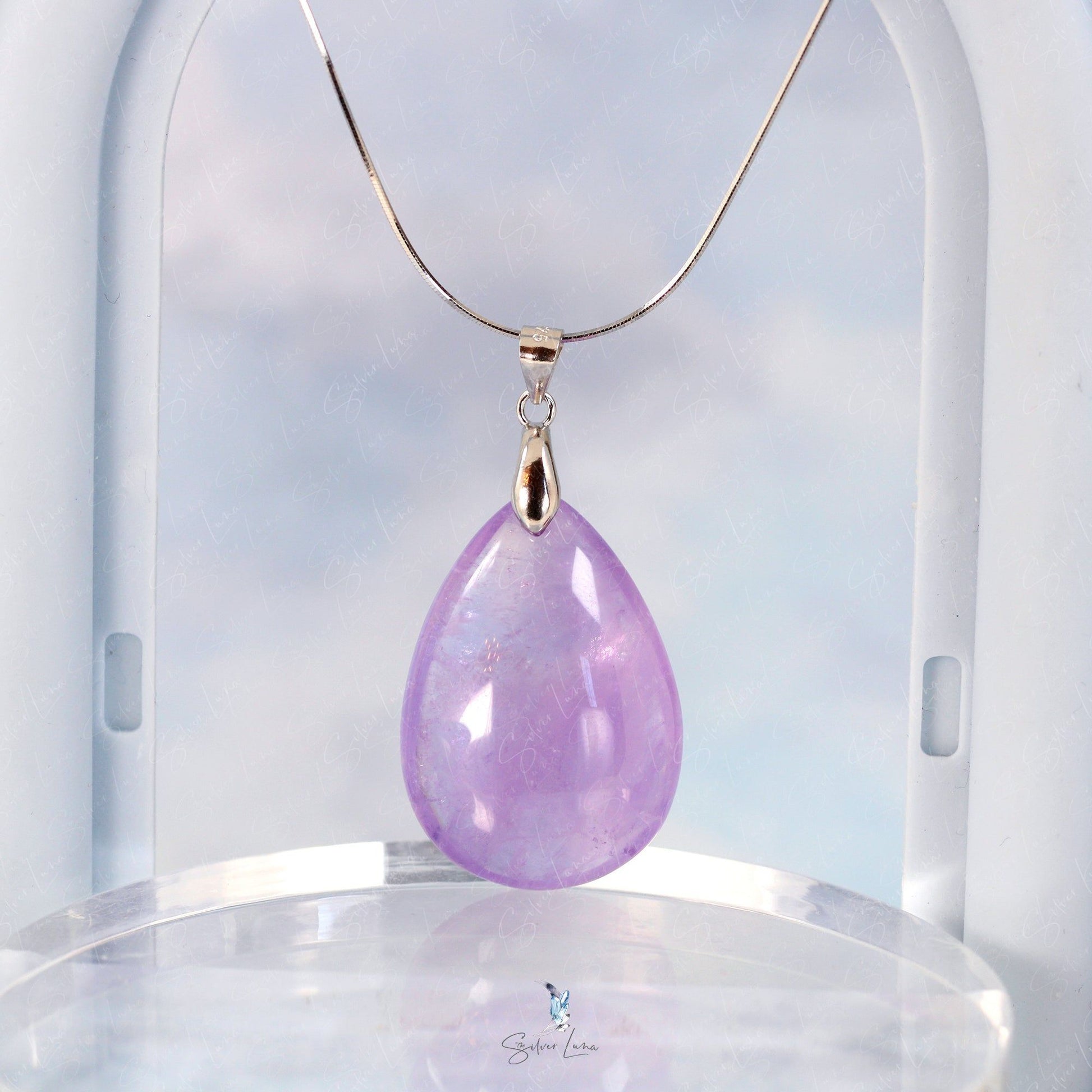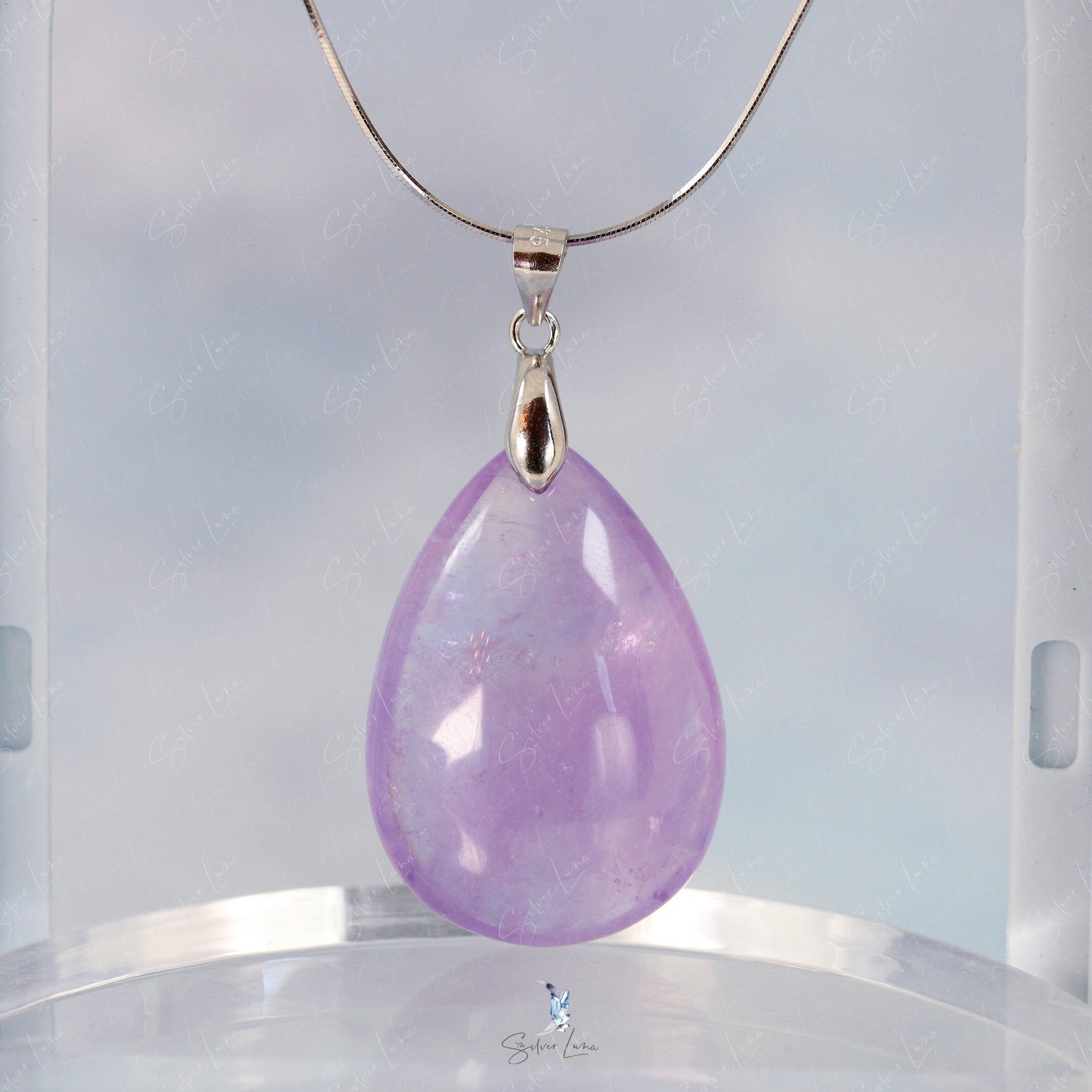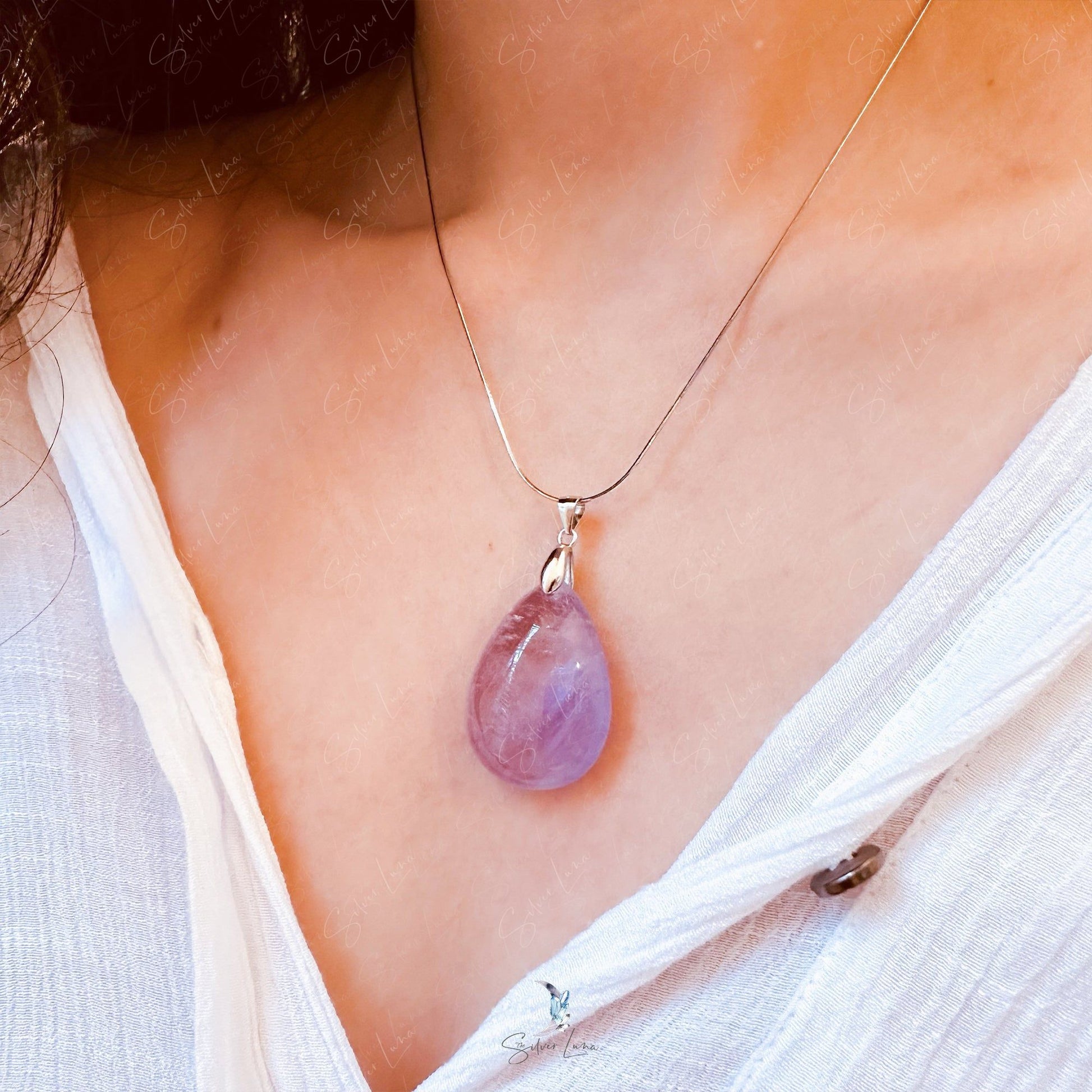 Experience the power and protection of this stunning Amethyst teardrop pendant necklace. The large natural stone in a beautiful purple hue hangs on a 925 sterling silver snake chain with a matching 925 sterling silver hook. Let the high spiritual vibration of Amethyst transmute your energy into pure love. Say goodbye to psychological stress, headaches, and tension with this must-have accessory.