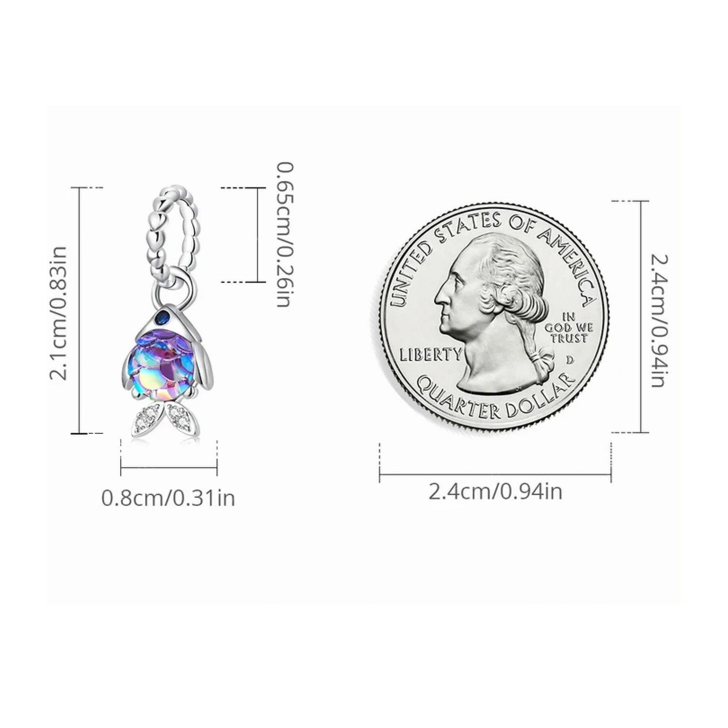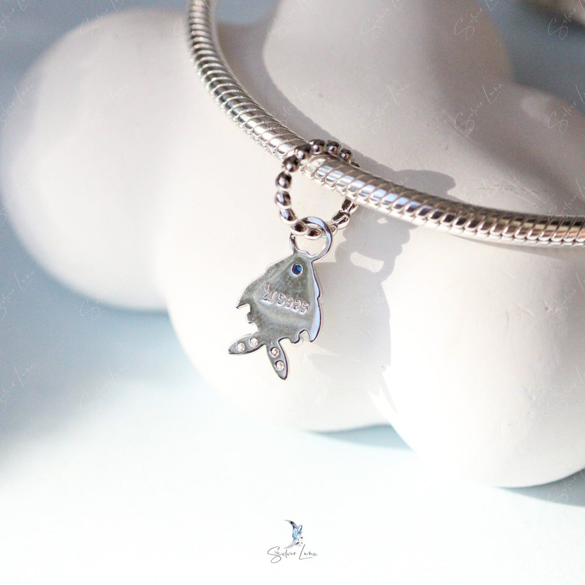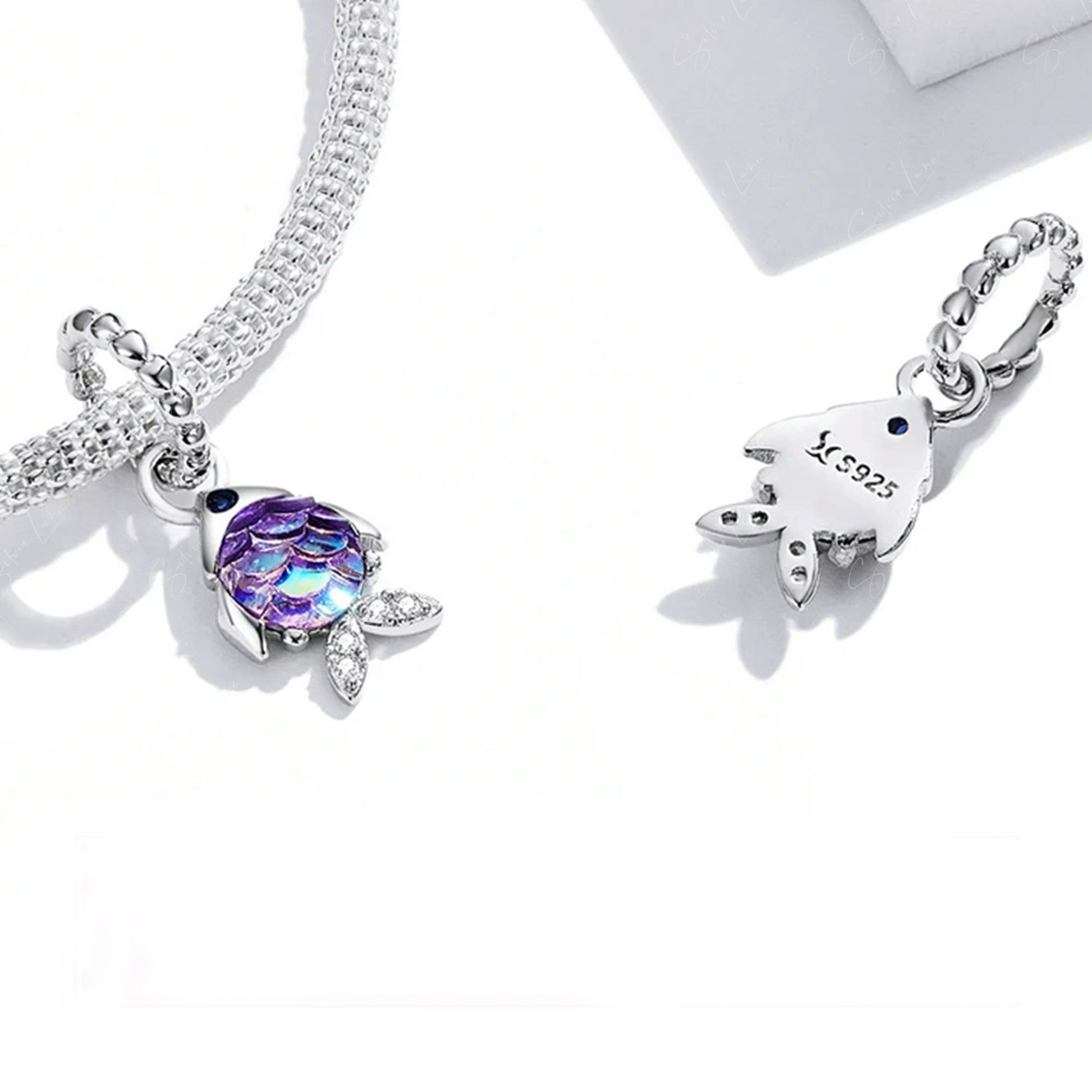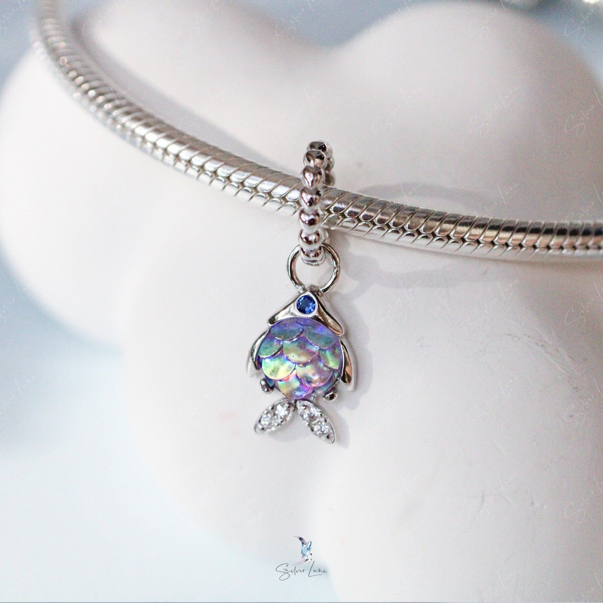 The cute rainbow fish dangle pendant charm is made of solid 925 sterling silver with platinum plating, rainbow color resin fish scales to create luminous shine and dazzling effect. Add these cute rainbow fish charm to your existing. Dive into a world of vibrant color and shimmer with our solid sterling silver rainbow fish charm. Its platinum plating and luminous resin scales create a dazzling effect that will elevate any bracelet. Add a touch of ocean-inspired beauty to your existing collection with these charming fish pendants.