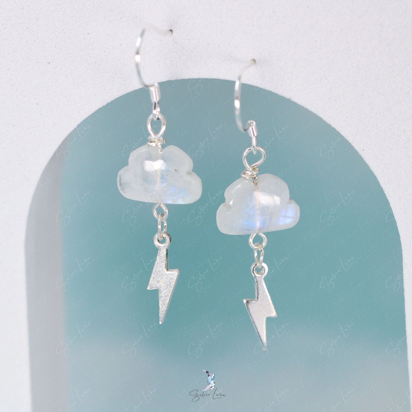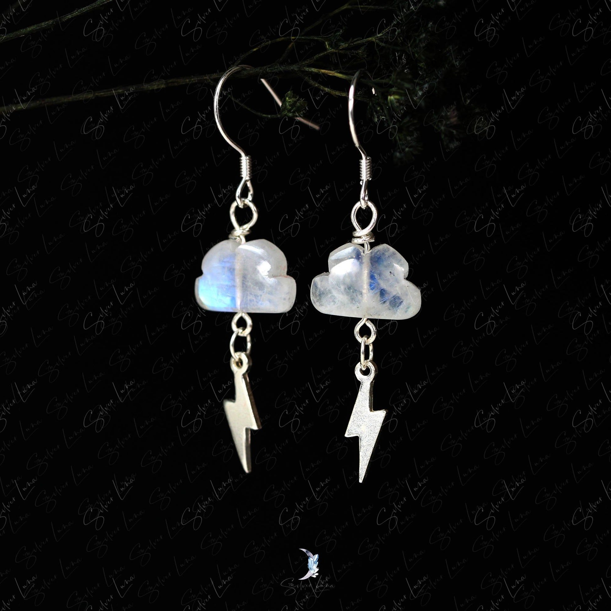 Indulge in the unique beauty of these moonstone cloud and lightning dangle drop earrings. Crafted with stunning rainbow moonstone in a cloud shape and elegant sterling silver lightning, these earrings are the perfect addition to any fine jewelry collection. Made with 925 sterling silver ear wires and eye pins, they are sure to impress anyone who receives them as a gift. Make a statement and show your love with these one-of-a-kind earrings.