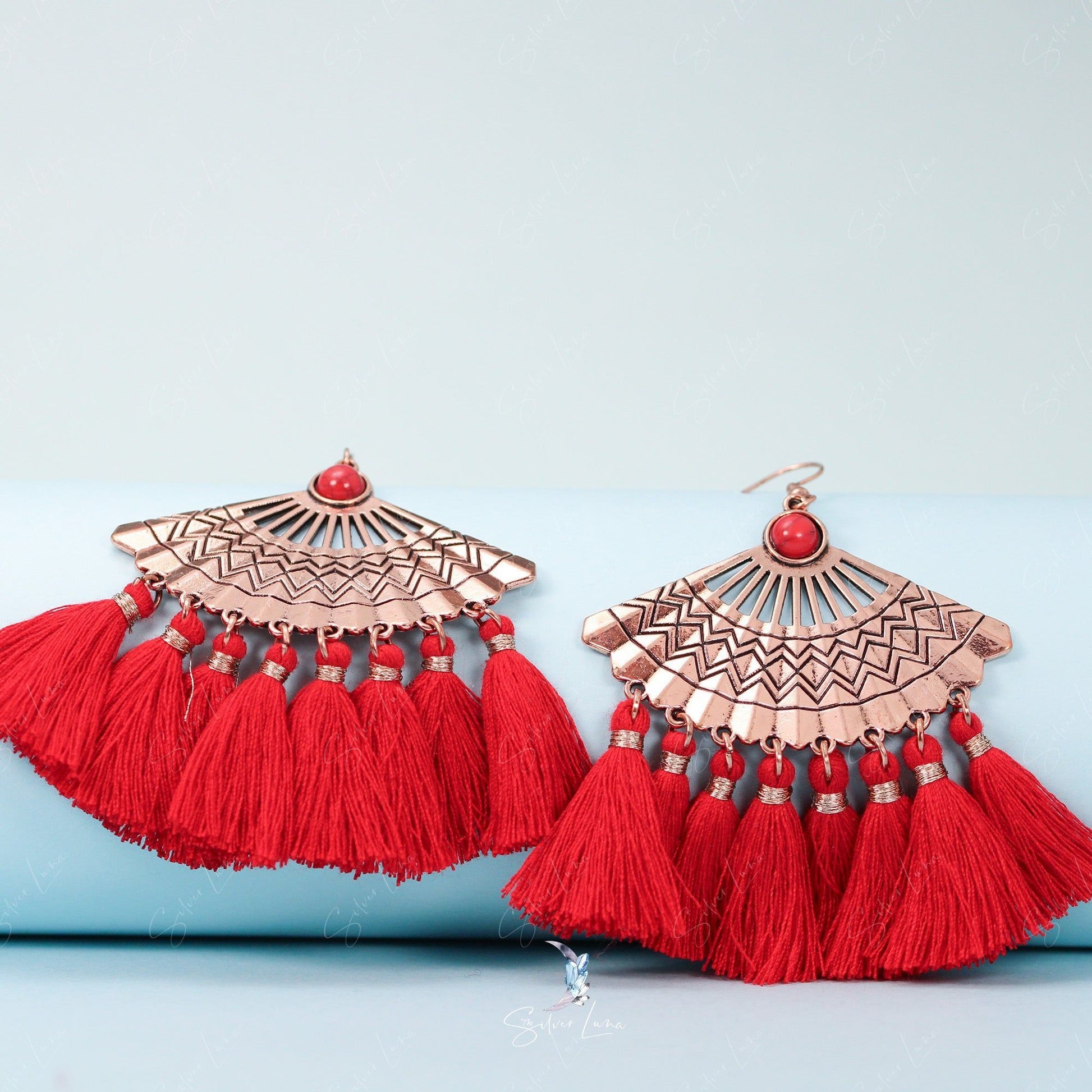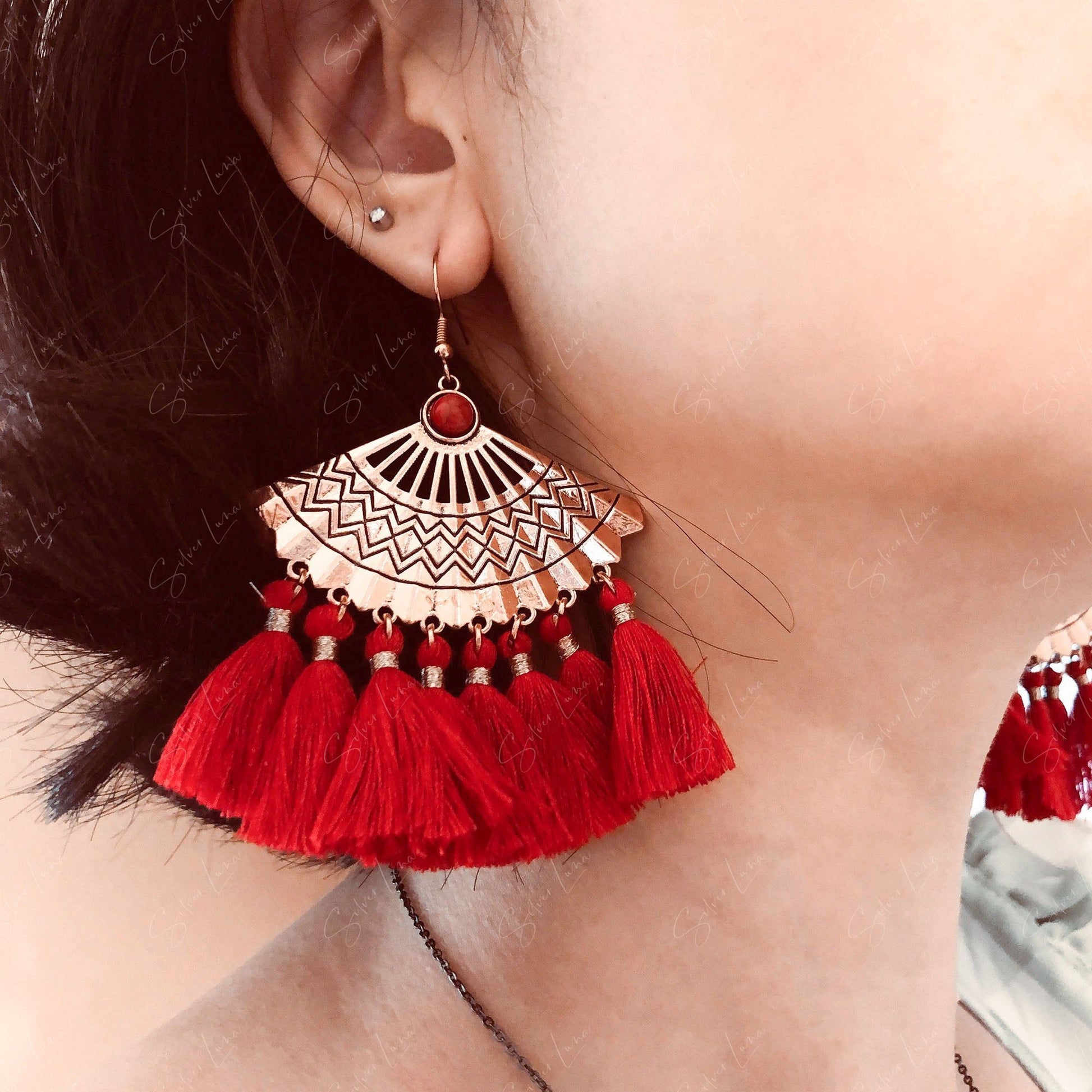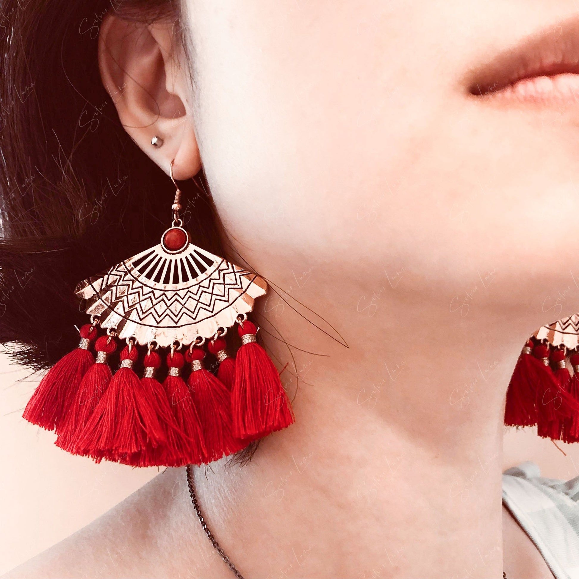 These unique bohemian fan tassel earrings feature red fan tassel on metal fan charm. Add these unique boho fan tassel dangle drop statement earrings to your everyday fashion earrings collection or as gift for your love one.