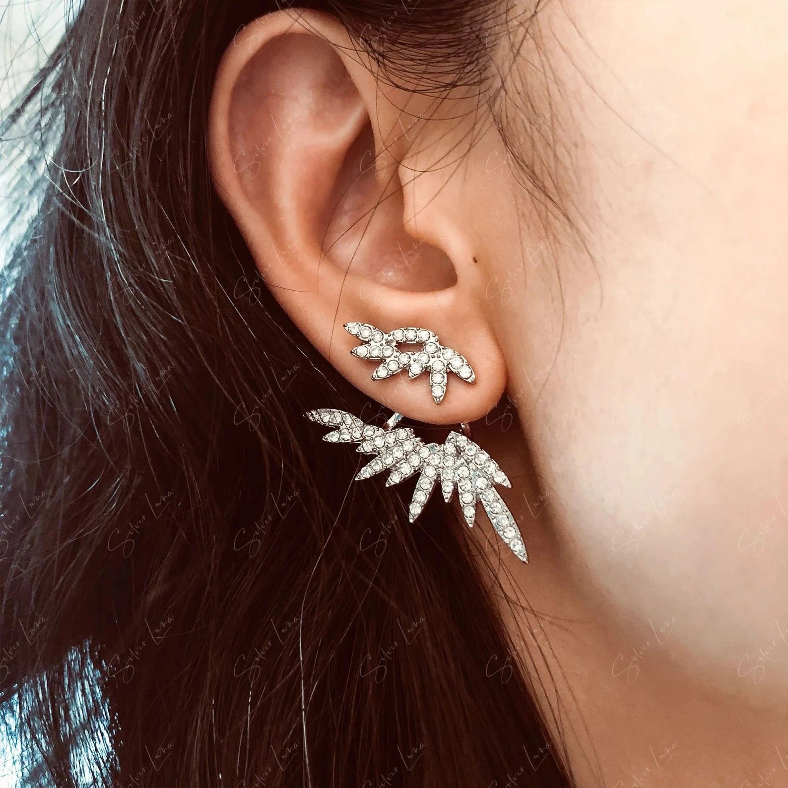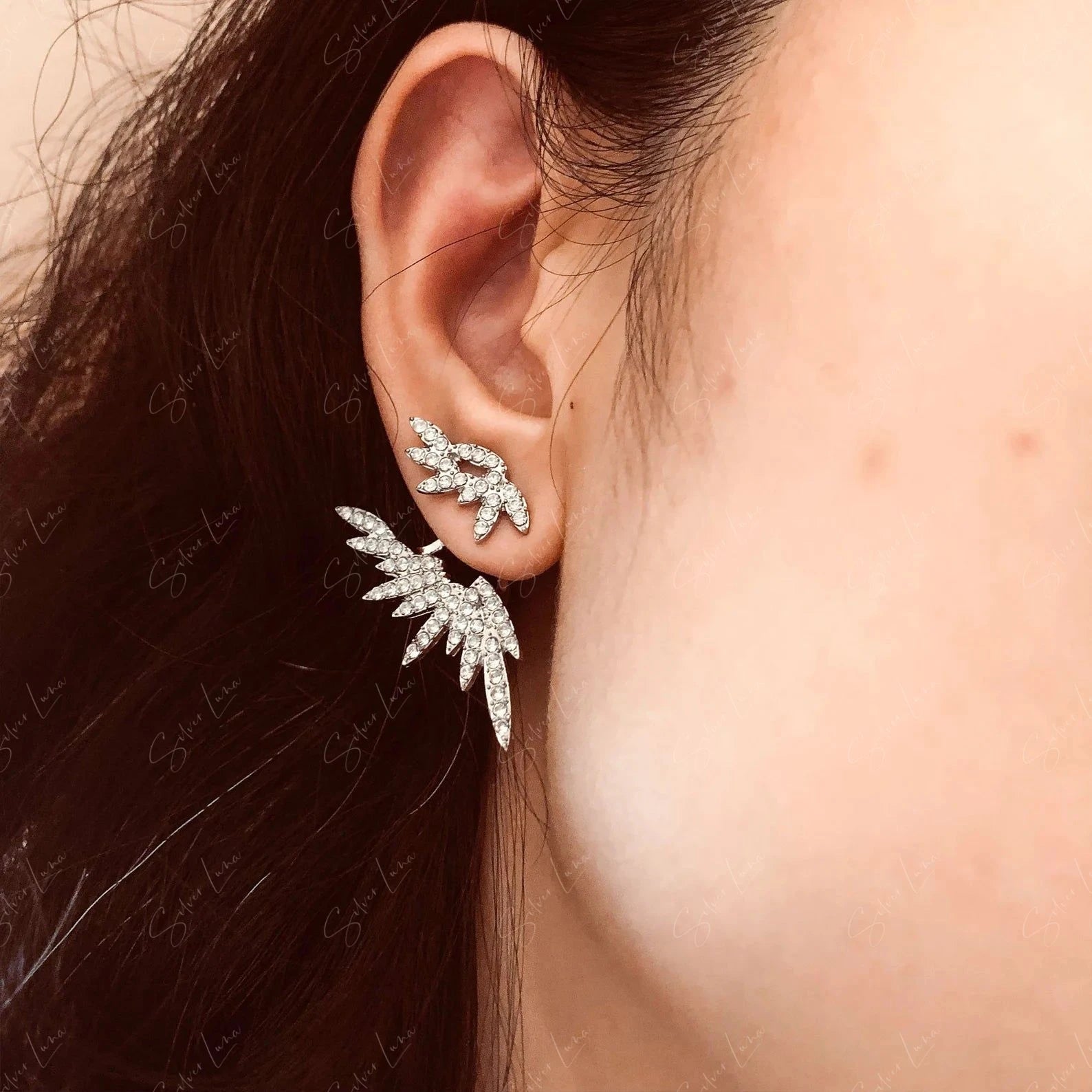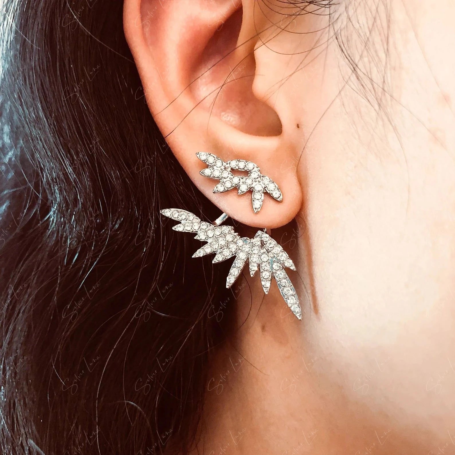 These beautiful ear jacket earrings features an angel wing shape with crystal rhinestone pave to maximum light reflection. The design is elegant, modern, luxury and has a unique statement. Add these angel wing ear jacket earrings to your everyday fashion jewelry collection or as gift for your love one.