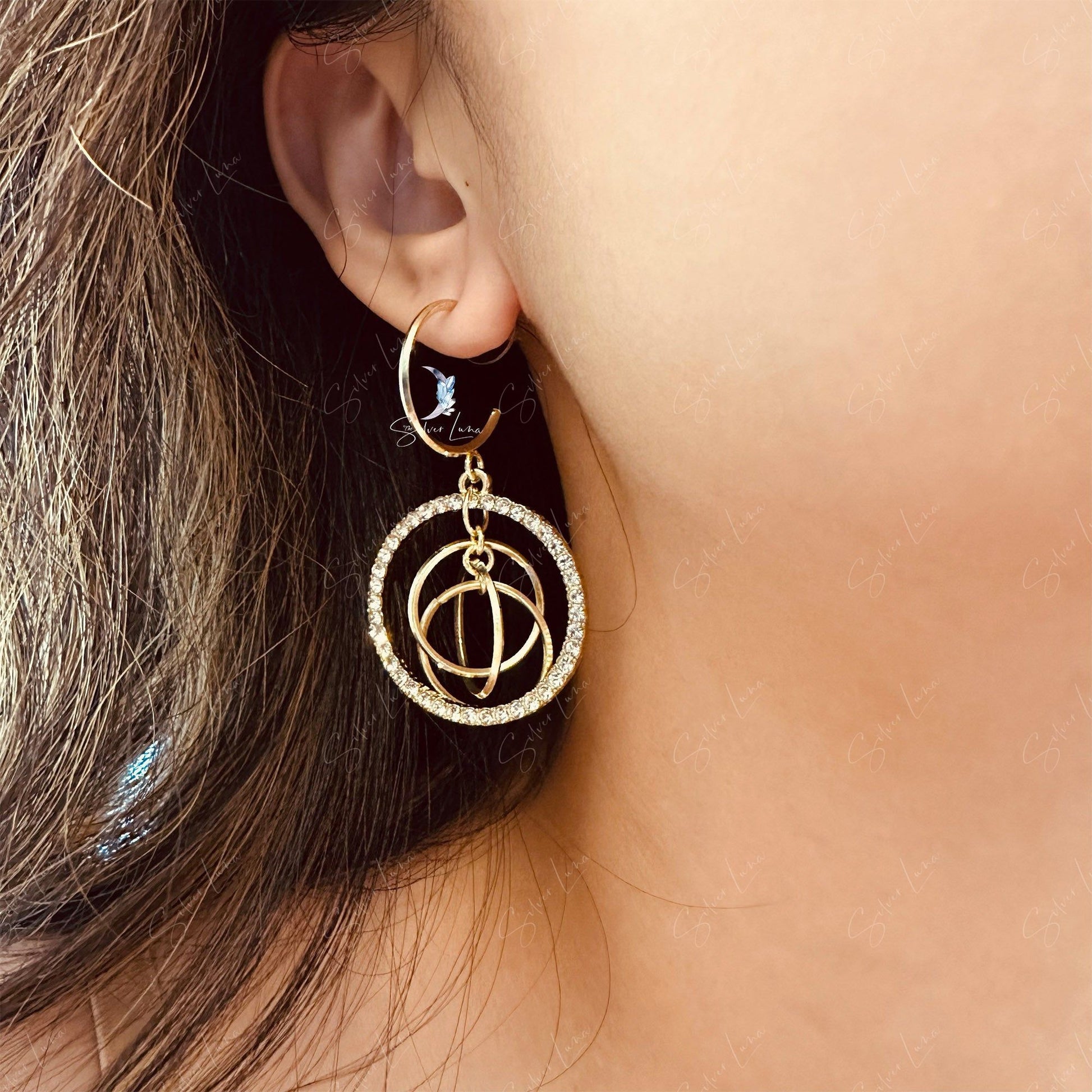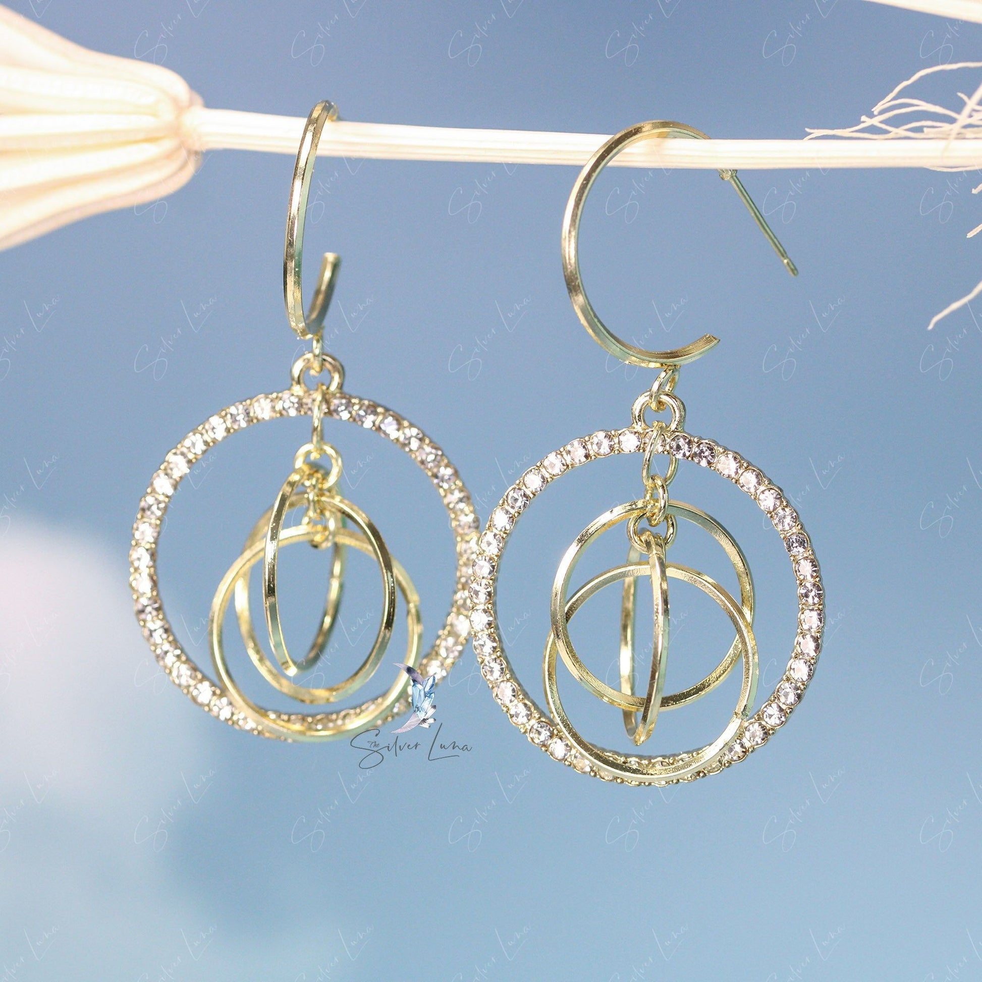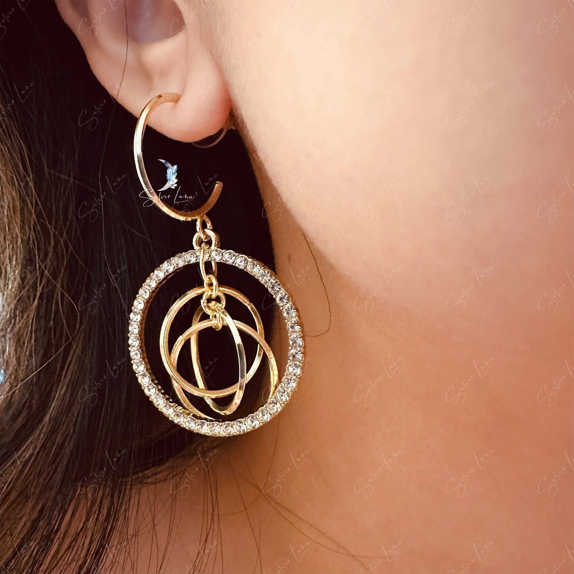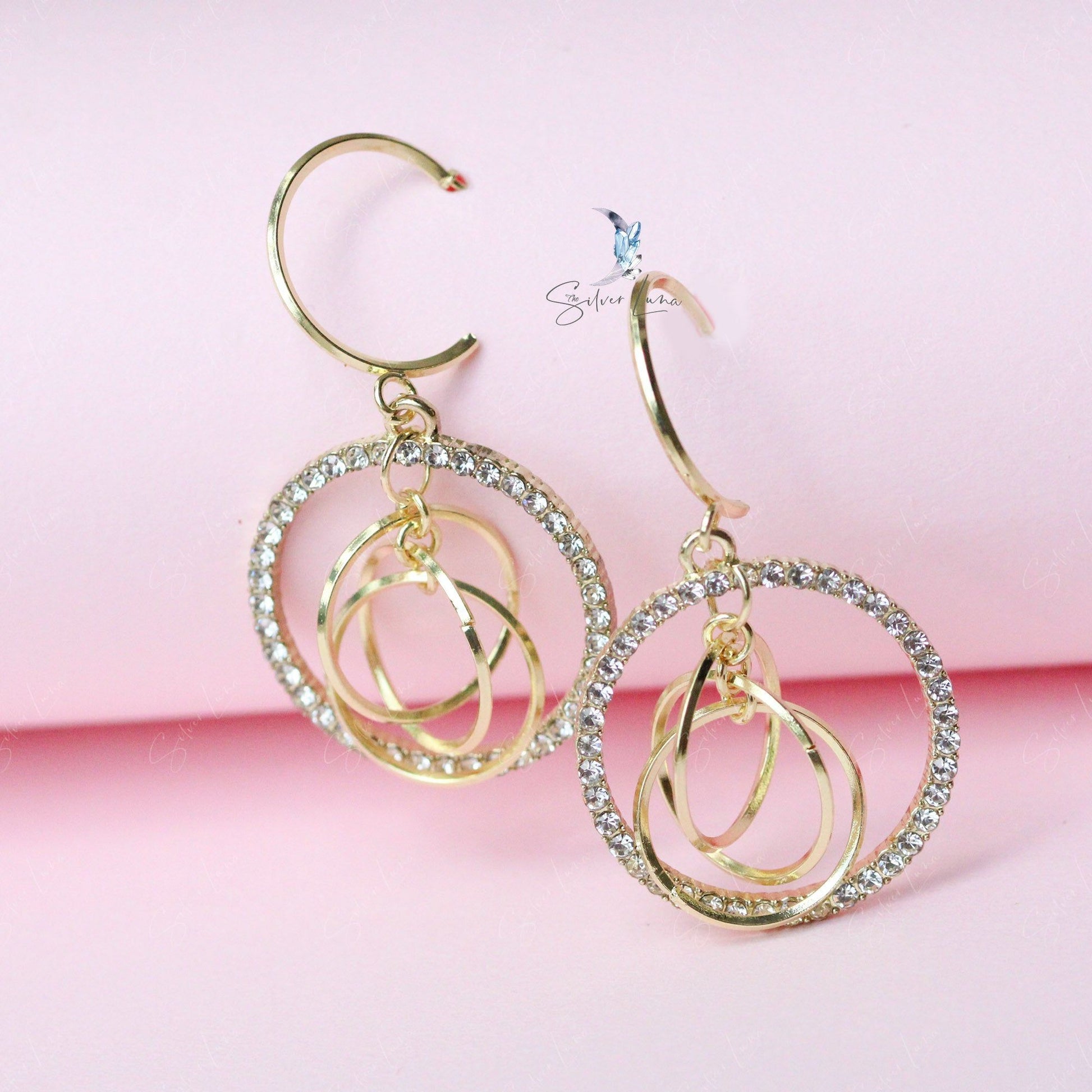 This abstract circles fashion dangle drop earring has a unique statement, features a beautiful crystal stones circles and golden dangle rings which have a nice sound when moving. The design is simple, abstract, modern, and elegant. Wear these fashion statement earrings with your favorite outfit and shine all day long. It's light weight and comfortable to wear.