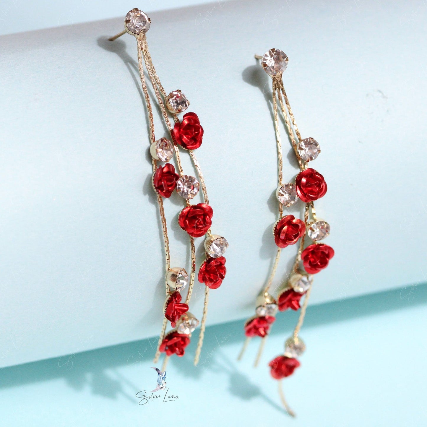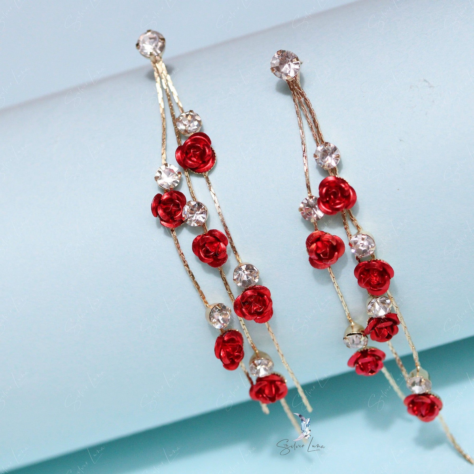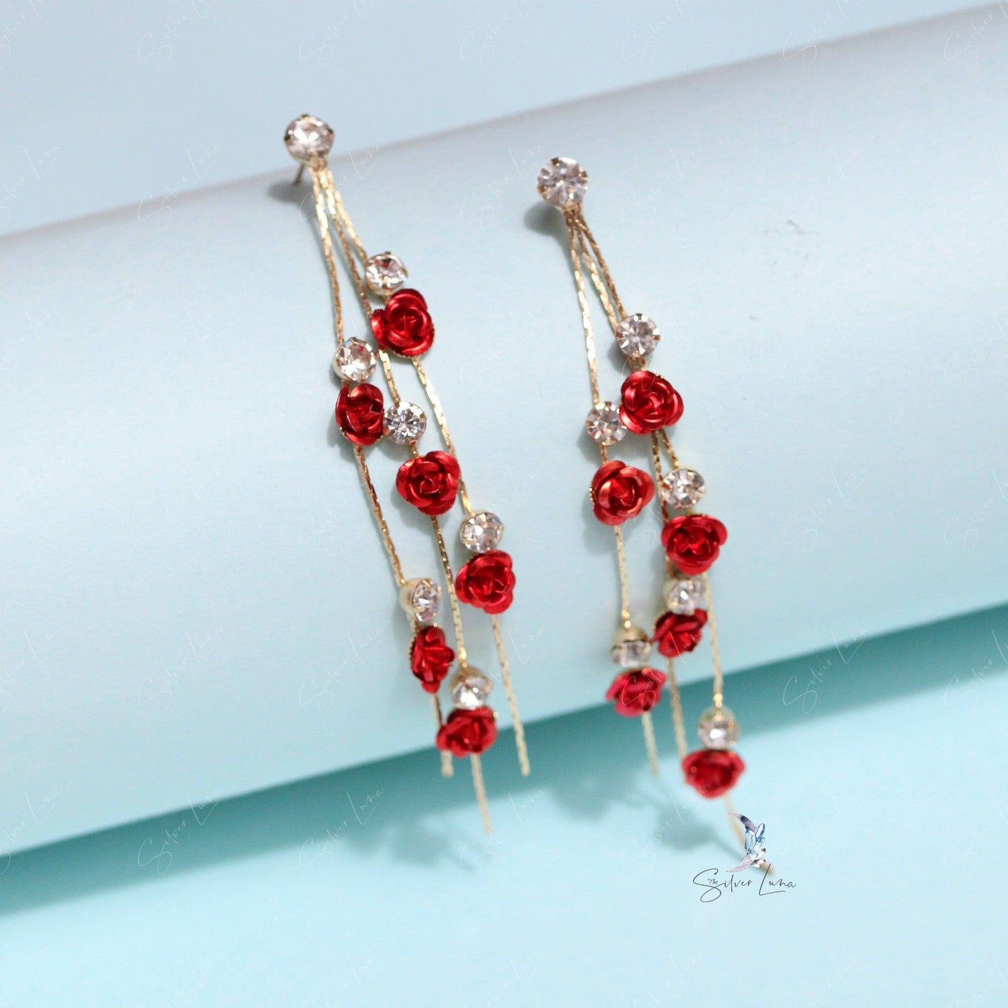 These rose flower dangle drop fashion earrings are elegant in its design, features long trail of red rose flower and crystal rhinestones. Add these romantic red rose flower dangle drop earrings to your everyday fashion jewelry collection or as gift for your love one.