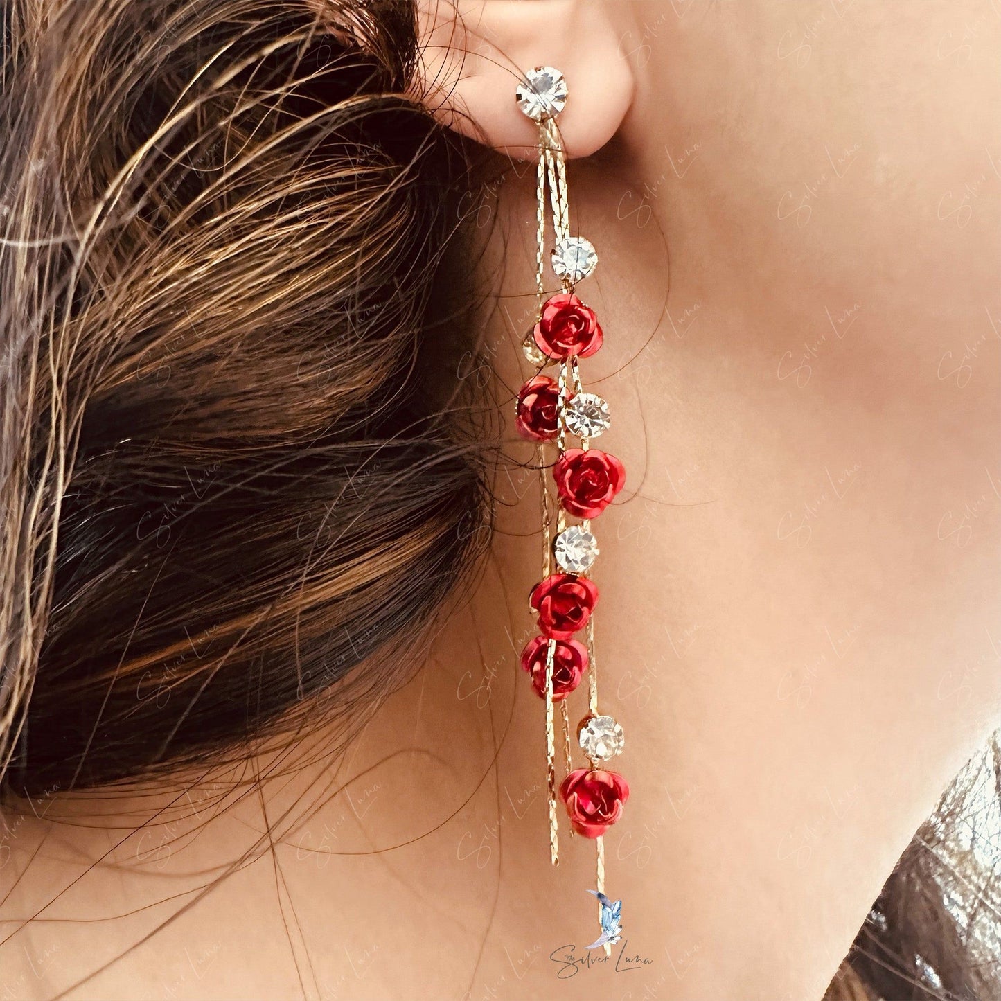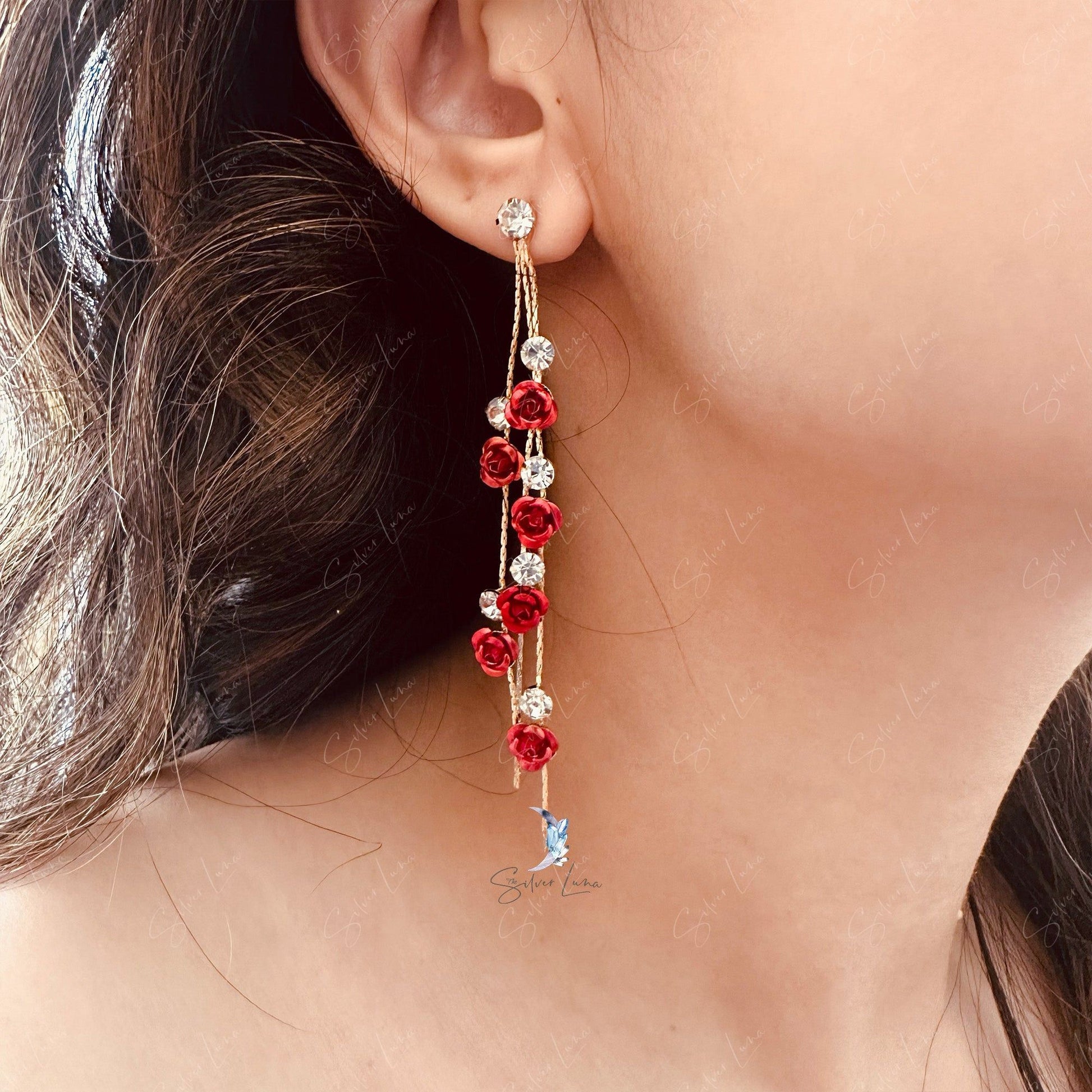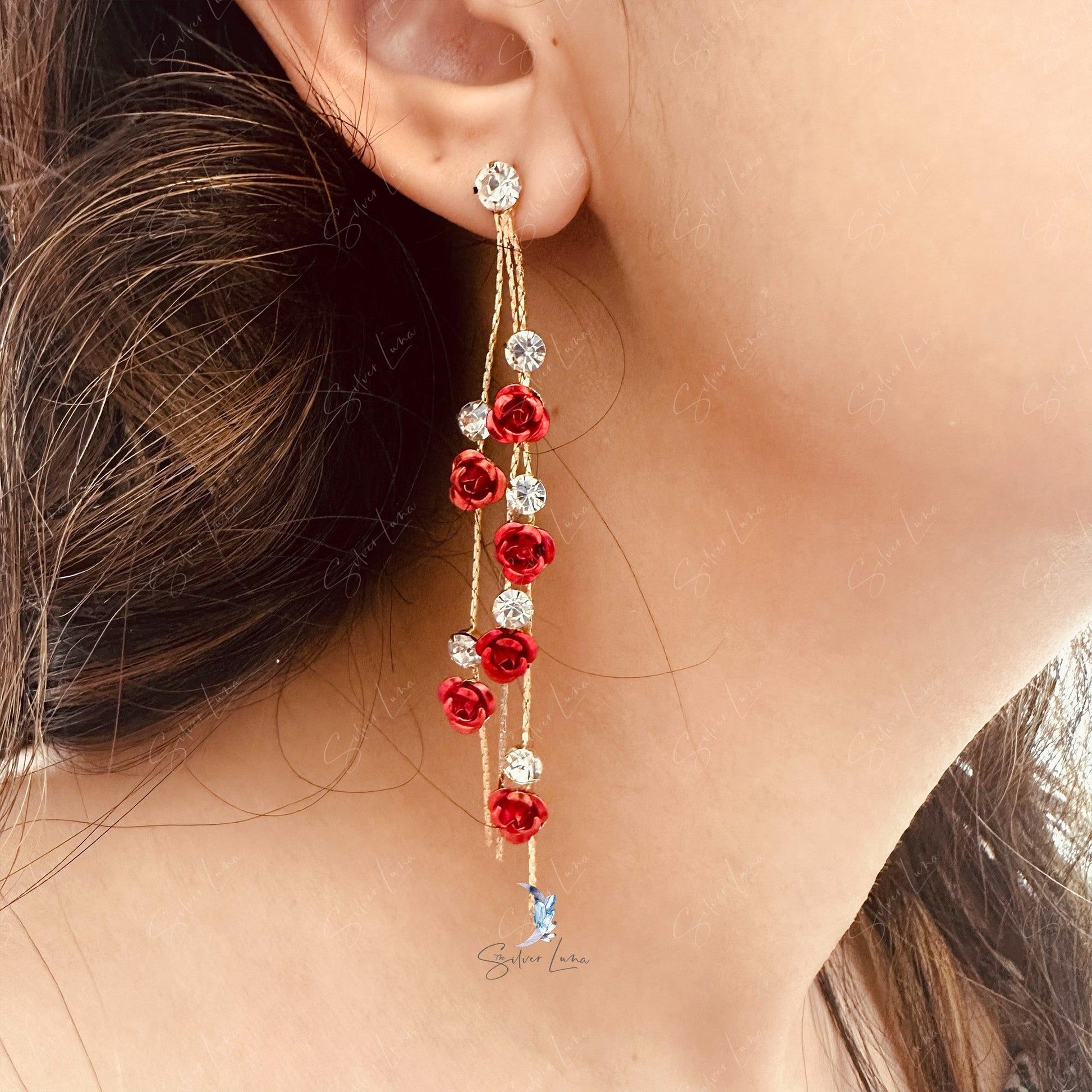 These rose flower dangle drop fashion earrings are elegant in its design, features long trail of red rose flower and crystal rhinestones. Add these romantic red rose flower dangle drop earrings to your everyday fashion jewelry collection or as gift for your love one.