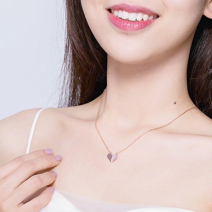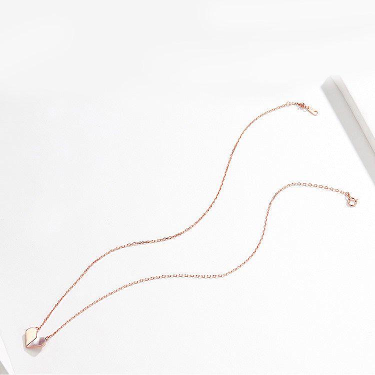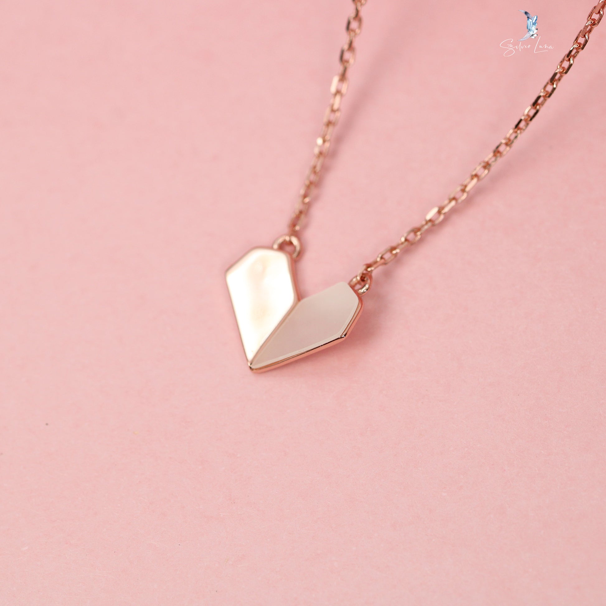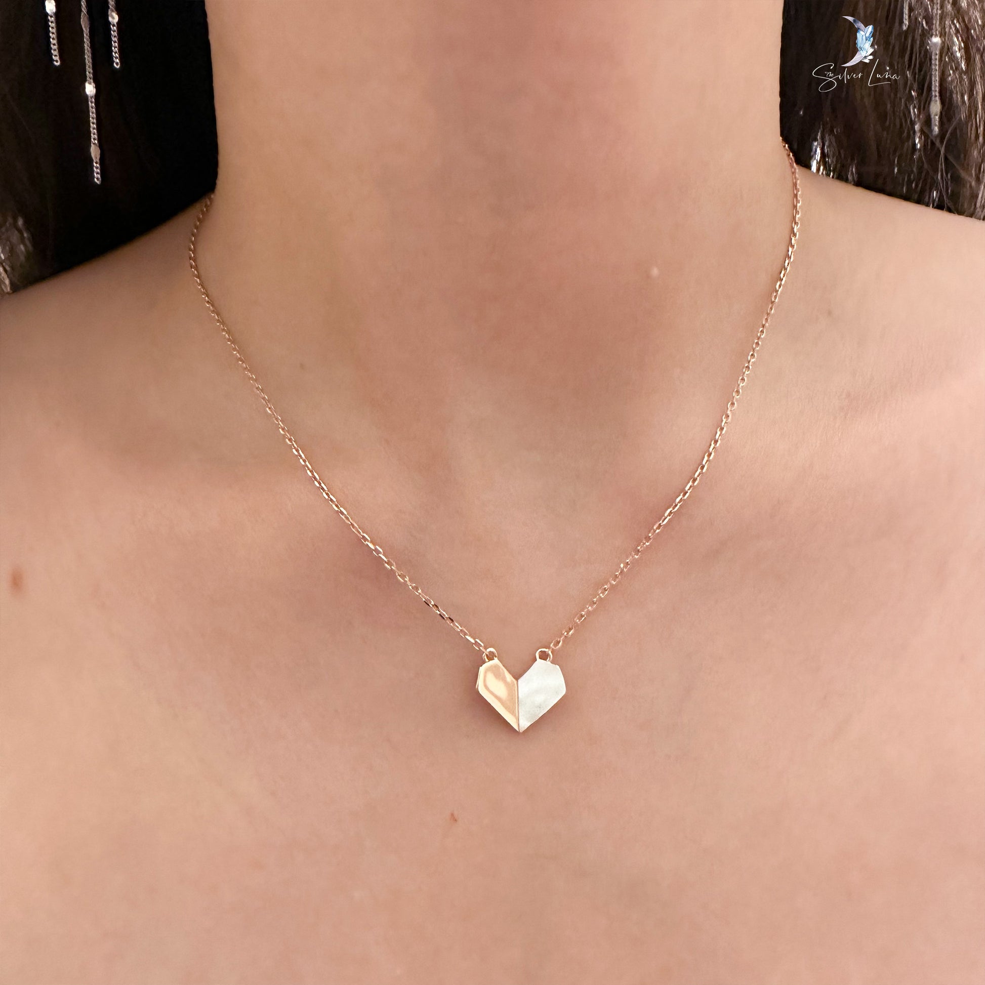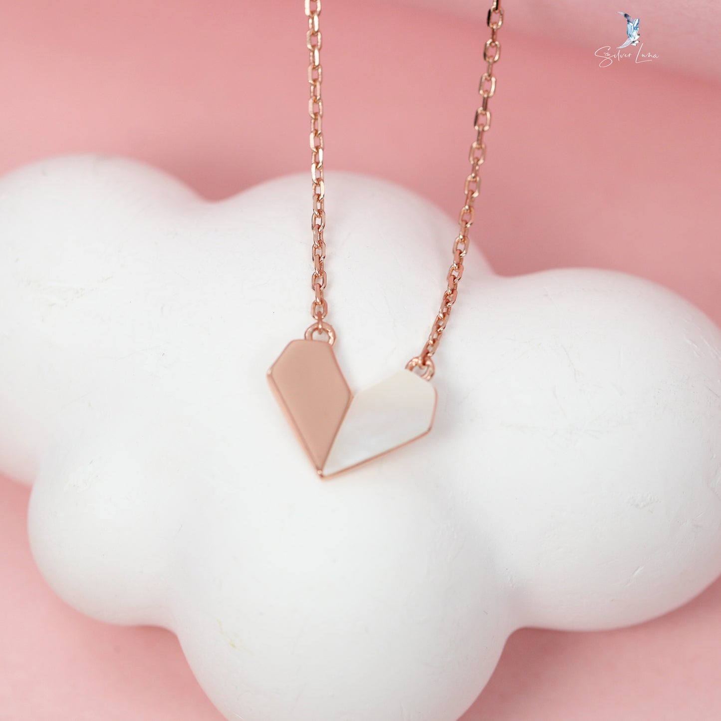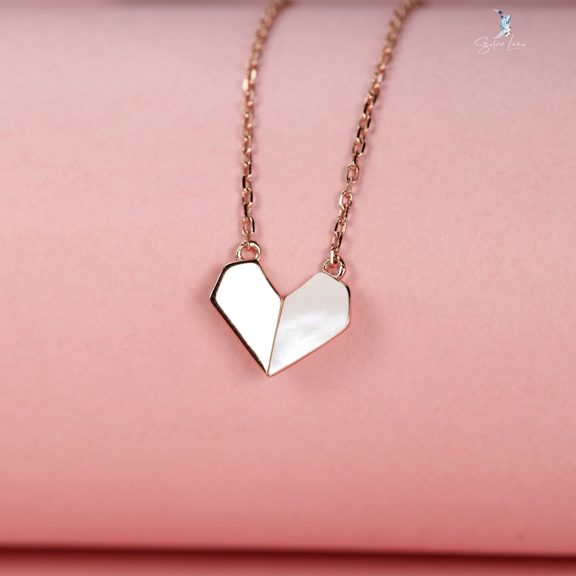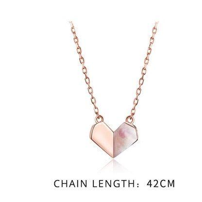 This dazzling and delicate heart necklace boasts a stunning rose gold geometric heart pendant, partially adorned with a luminous white shell. Crafted from high-quality 925 sterling silver and finished with a lustrous rose gold plating, this necklace is a must-have addition to any collection.