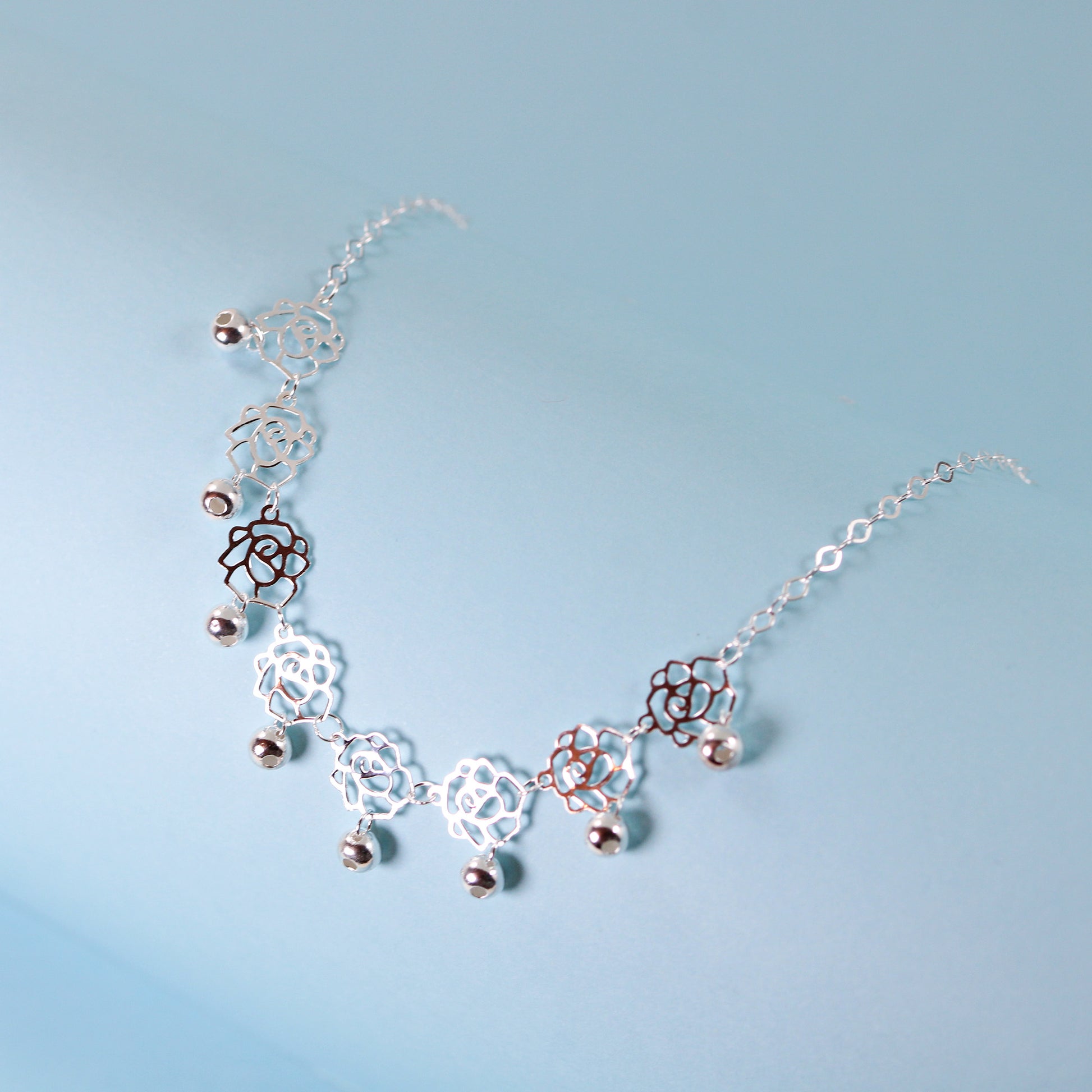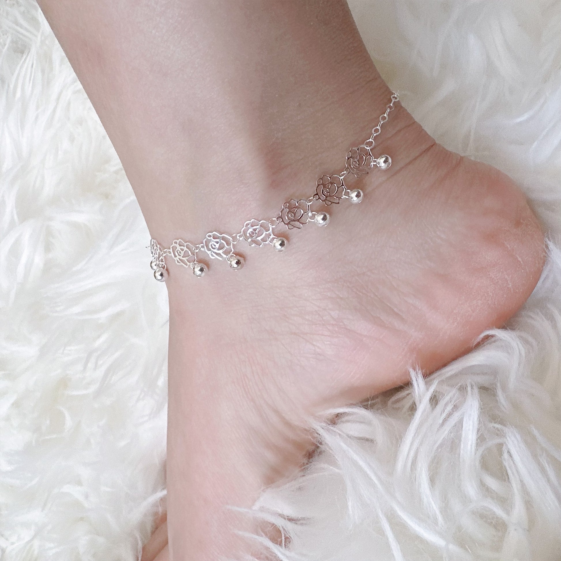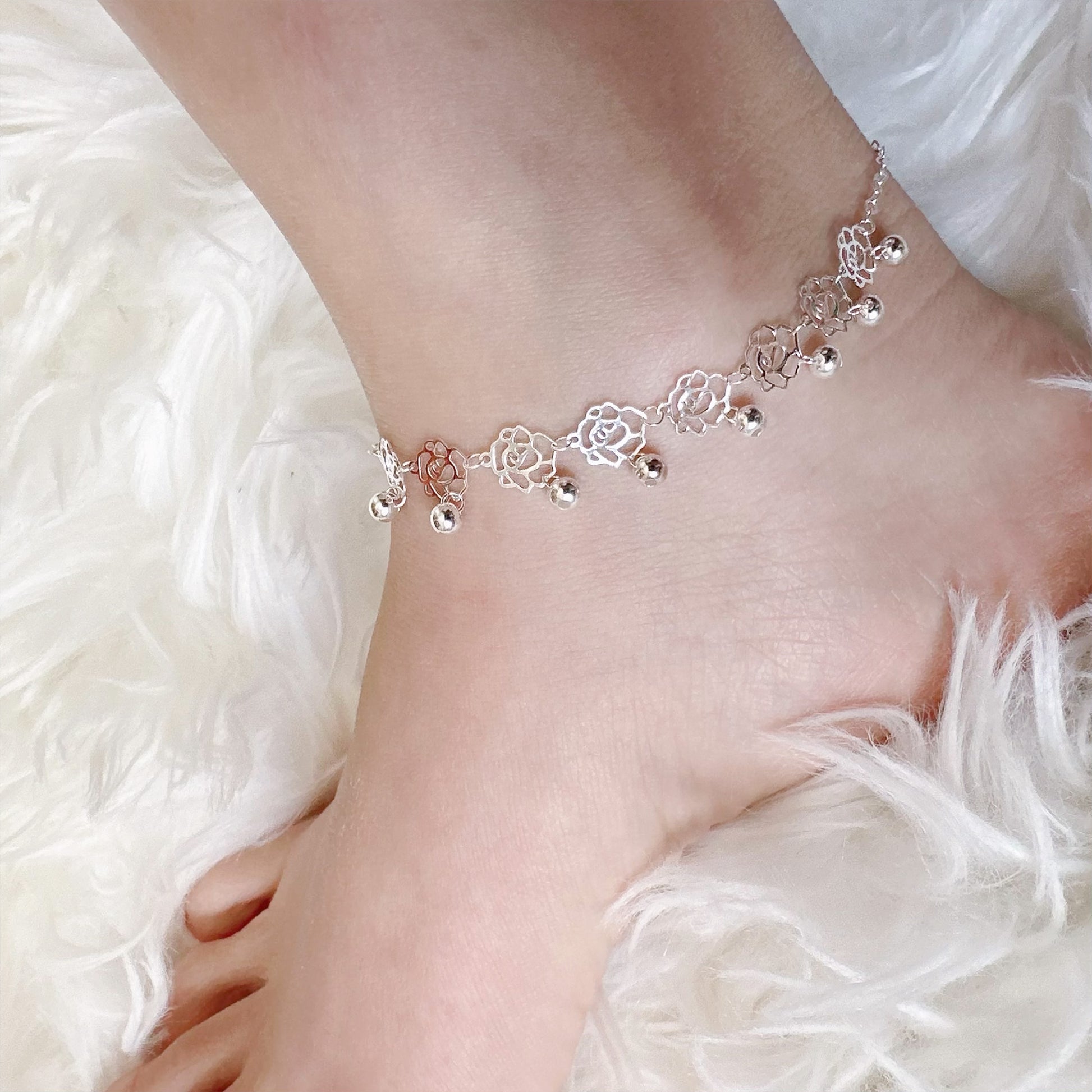 Elevate your style with our Rose with Balls Dangle Charms Sterling Silver Anklet. This beautiful accessory adds a touch of elegance, featuring a delicate rose charm with dangling silver balls. Perfect for any occasion, it's a must-have for any jewelry collection.
