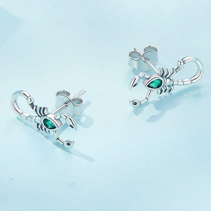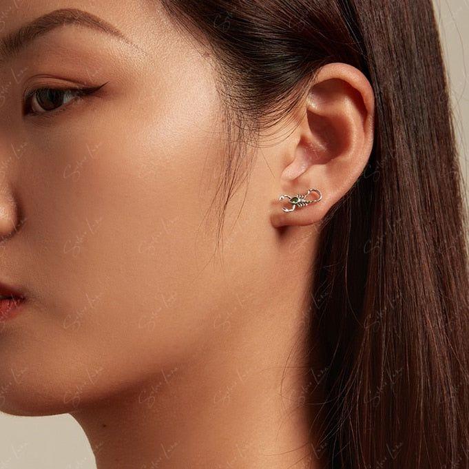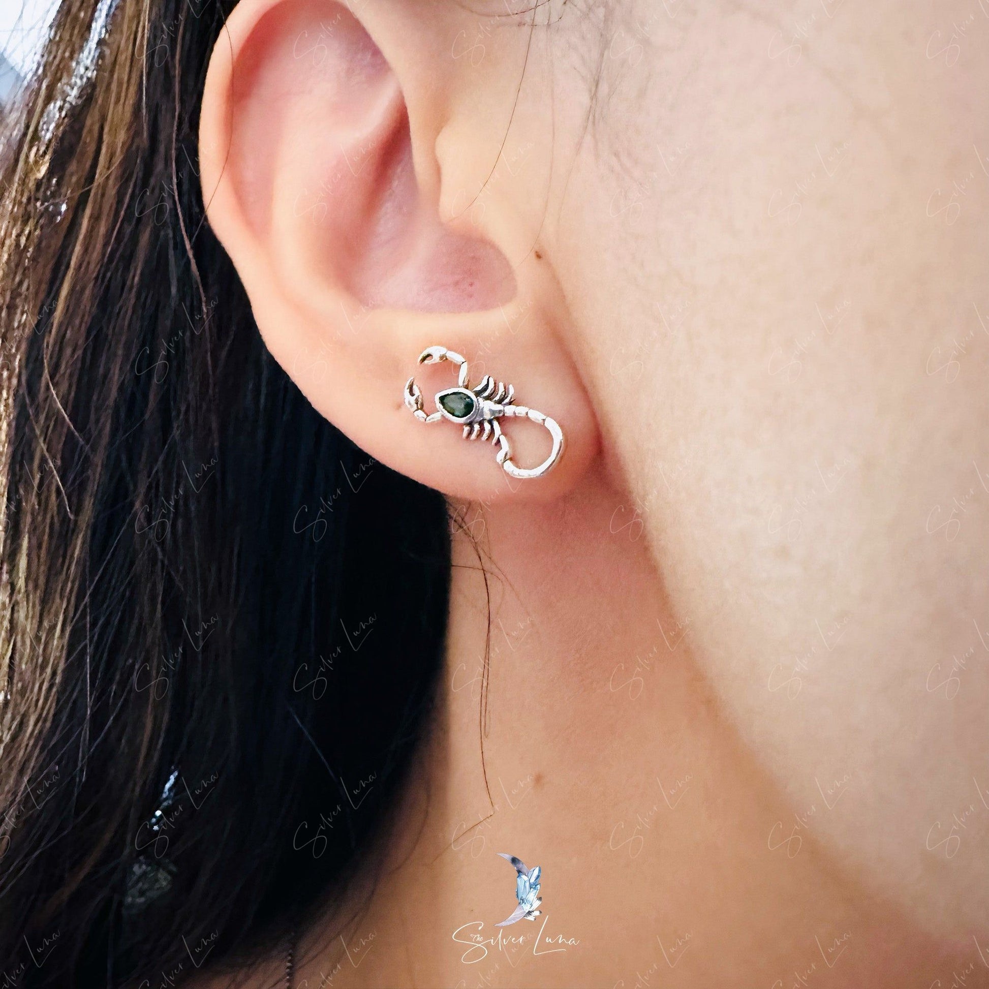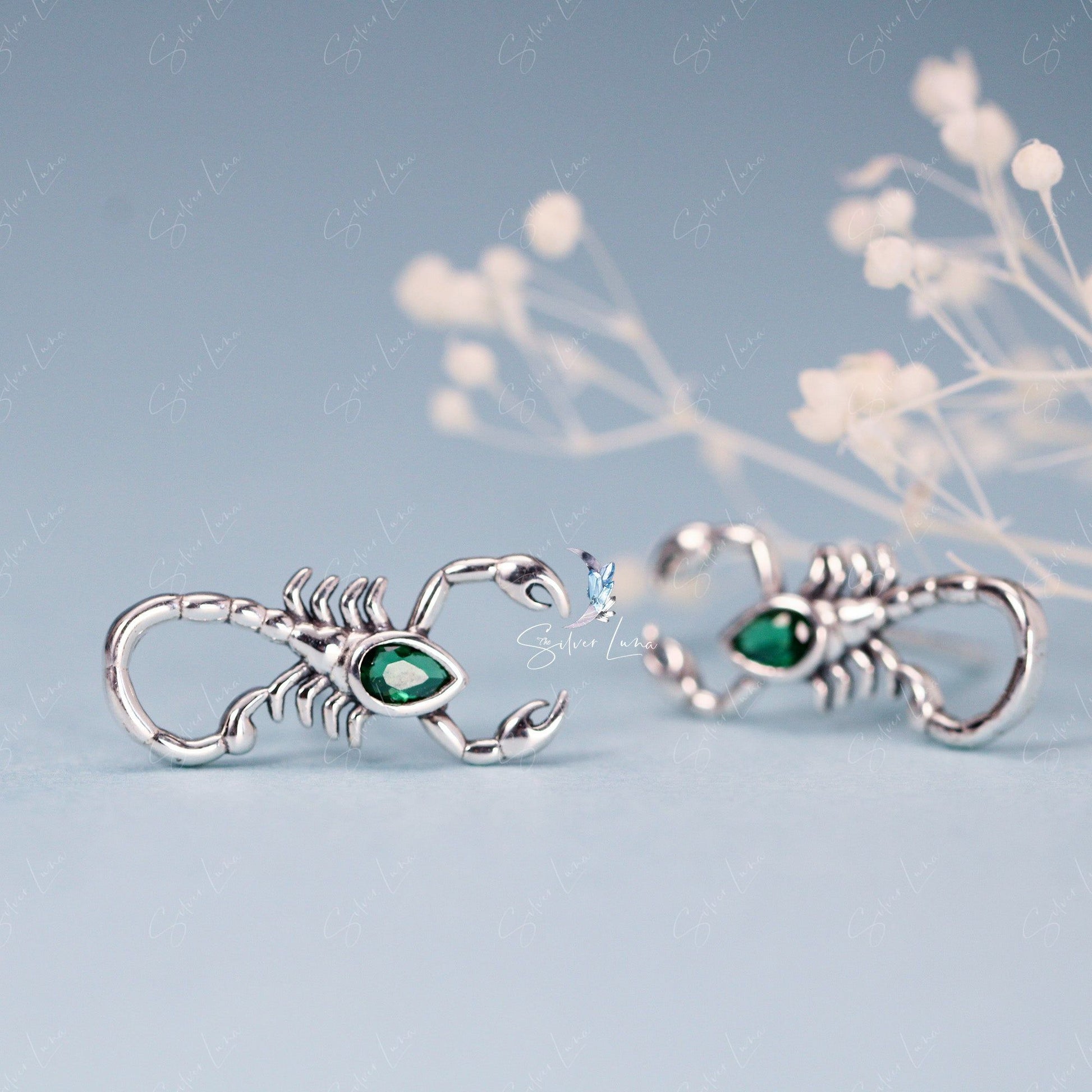 These gorgeous scorpion stud earrings boast a unique scorpion design adorned with green cubic zirconia. Made of solid 925 sterling silver and finished with platinum plating, these earrings add a touch of edgy elegance to any outfit. The intricate scorpion design showcases stunning green cubic zirconia and is expertly crafted from high-quality materials, perfect for elevating your style and making a bold statement. Upgrade your jewelry collection with these one-of-a-kind earrings